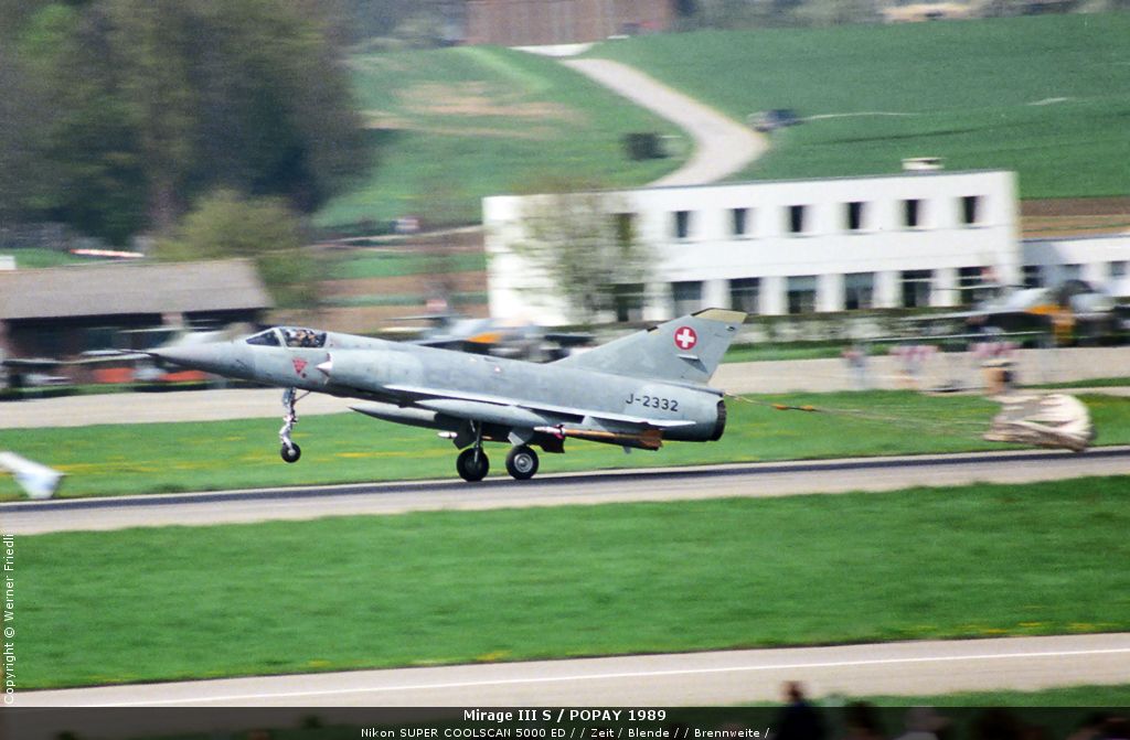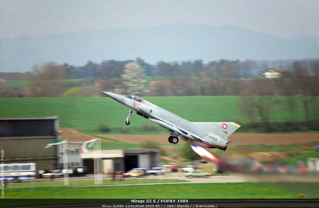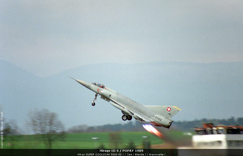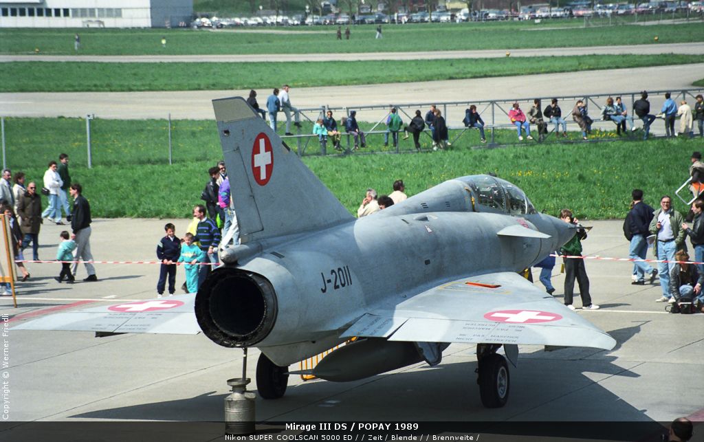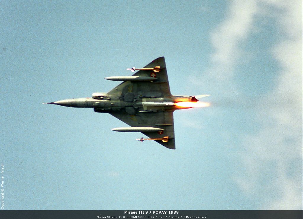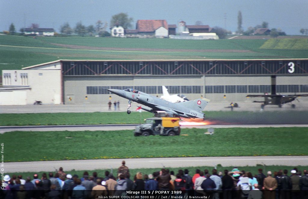 1989 war die Mirage IIIS die Speerspitze der Schweizer Fliegertruppen. Entsprechend wurde dieser Typ auch in verschiedenen Konfigurationen in der Luft gezeigt. Unter anderem wurde ein Start mit Hilfsraketen, sogenannten JATO’s gezeigt. Mit diesen Hilfsraketen brauchte die Mirage deutlich weniger Startstrecke und konnte so im Kriegsfall auch von behelfsmässig reparierten Pisten starten. Auch wurde der Raketenmotor SEPR präsentiert durch eine Mirage IIIS, welche unter eingeschaltetem Raketenmotor sehr tief über dem Publikum flog, was natürlich nicht dem Einsatzzweck entsprach. Der Raketenmotor war dazu gedacht, die Mirage IIIS im Ernstfall auf eine Höhe von maximal 20’000 Metern zu bringen, damit dort die Lenkwaffe AIM-26 Falcon gegen hochfliegende Bomber zum Einsatz gebracht werden konnte.
