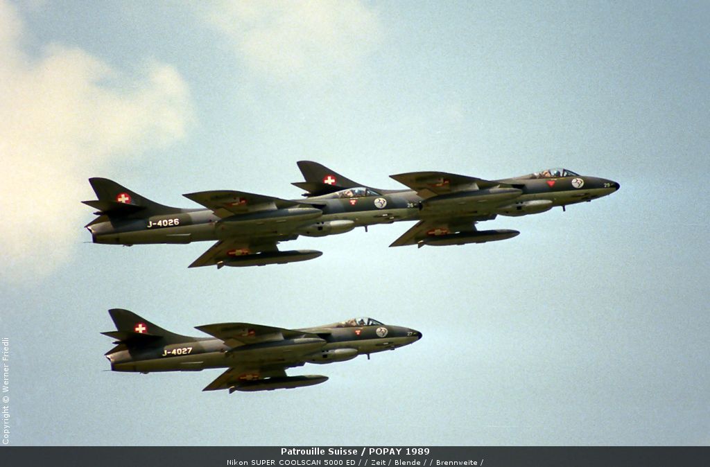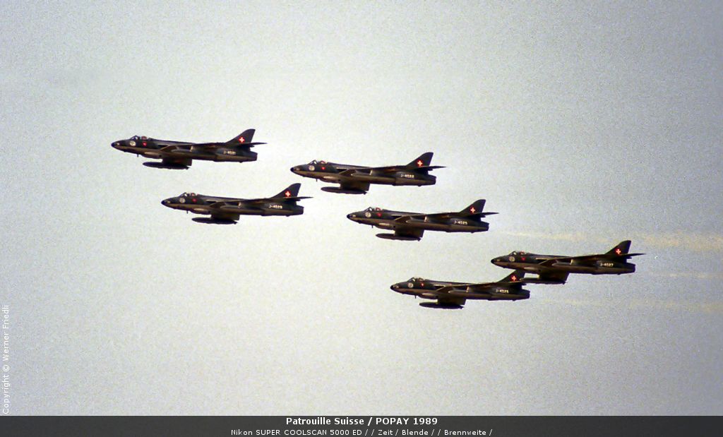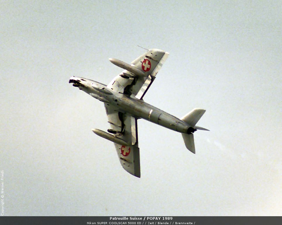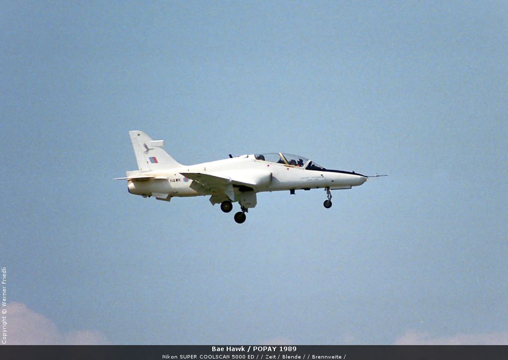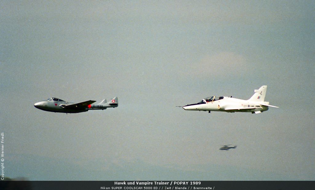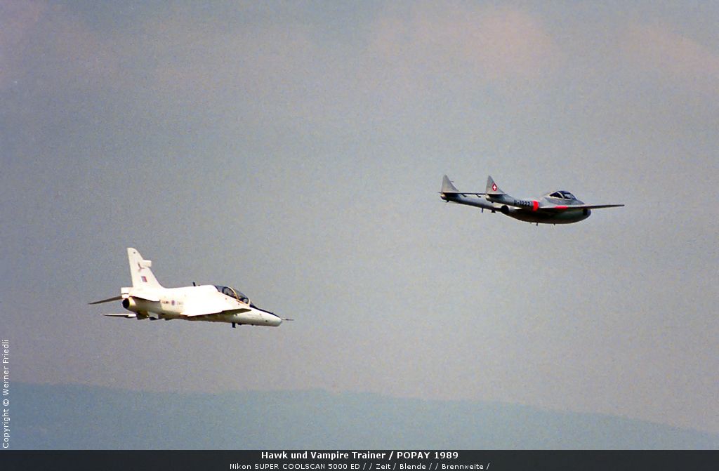 1989 begann auch die Auslieferung des Trainingsflugzeugs BAE Hawk Mk.66 an die Schweizer Fliegertruppen, wobei die meisten der 20 bestellten Flugzeuge in Lizenz in der Schweiz gefertigt wurden. In Payerne wurde die BAE Hawk bereits vorgeflogen, allerdings noch eine britische Ausführung. Vor allem die Formation mit dem Vampire-Trainer, welcher durch die BAE Hawk abgelöst wurde, war ein schönes Fotosujet.