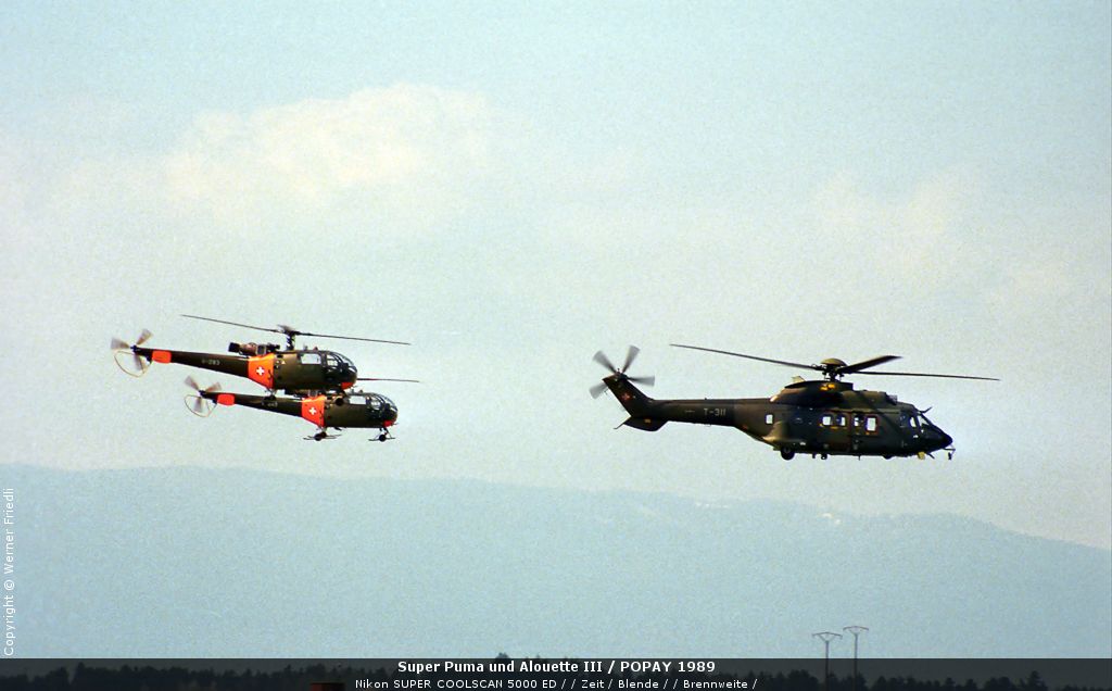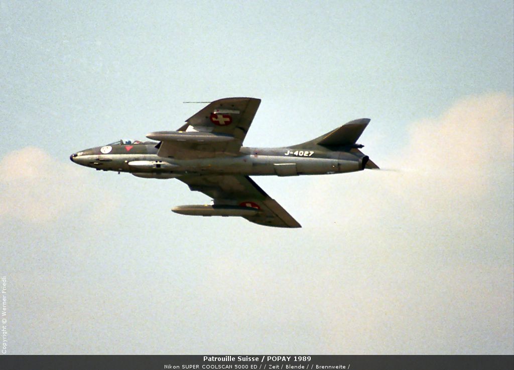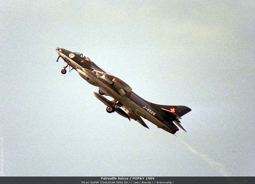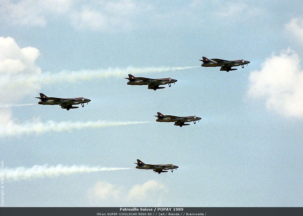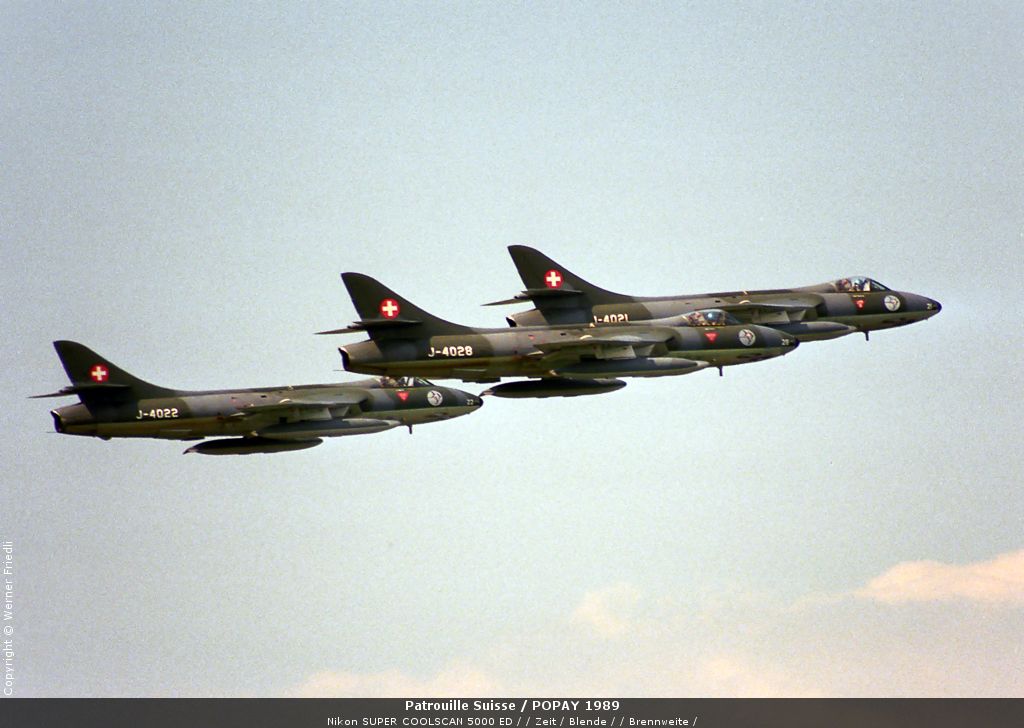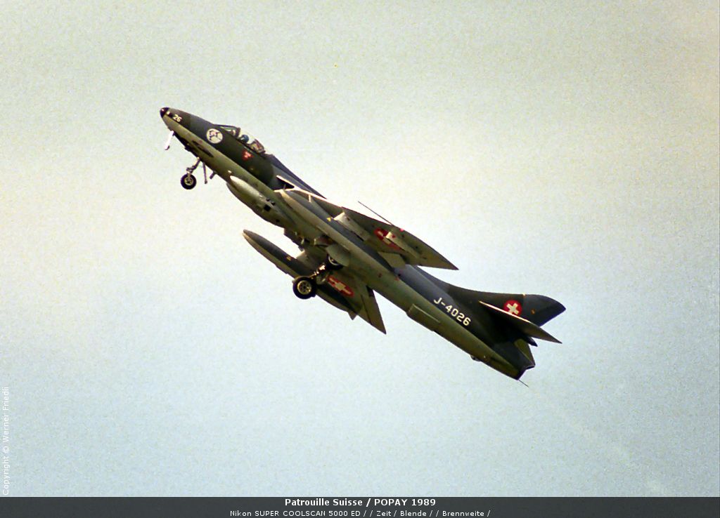 1989 begann auch die Auslieferung des Trainingsflugzeugs BAE Hawk Mk.66 an die Schweizer Fliegertruppen, wobei die meisten der 20 bestellten Flugzeuge in Lizenz in der Schweiz gefertigt wurden. In Payerne wurde die BAE Hawk bereits vorgeflogen, allerdings noch eine britische Ausführung. Vor allem die Formation mit dem Vampire-Trainer, welcher durch die BAE Hawk abgelöst wurde, war ein schönes Fotosujet.