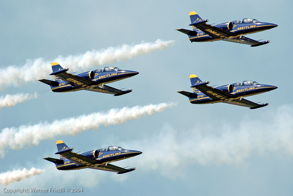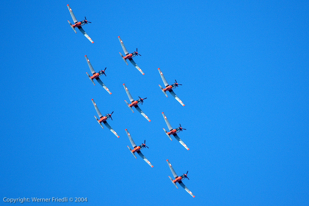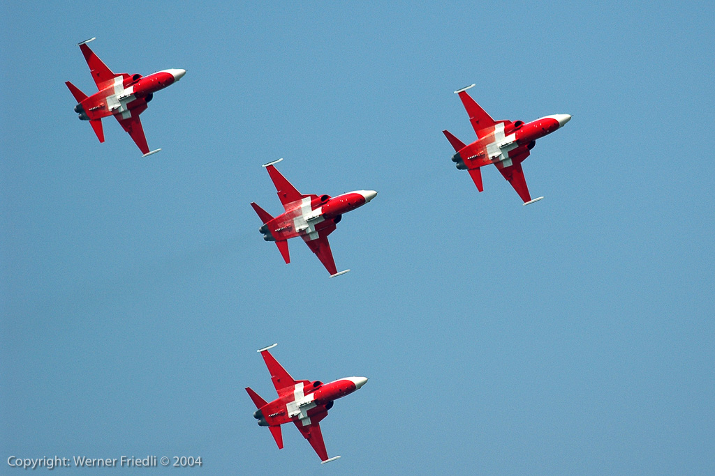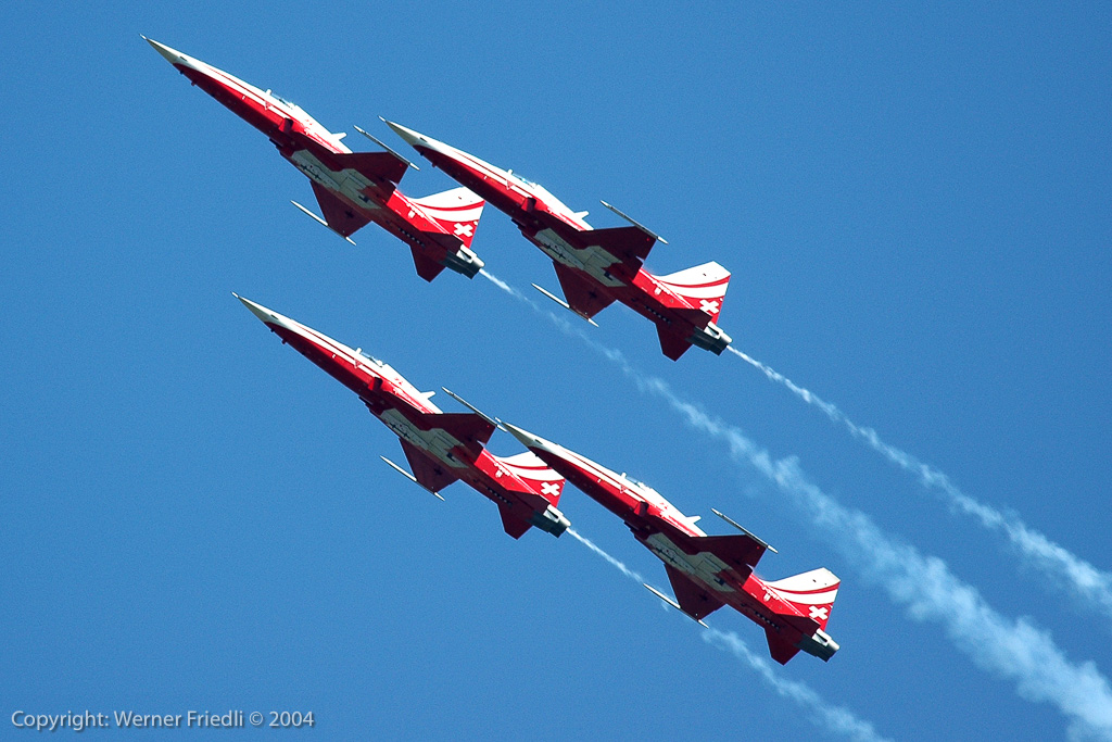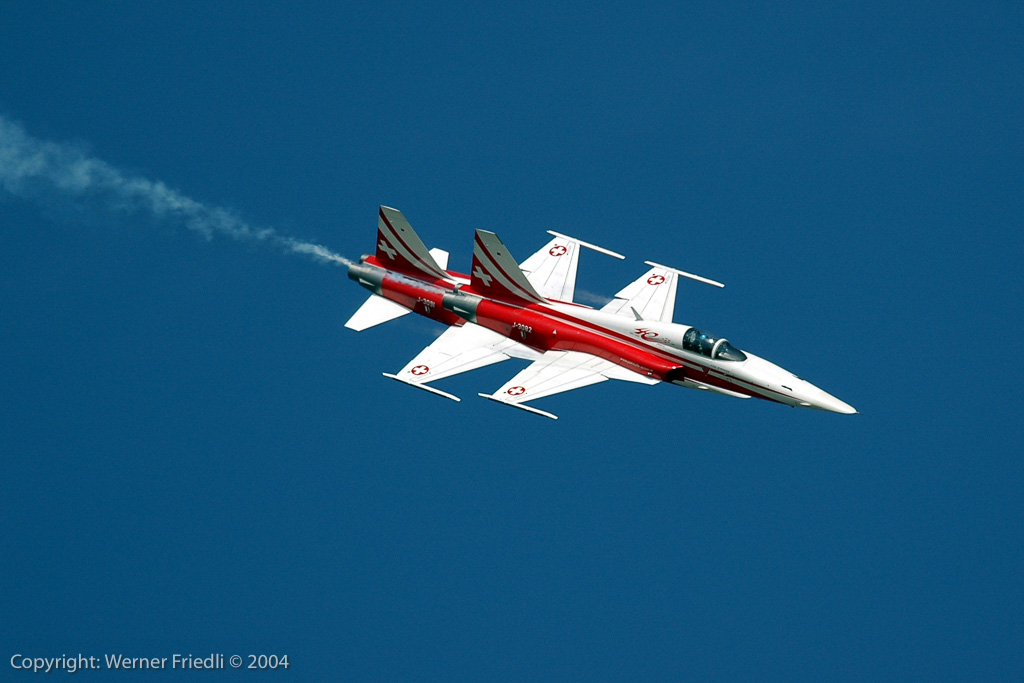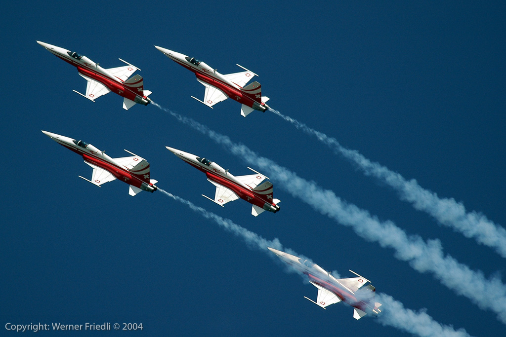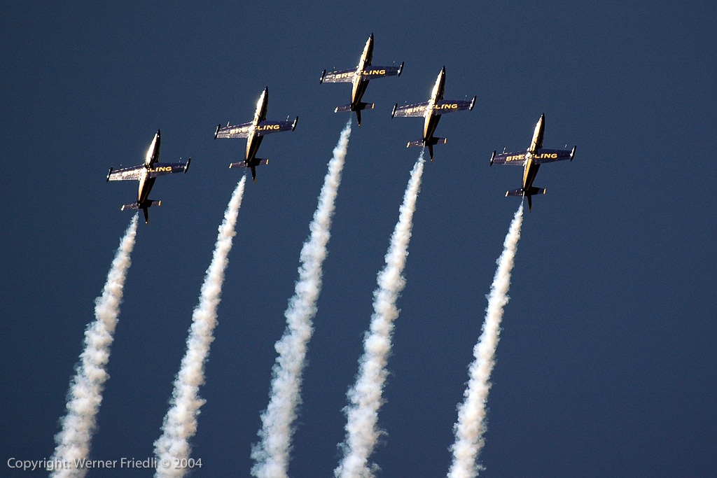 Am Start befand sich fast alles, was in der Fliegerei Rang und Namen hat. Die Airshow wurde geprägt durch Jets und Kunstflugteams, nur in der Mittagspause wurde es ein bisschen leiser, bei der Vorführung von Jet-Modellen. Gefeiert wurden das 40-jährige Bestehen der Patrouille Suisse, dass 15-jährige Bestehen des PC-7 Teams und nicht zuletzt der 90. Geburtstag der Schweizer Luftwaffe. Ohne Vorfälle und bei bestem Wetter wohnten den Vorführungen insgesamt ca. 275’000 Zuschauer bei. Unvergesslich bleibt sicherlich der Vorbeiflug von fünf Kunstflugteams in Formation – dabei wurden Erinnerungen an die Air ’94 in Buochs wach, wo ein Defilee von ca. 40 Huntern den Schlusspunkt unter die Airshow setzte.