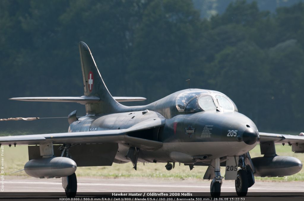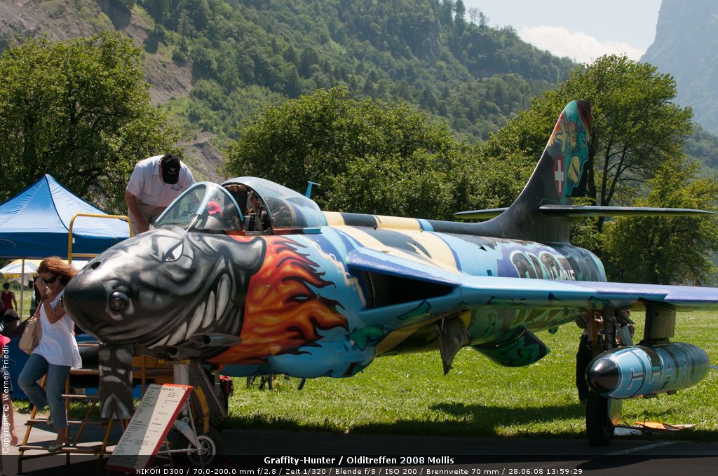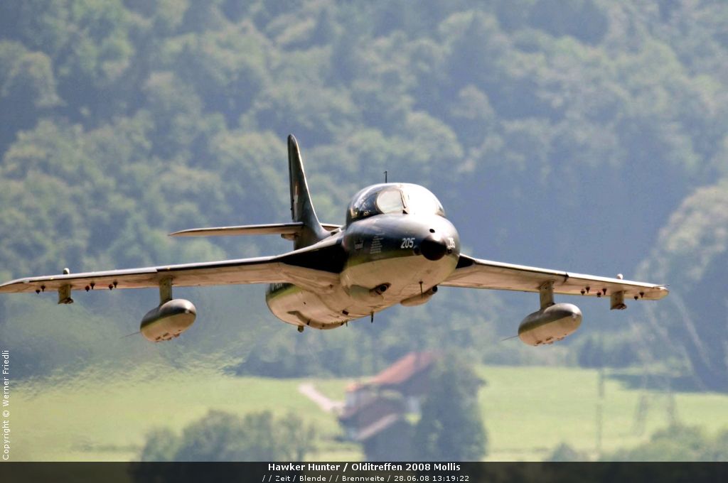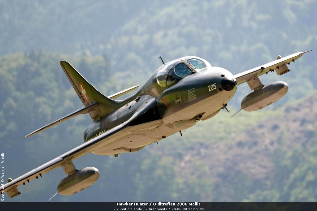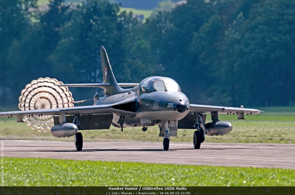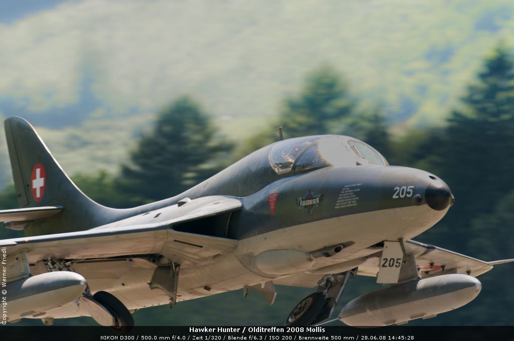 Mit dabei an diesem Olditreffen war auch ein Hawker Hunter des Fliegermuseums Altenrhein. Daneben ein Pilatus PC-7, eine Boeing Stearman, ein Bücker Jungmann, eine Antonov An-2 und eine Junkers Ju-52. Der Anlass war sehr familiär und man konnte die Maschinen ohne Zaun und Abschrankung ganz nah erleben. Der Hawker Hunter führte mehrere Passagierflüge durch, und meist vor der Landung zeigte die Maschine noch tiefe Vorbeiflüge über der Piste des Flugplatzes. Das war für mich eine gute Gelegenheit, den Hawker Hunter mal frontal zu fotografieren. Es klappte bereits beim ersten Mal sehr gut.