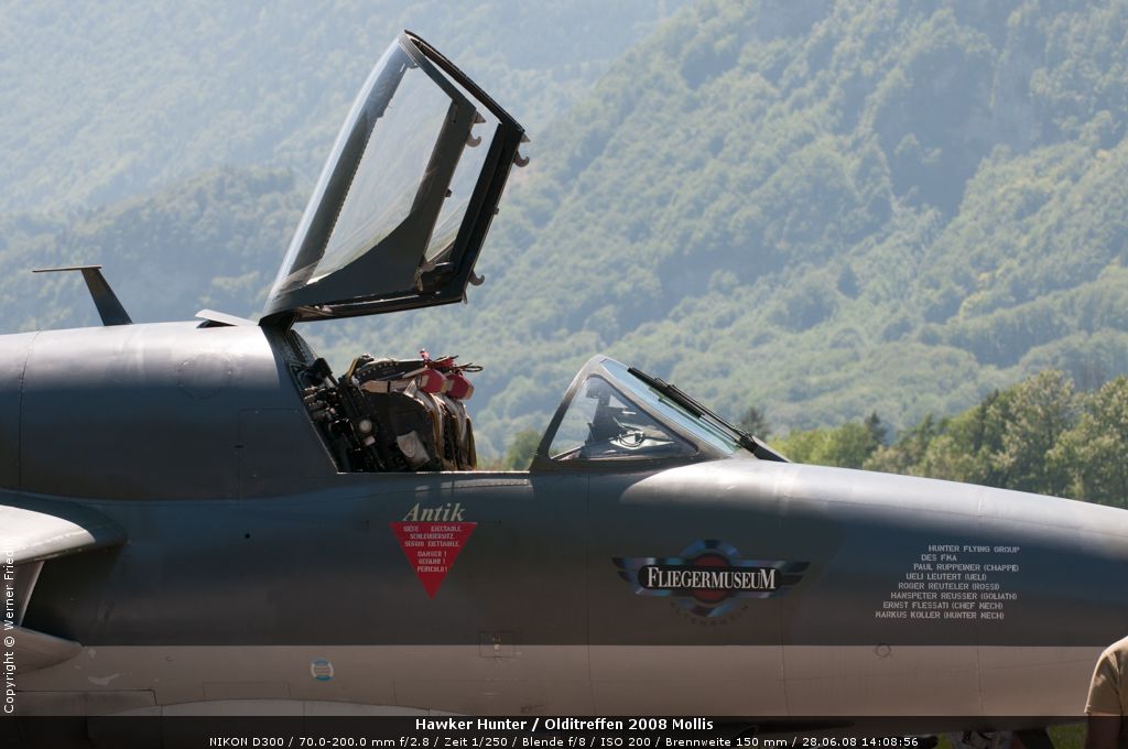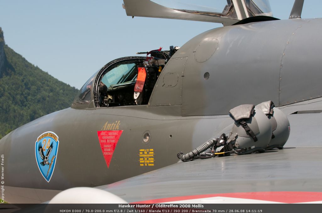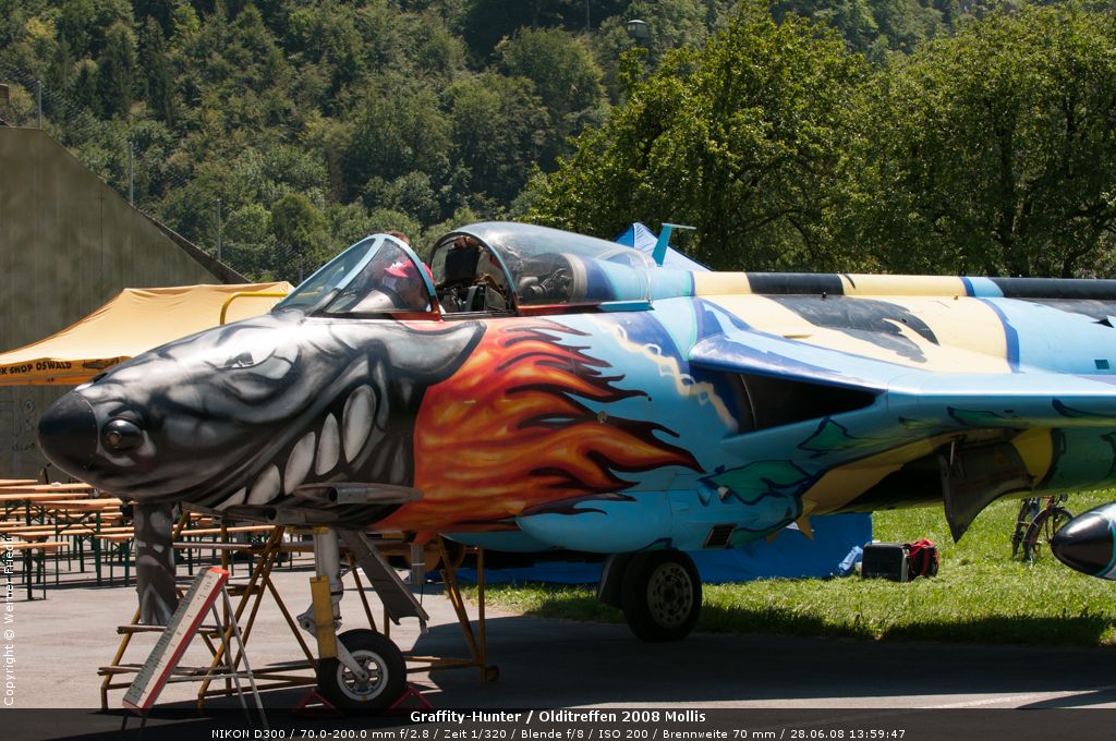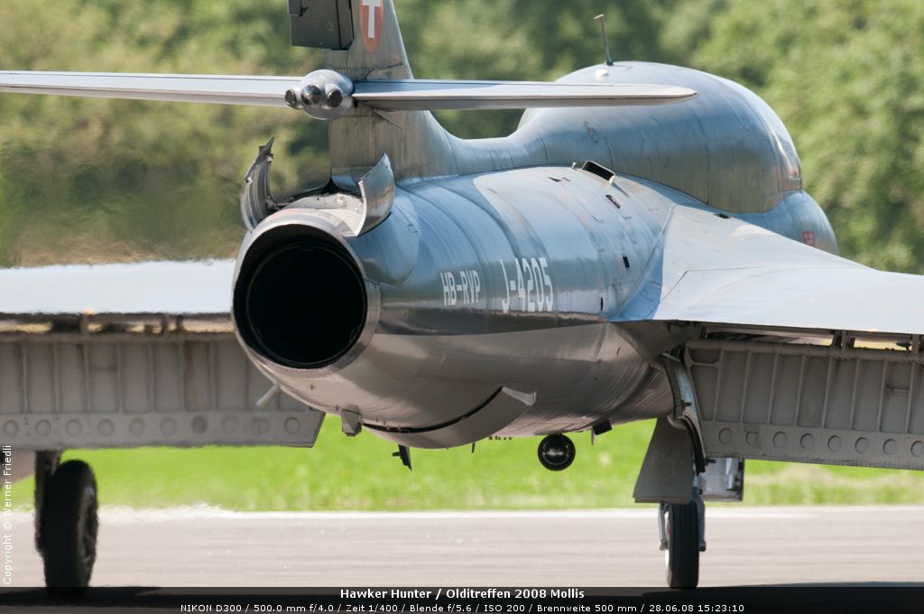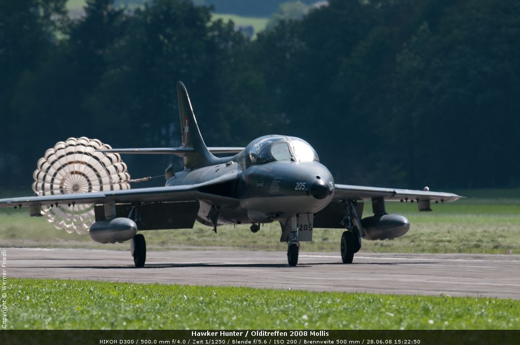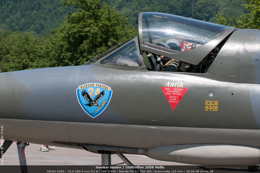 Mit dabei an diesem Olditreffen war auch ein Hawker Hunter des Fliegermuseums Altenrhein. Daneben ein Pilatus PC-7, eine Boeing Stearman, ein Bücker Jungmann, eine Antonov An-2 und eine Junkers Ju-52. Der Anlass war sehr familiär und man konnte die Maschinen ohne Zaun und Abschrankung ganz nah erleben. Der Hawker Hunter führte mehrere Passagierflüge durch, und meist vor der Landung zeigte die Maschine noch tiefe Vorbeiflüge über der Piste des Flugplatzes. Das war für mich eine gute Gelegenheit, den Hawker Hunter mal frontal zu fotografieren. Es klappte bereits beim ersten Mal sehr gut.