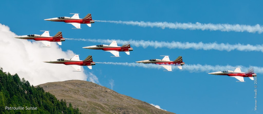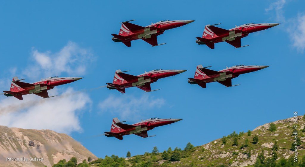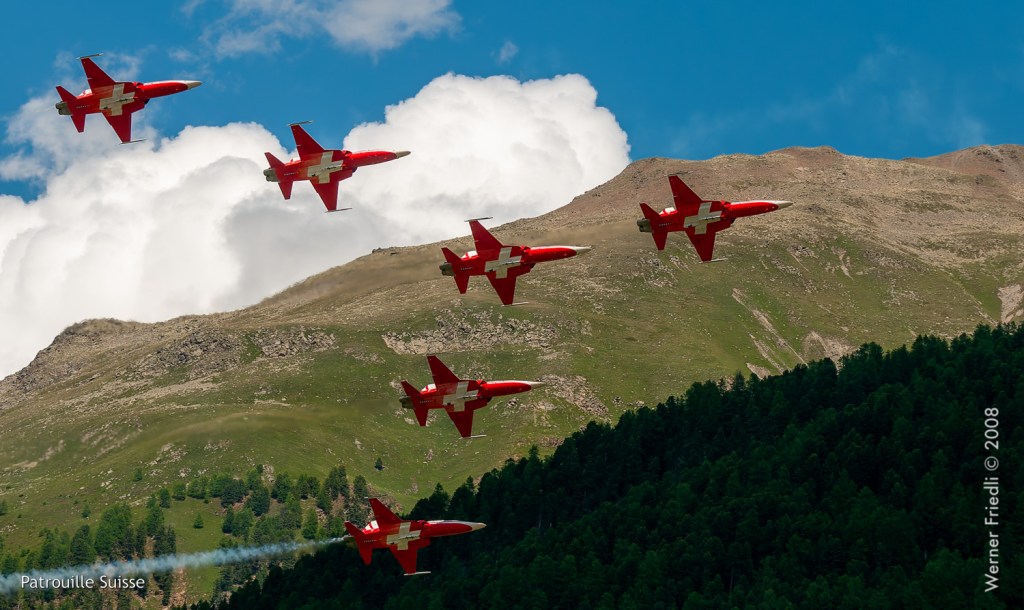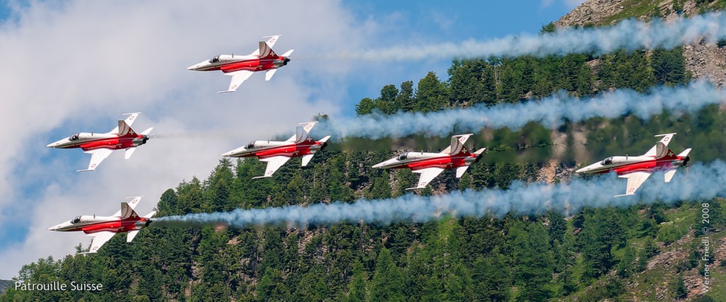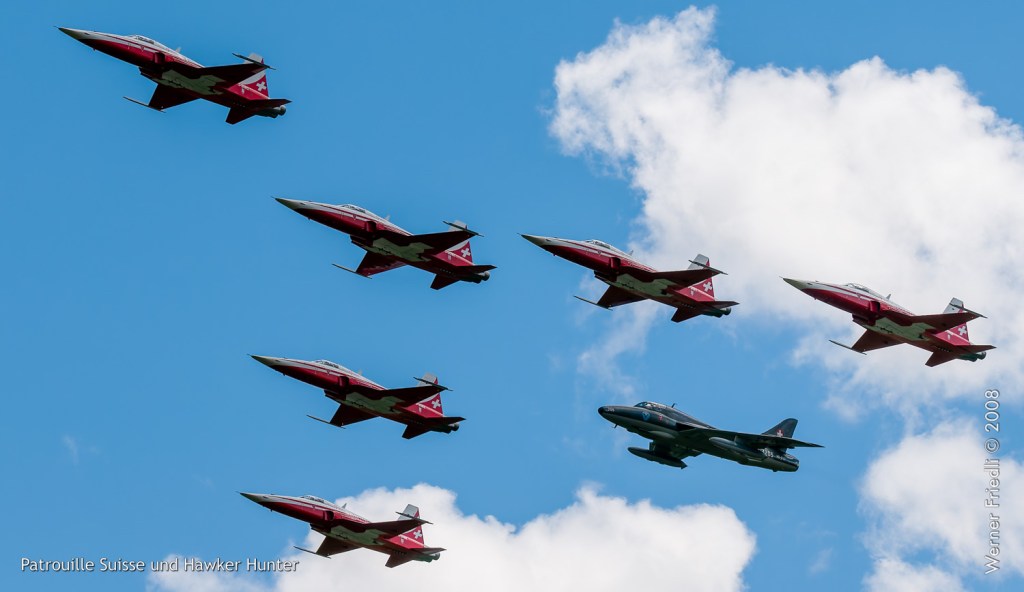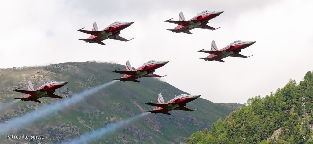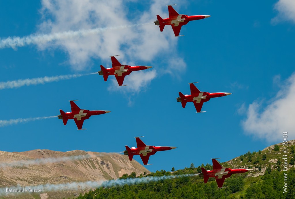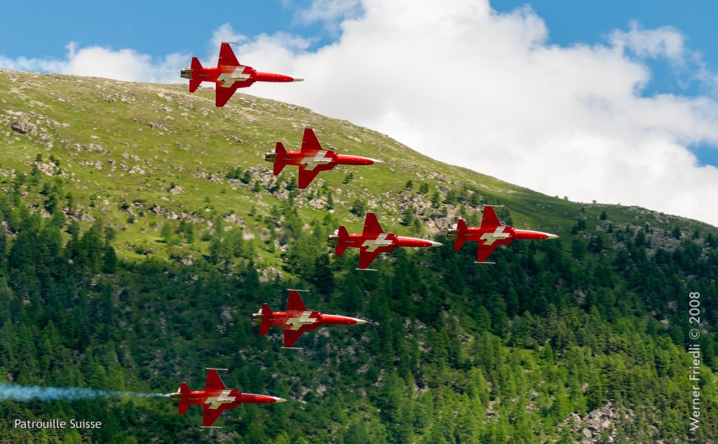 Damals üblich waren alte Jets der Schweizer Luftwaffe, wie der Hawker Hunter, aber auch Classic Props, wie die Lockheed Super Constellation oder die Junkers Ju-52. Auch die Patrouille Suisse zeigte sich an diesem schönen Sommertag im Engadin.