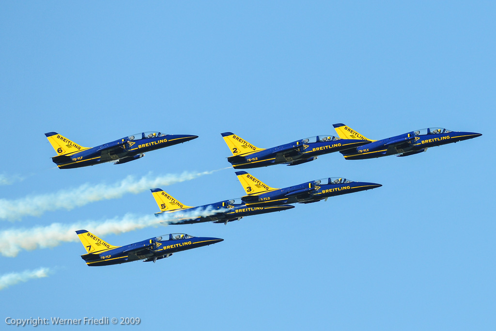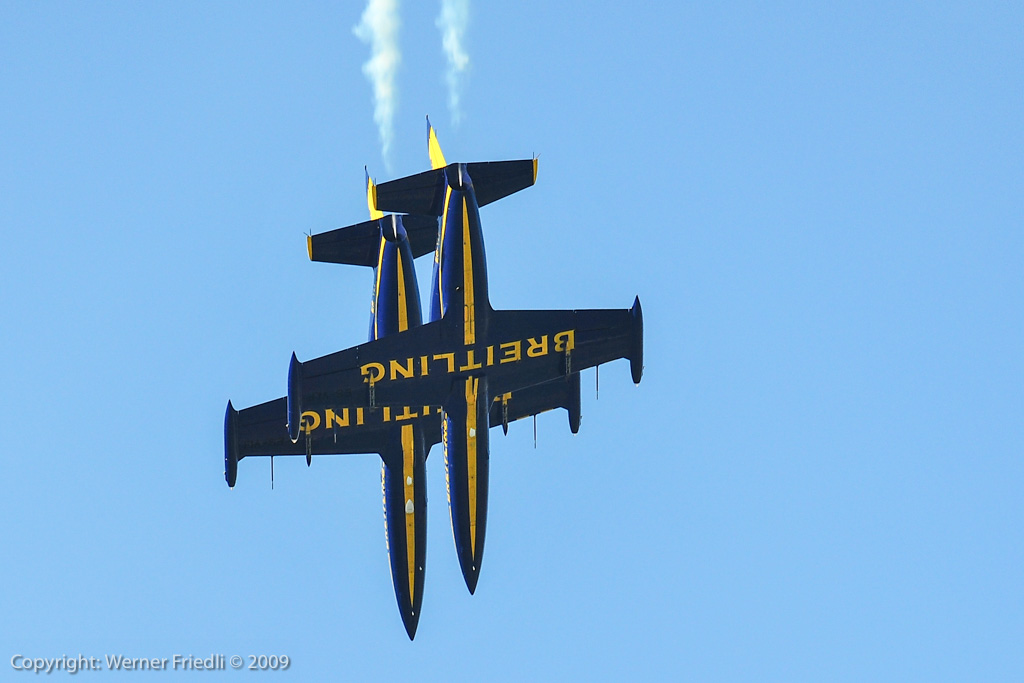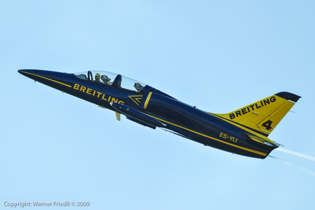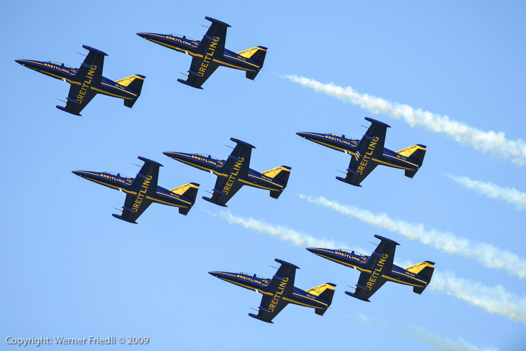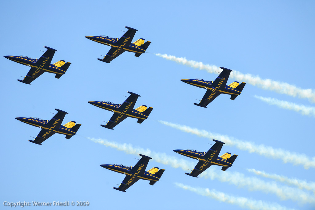 Aus La Ferté Alais besuchte Marc Mathis mit der Mustang Nooky Booky IV das Solothurner Gäu. Leider war die Anzahl der Warbirds rar, nur die Morane von Daniel Koblet aus Bex konnte noch gezählt werden. An beiden Tagen war der Hunter-Doppelsitzer zu sehen, der Passagierflüge durchführte und so das Flying Display bereicherte. Mit dem neuen Anstrich zu ehren der Fliegerstaffel 11 ist der Hunter ein Blickfang erster Güte und dürfte, wie der Speaker bereits erwähnte, wohl das meist fotografierte Flugzeuge der Schweiz im Jahre 2009 sein. Am Sonntag beendete das Breitling Jet Team auf sieben L-39 Albatros mit einem sehr schönen Display und bei bestem Wetter den Flugtag.
