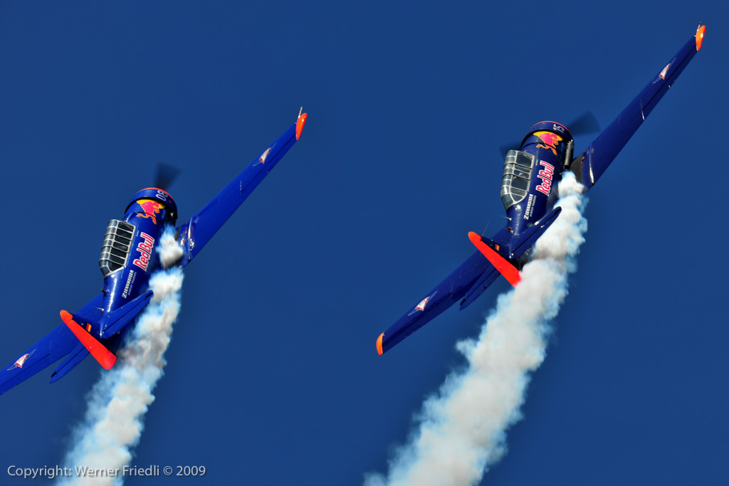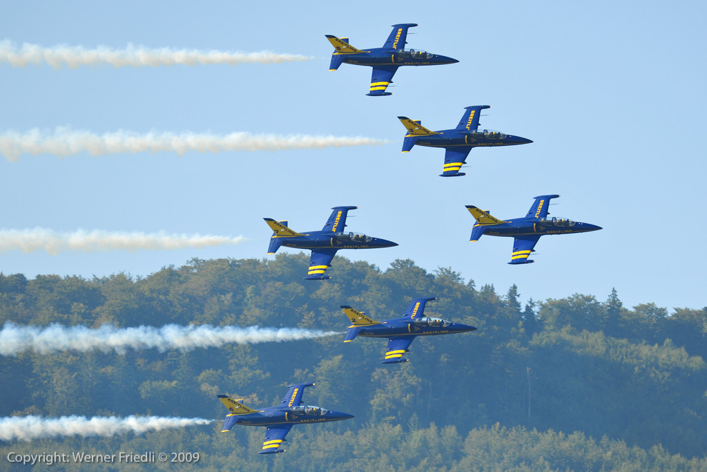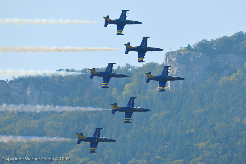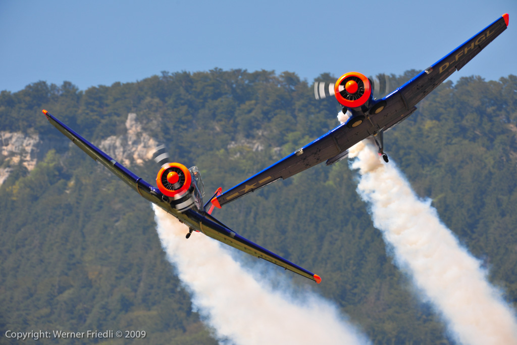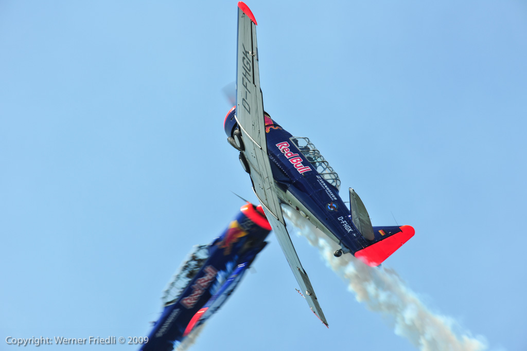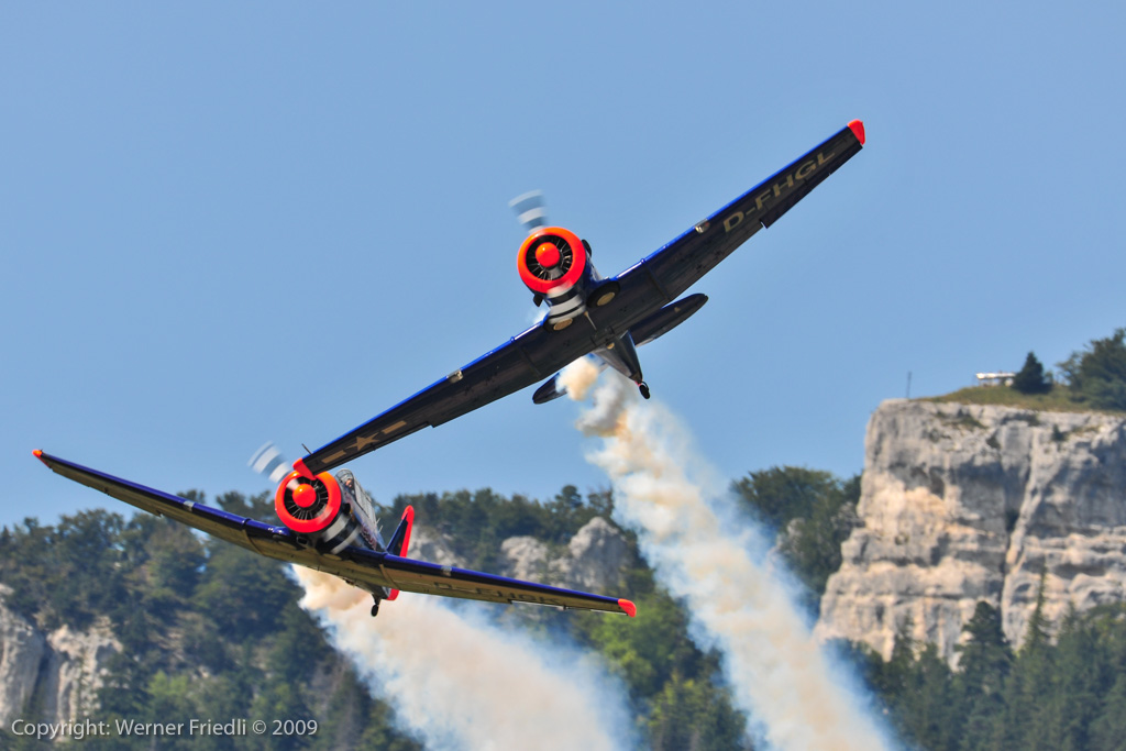 Aus La Ferté Alais besuchte Marc Mathis mit der Mustang Nooky Booky IV das Solothurner Gäu. Leider war die Anzahl der Warbirds rar, nur die Morane von Daniel Koblet aus Bex konnte noch gezählt werden. An beiden Tagen war der Hunter-Doppelsitzer zu sehen, der Passagierflüge durchführte und so das Flying Display bereicherte. Mit dem neuen Anstrich zu ehren der Fliegerstaffel 11 ist der Hunter ein Blickfang erster Güte und dürfte, wie der Speaker bereits erwähnte, wohl das meist fotografierte Flugzeuge der Schweiz im Jahre 2009 sein. Am Sonntag beendete das Breitling Jet Team auf sieben L-39 Albatros mit einem sehr schönen Display und bei bestem Wetter den Flugtag.