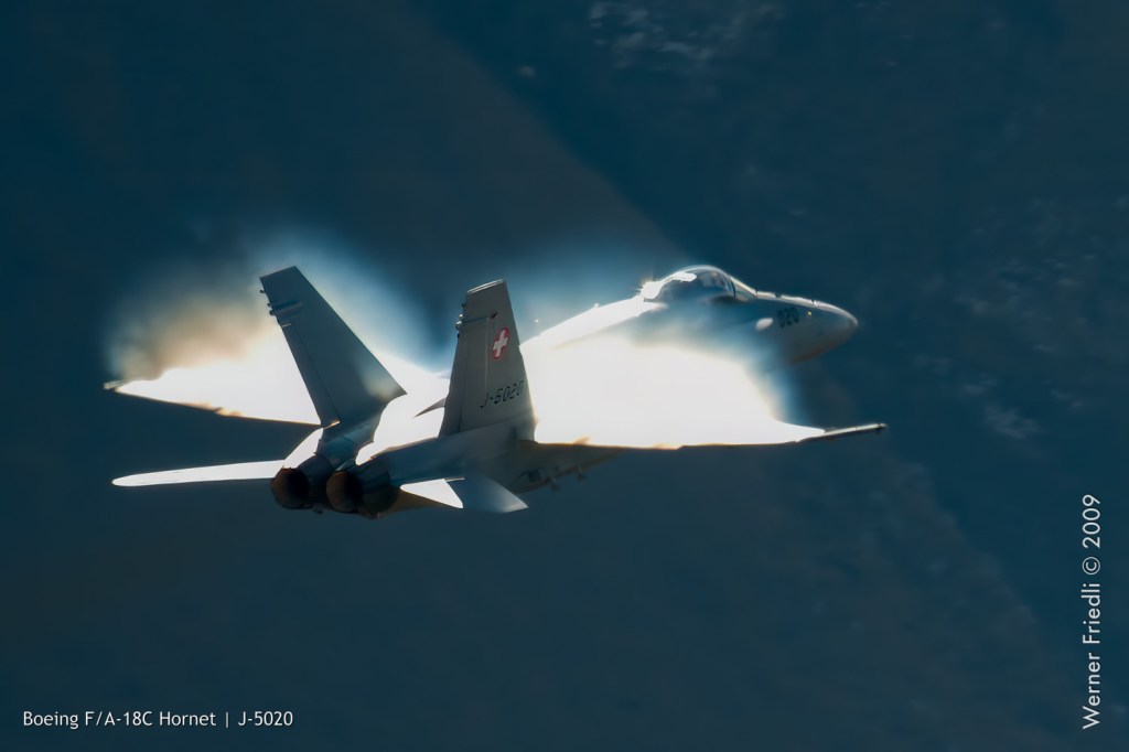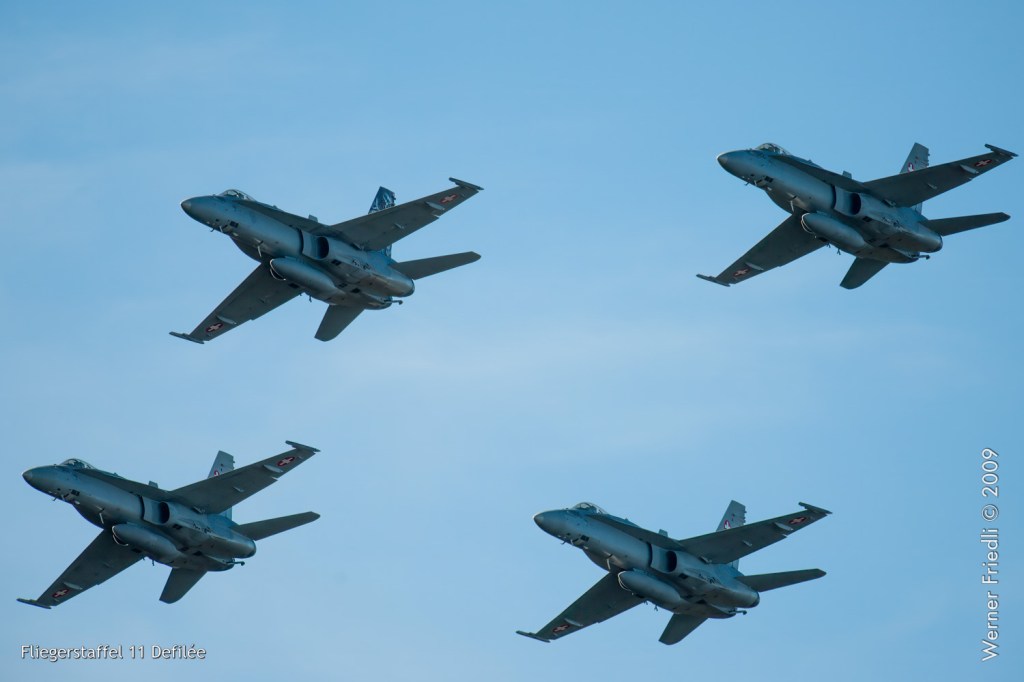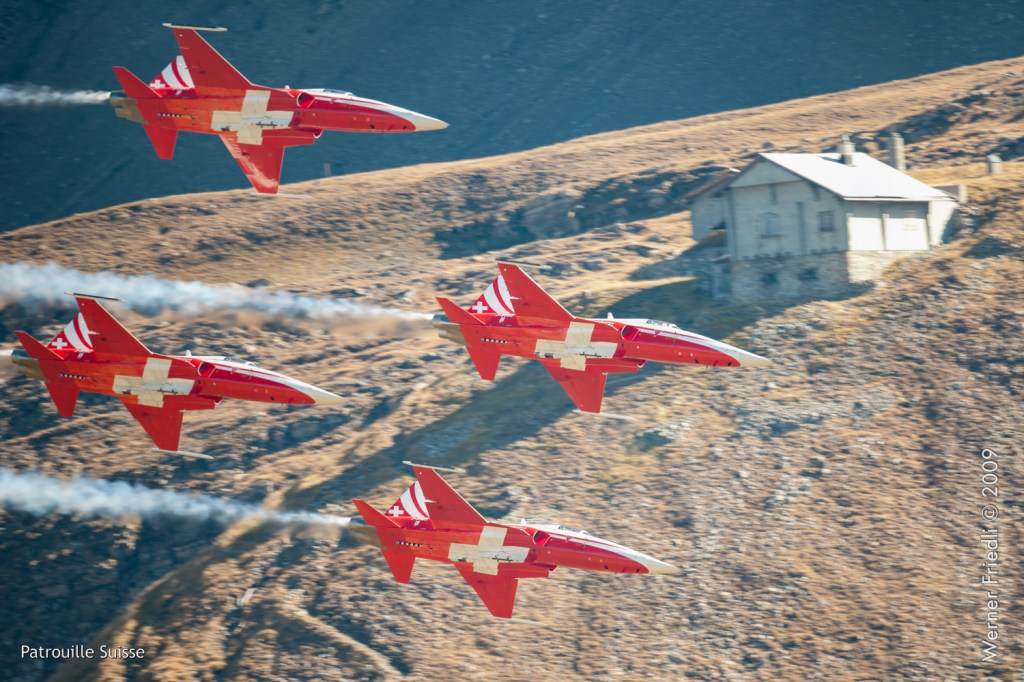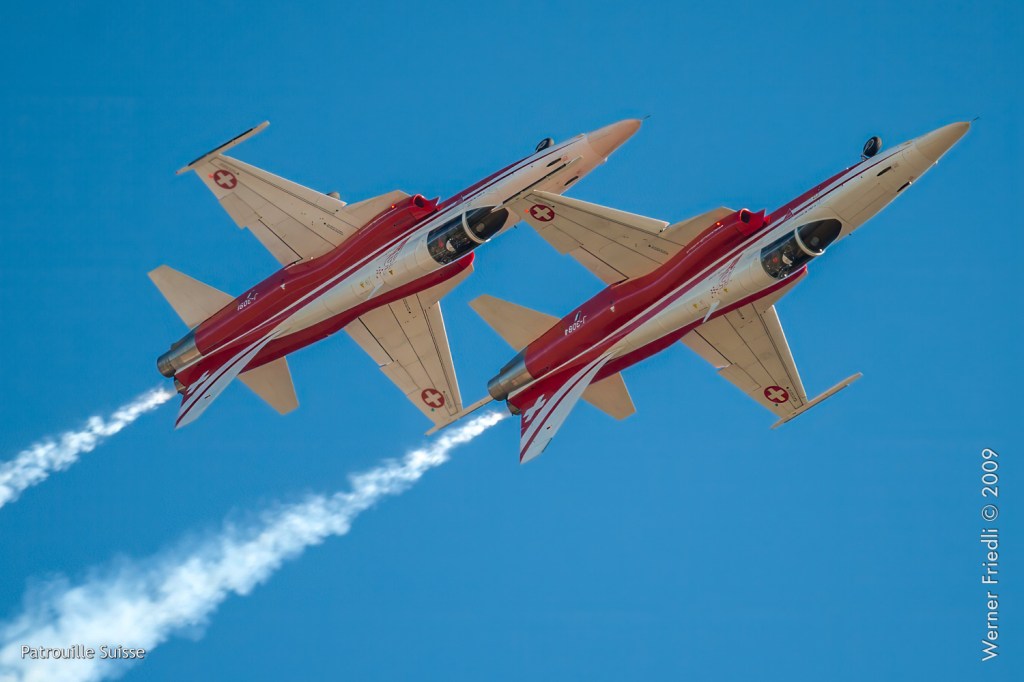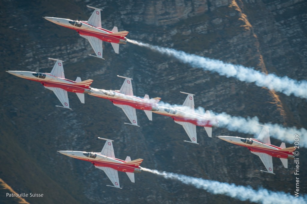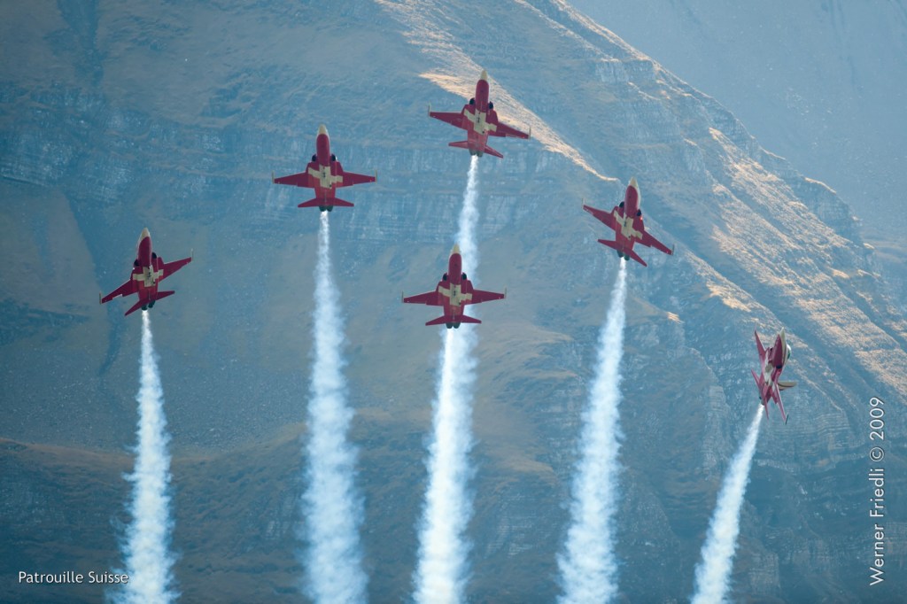 Die Patrouille Suisse zeigte ein gutes Programm, allerdings misslang die Figur ‚Flirt‘ der beiden Solisten. Bei der Figur ‚Shadow‘ hatte die Nummer 4 eine deutliche Ablage, was natürlich auf den Fotos klar zum Ausdruck kommt.