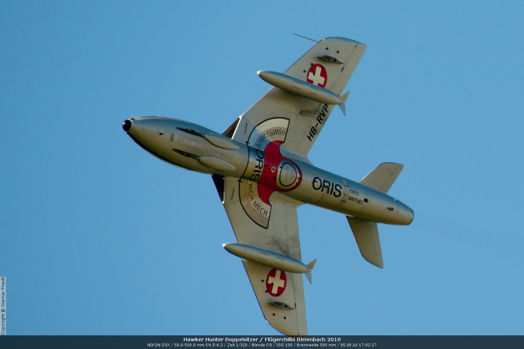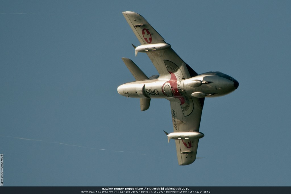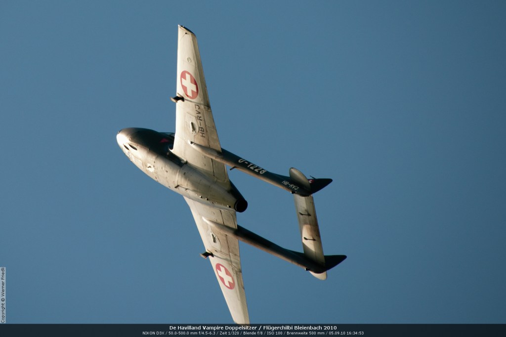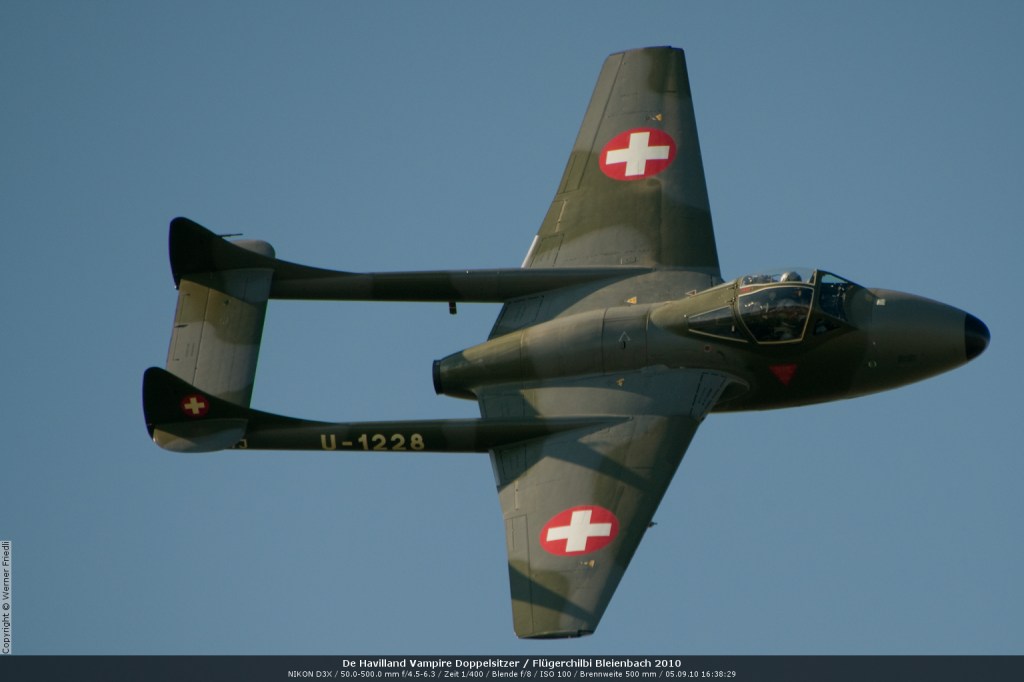 Auch Hunter und Vampire kamen im Rahmen von Passagierflügen auf dem Flugplatz Bleienbach vorbei. Ganz kurz und sehr überraschend für die Zuschauer überflog auch noch eine Yak-11 aus Deutschland das kleine Flugfeld im Oberaargau.
