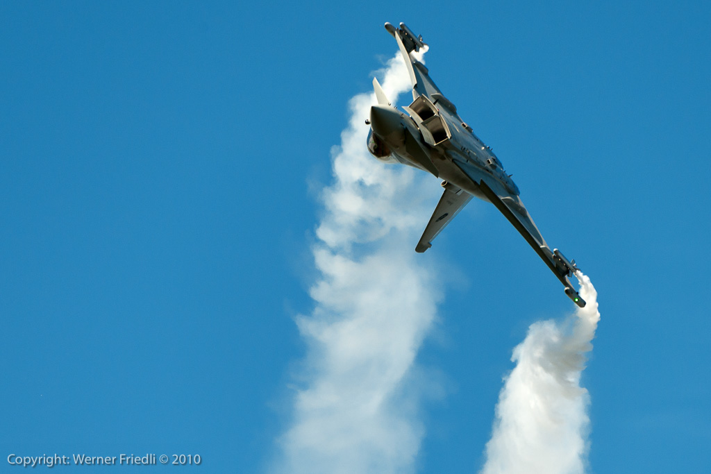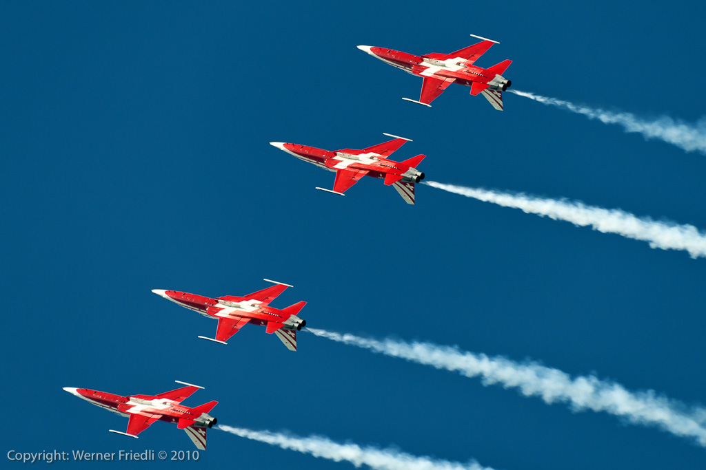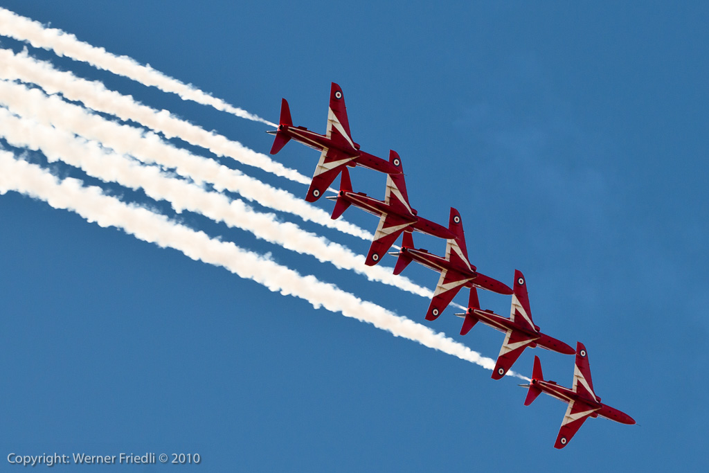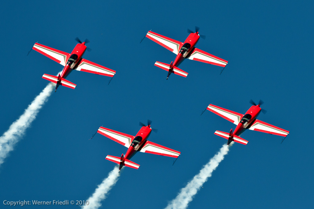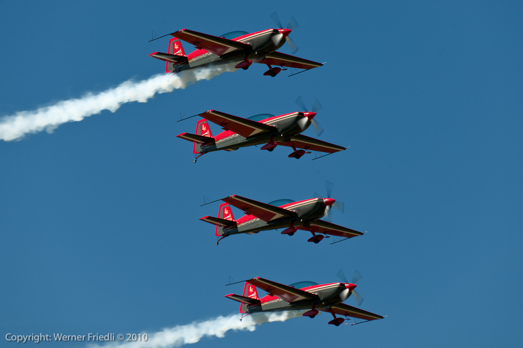 Aus ganz Europa waren die Kunstflugteams zu Gast. Da waren die britischen Red Arrows, die Patrouille de France, die Patrulla Aguila aus Spanien, die kroatischen Krila Oluje mit ihren PC-9, die polnischen Iskri, die Royal Jordanian Falcons mit ihren Extra 300 und natürlich auch die Patrouille Suisse. Die Frecces, wie üblich mit viel Rauch beim Start beendeten jeweils ihre temporeiche Vorführung mit einer nicht ganz ungefährlichen aber äusserst präzisen Landung in Formation.