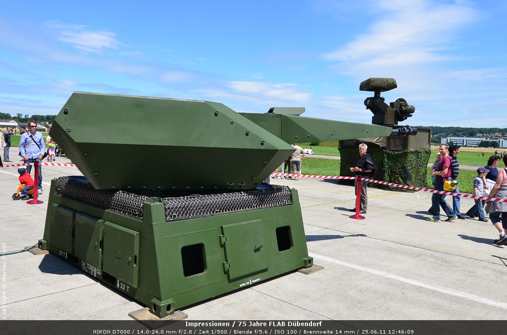 Es wurde sogar noch scharf geschossen, und zwar durch die 35 mm Flab. Allerdings wurde sogenannte Zerfallsmunition eingesetzt, bei welcher die Treibladung zwar der scharfen Varianten entspricht, statt Stahlkugeln wurden allerdings Kunststoffkörper verschossen, die sich nach dem Verlassen des Rohres in tausend Stücke zerteilten und bereits in 50 Meter Entfernung keine Wirkung mehr zeigten. Somit konnten der Pilatus PC-9, welcher das Ziel darstellte, nach dem Waffeneinsatz unbeschadet zur Basis zurückkehren.