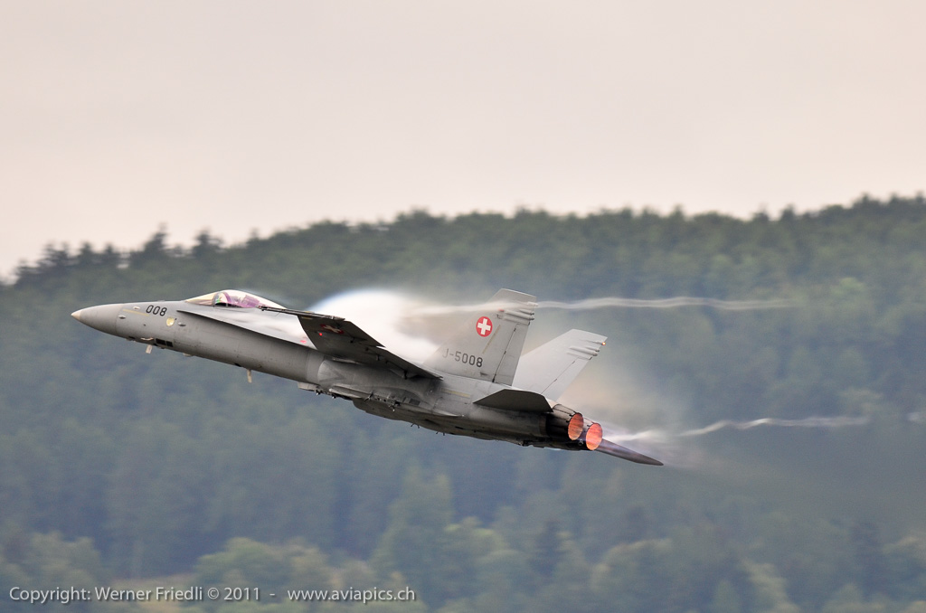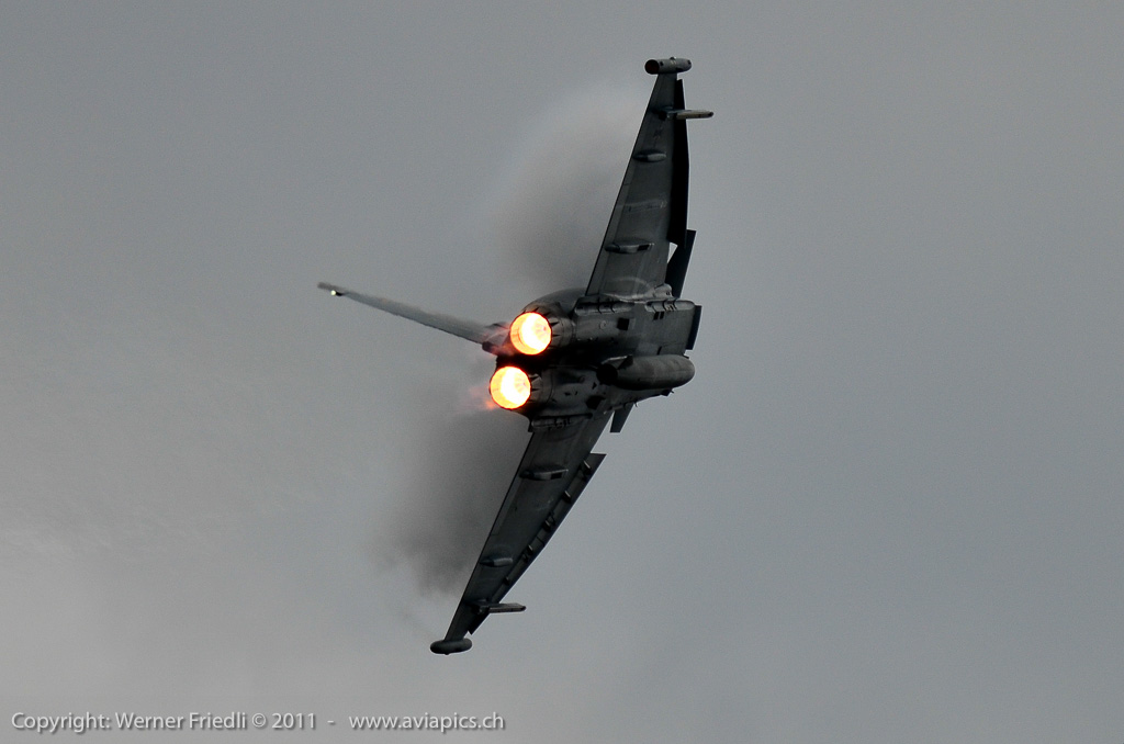 Fotografisch war der Samstag sehr anspruchsvoll. So regnete es sehr oft, wobei die Regenpausen am Nachmittag immer grösser wurden. Trotzdem blieb die rechte Tragfläche der PBY Catalina mein bester Freund und ermöglichte es mir, auch bei Starkregen noch fotografieren zu können. Die hohe Luftfeuchtigkeit hatte aber auch ihre Vorzüge. So entstanden bei den Jets sehr schöne Ablösungen auf den Tragflächenoberseiten. Zudem waren auch die Nachbrenner der Tiger-Teilersatz-Kandidaten bei diesen diffusen Lichtverhältnissen gut zu sehen.
