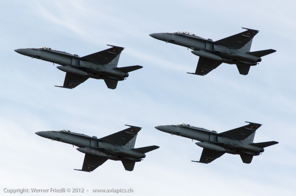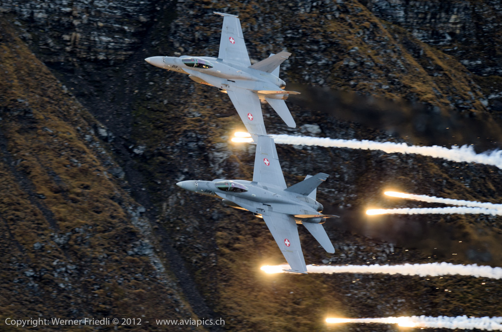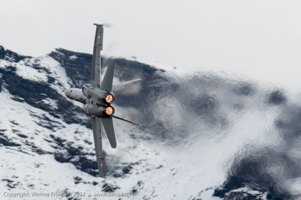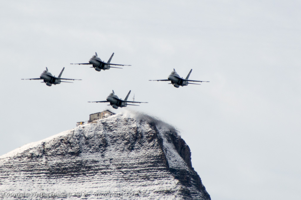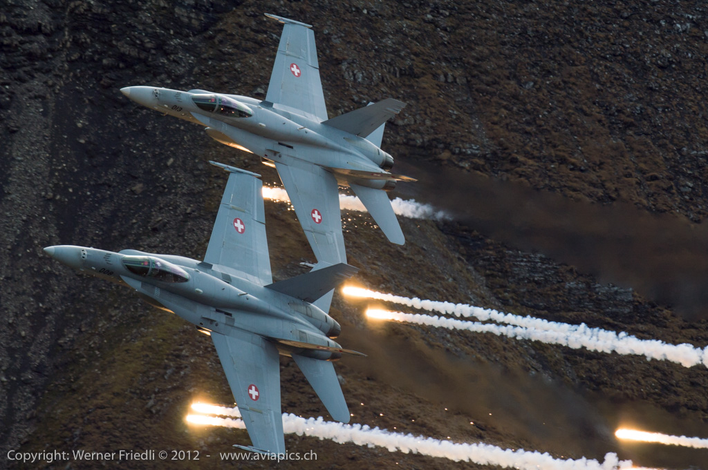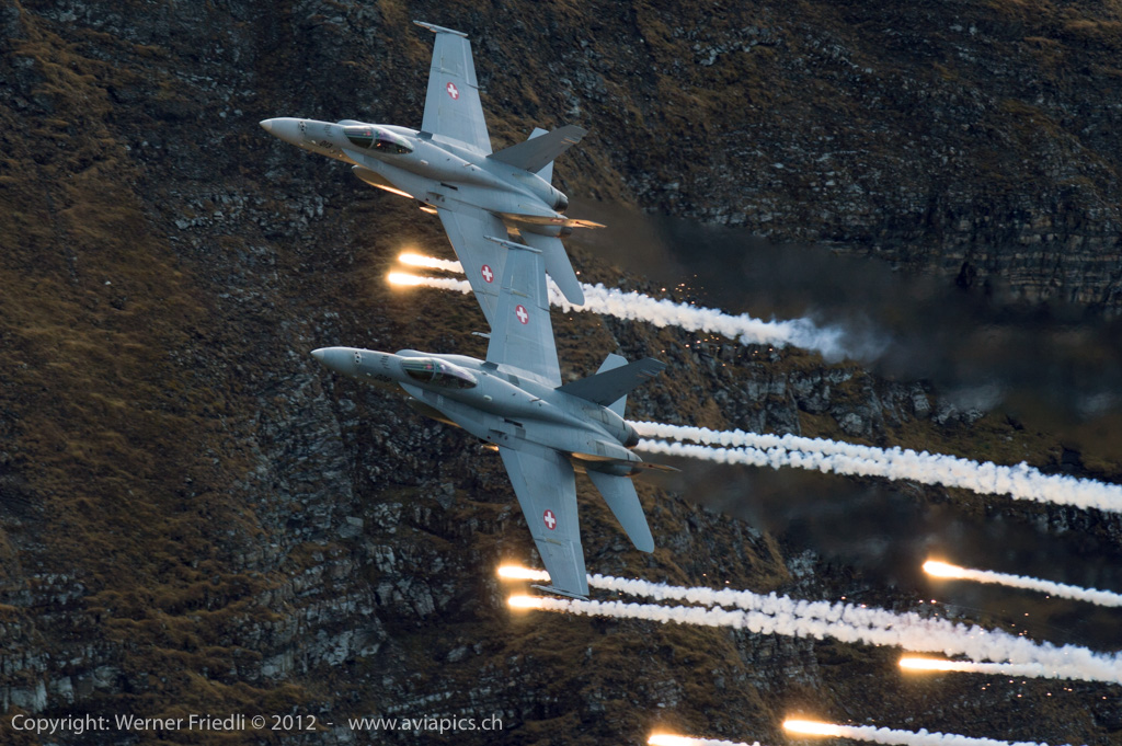 Die Eröffnung des Fliegerschiessens wurde bereits wie im Jahre 2010 durch eine Doppelpatrouille Hornets geflogen. Die zwei ersten Maschinen fliegen mit hoher Geschwindigkeit aus dem Tal an, schiessen während des Anfluges Flares ab und passieren danach den Kommandoposten (KP), während die zwei folgenden Maschinen bereits die Bodenziele unter Beschuss nehmen. Sicherlich wurde mit diesem Programmstart ein würdiger Ersatz für die frühere Axalp-Eröffnung durch die Mirage Aufklärer (AMIR) gefunden.