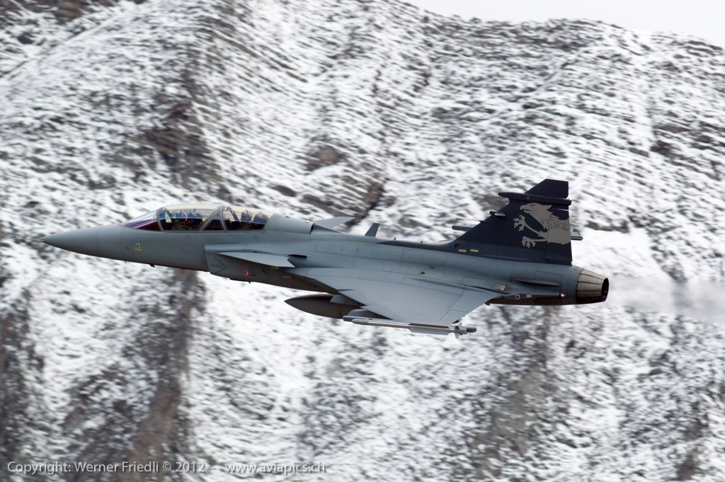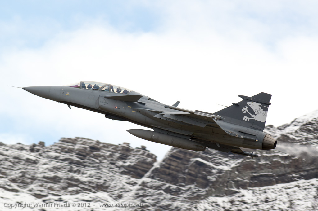 „Chunnt dr Raphael“ tönte es im Bus, welcher um ca. 6:20 Uhr in Richtung Axalp-Dorf fuhr. In meiner morgendlichen Lethargie dachte ich zuerst, es gehe wohl um einen Kollegen, der den Bus nicht erwischte. Erst als ich merkte, dass der Sprecher mit anderen Kollegen über Flugzeuge sprach, dämmerte es mir, dass mit dem „Raphael“ wohl der Dassault Rafale gemeint war. Der Dassault Rafale kam nicht, dafür der Saab Gripen, welcher von einem Piloten der Armasuisse gekonnt vorgeführt wurde. Er zeigte Evolutionen und Flugwege, welche auch die Flugzeuge zeigen, welche den Schiessparcour auf der Ebenfluh absolvieren. Allerdings wurden keine Schiessübungen mit dem Gripen-Demonstrator F durchgeführt. Vor allem der letzte Überflug mit grosser Geschwindigkeit war sehr fotogen.