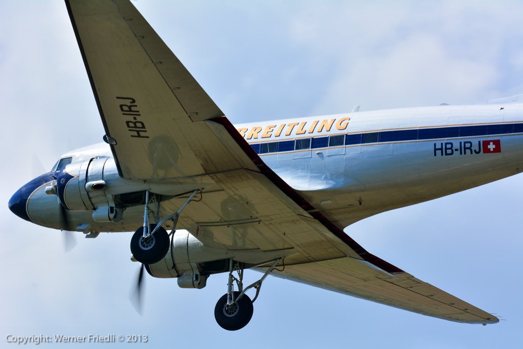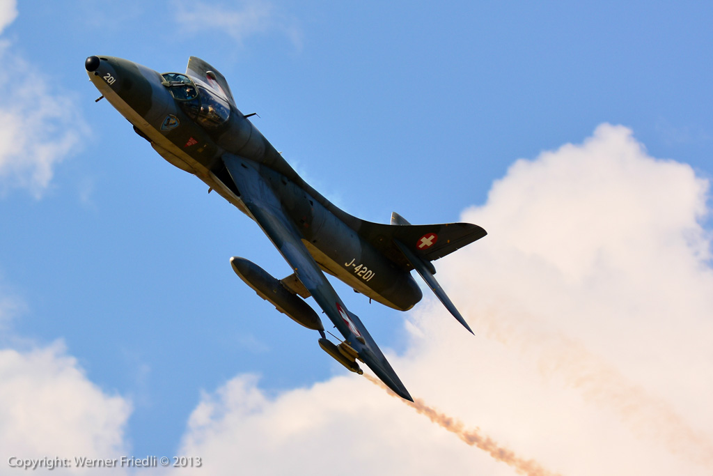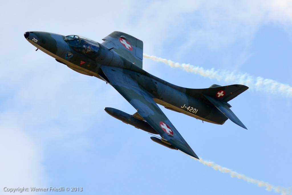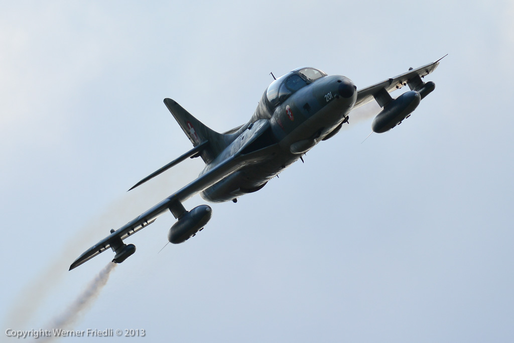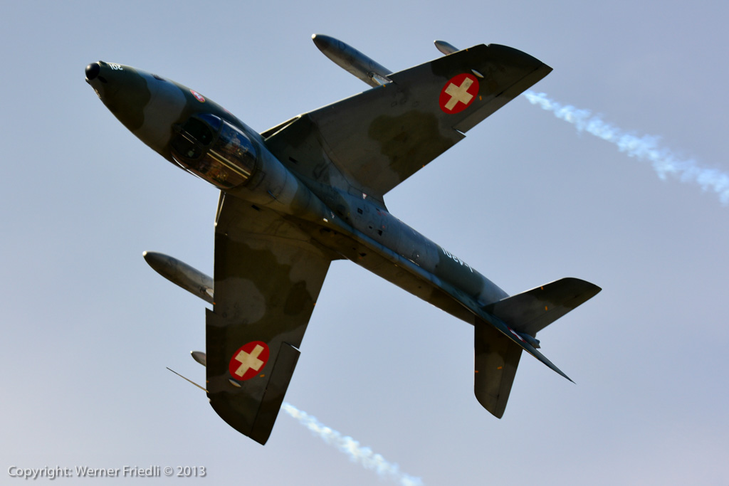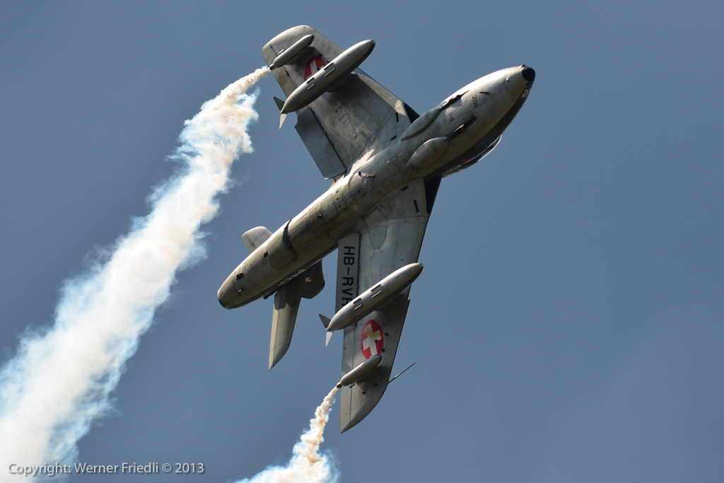 Höhepunkte der Ausgabe 2013 waren das Super Puma Display, die DC-3 von Breitling und die Vorführung des Hawker Hunter Trainers. Der alte Jetveteran aus Sion war bei seiner Vorführung mit zwei Rauchgeneratoren ausgerüstet, was die Demo natürlich umso interessanter machte. Ich habe mich ein wenig näher an die Vorführachse des Hunters gewagt, in der Hoffnung, die störende Hochspannungsleitung samt Oberleitung der Bahn nicht so präsent im Hintergrund zu haben. Gelohnt hat es sich leider nur bedingt. Trotzdem, Prangins ist immer ein Besuch wert.