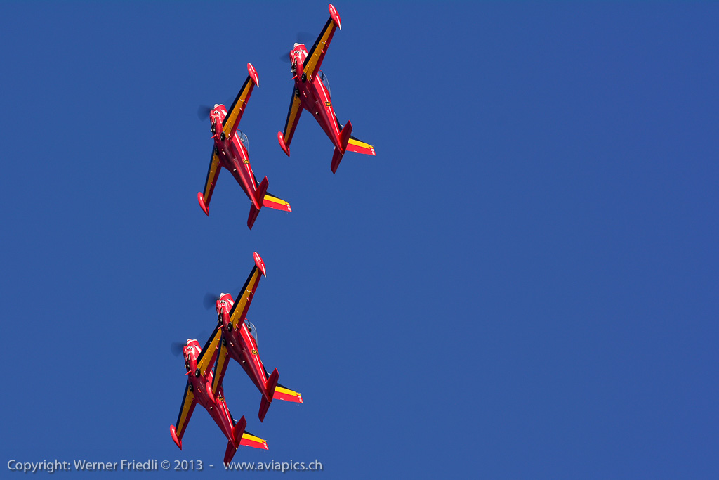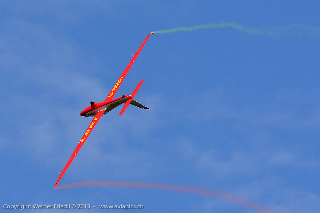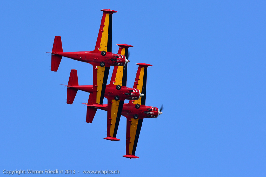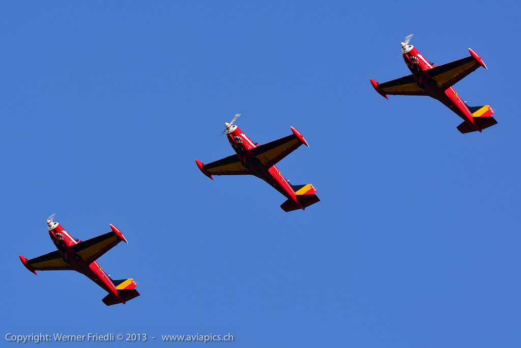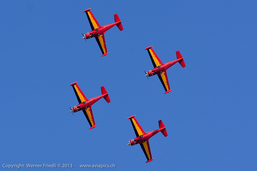 Für mich neu waren die ‚Red Devils‘ der Belgischen Luftwaffe, welche mit vier rot-gelb bemalten Aermacchi SF260 eine schöne Show zeigten. Ansonsten waren die üblichen Besucher in Dittingen anzutreffen. Beim Betrachten der Fotos muss ich jedes mal neidlos anerkennen, dass der Flugplatz Dittingen so etwas wie der beste Platz für optimal belichtete Bilder ist. Hat man seine Kamera erst mal eingestellt, kann eigentlich nichts mehr schief gehen.