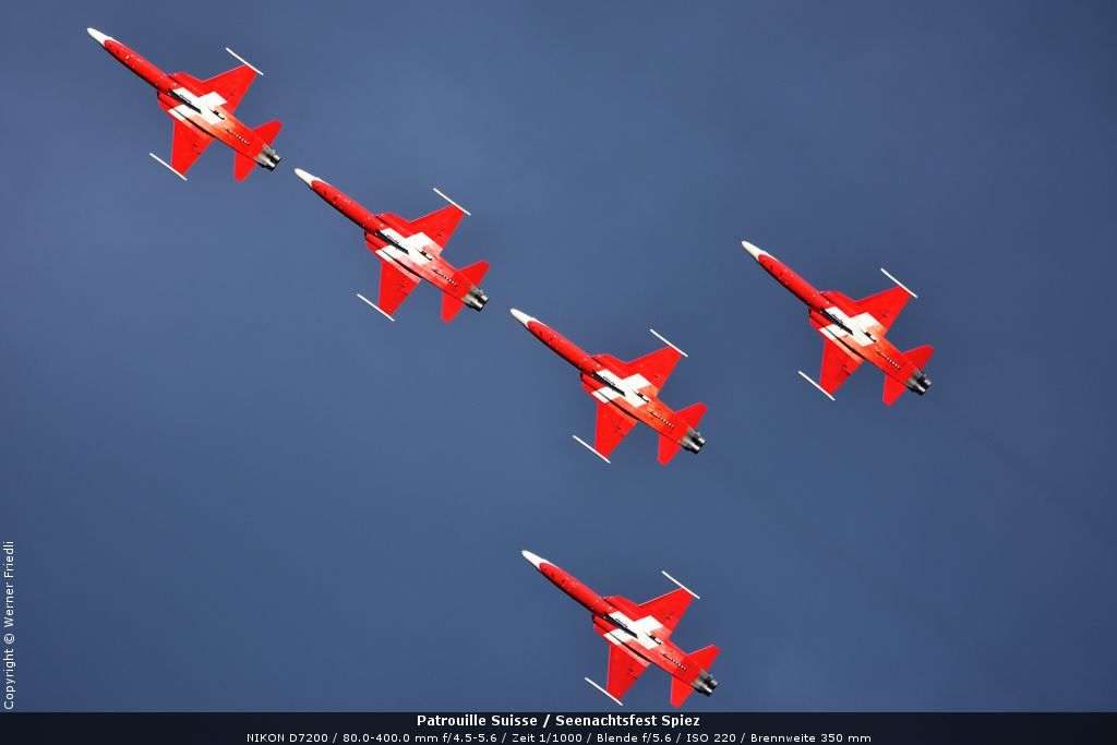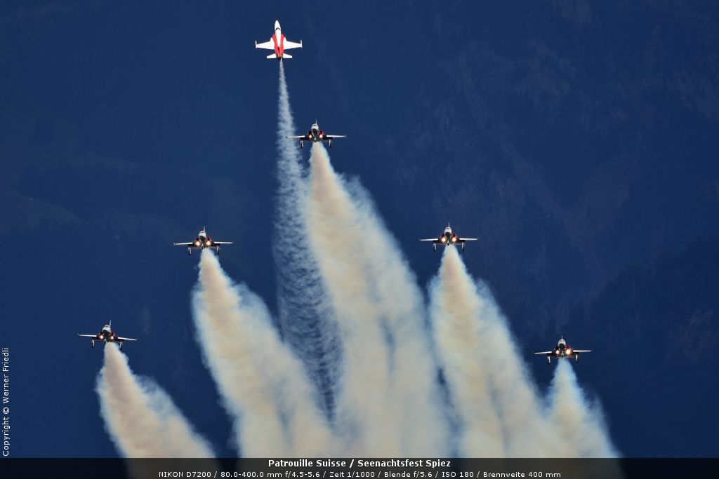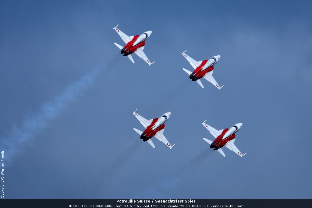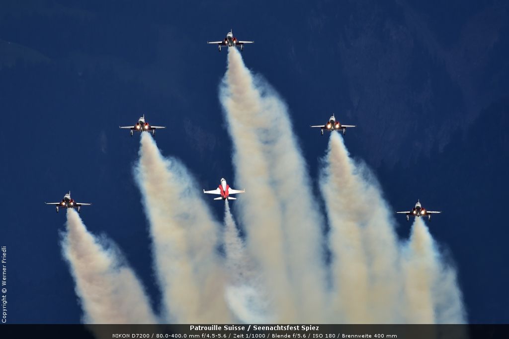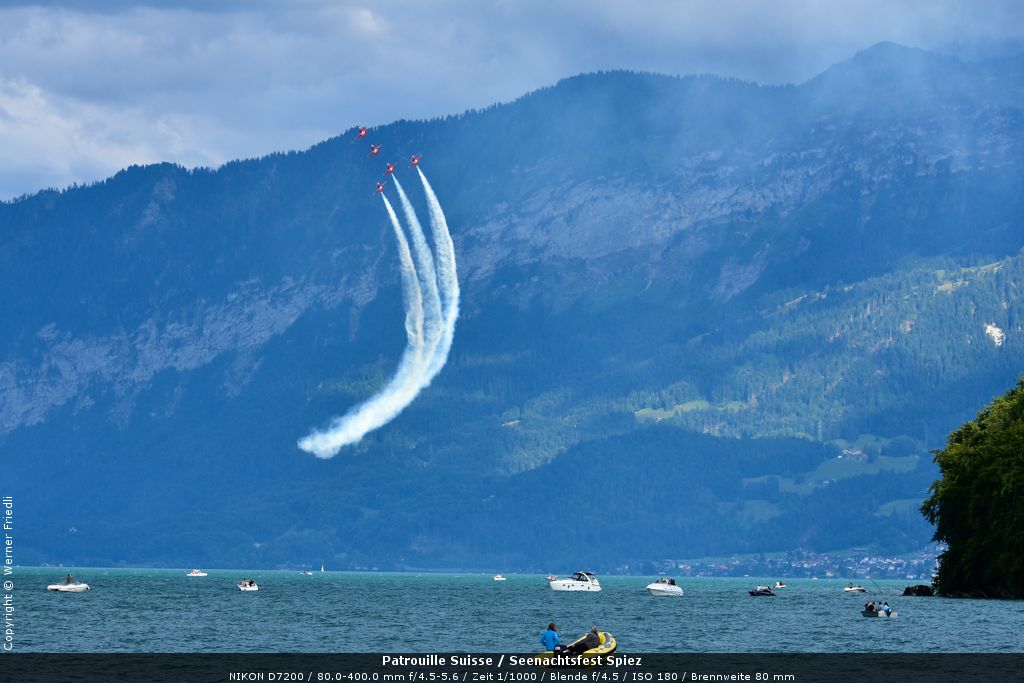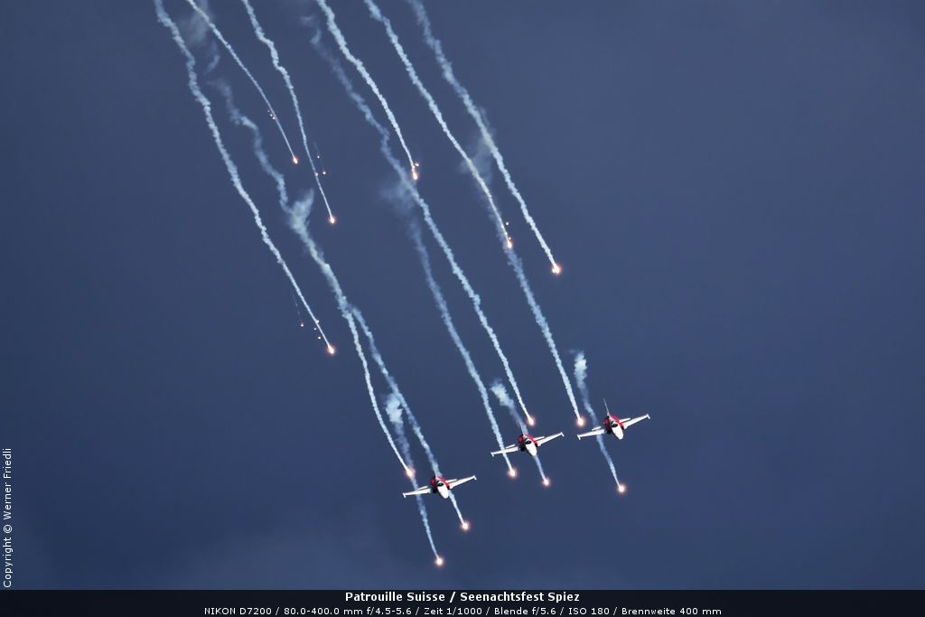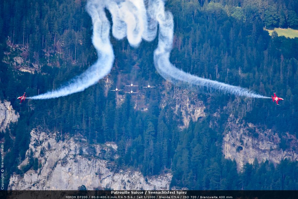 Gleich drei Auftritte an einem Tag mussten die Piloten bewältigen, zuerst auf dem Rütli, dann ich Spiez und in der eindämmernden Nacht noch über der Stadt Basel. Die Vorführung in der Spiezer Bucht ist den Piloten dabei sehr gut gelungen, und sehr viele Zuschauer, die diese Art des Formations-Kunstfluges mit Jets bisher nicht kannten, waren sicherlich beeindruckt.