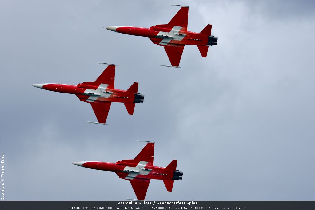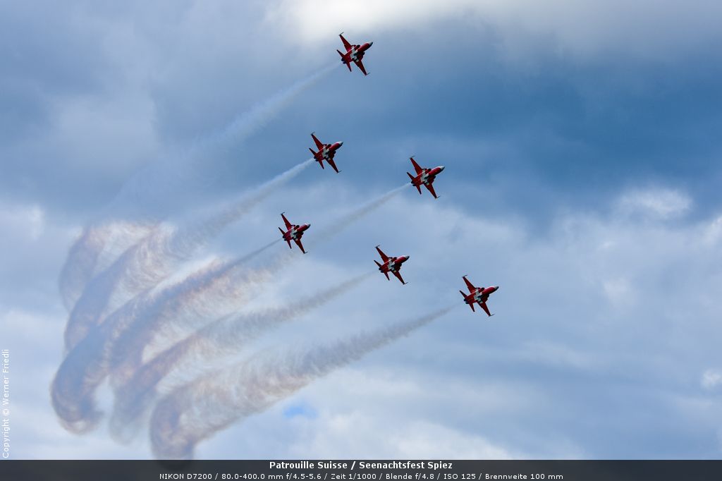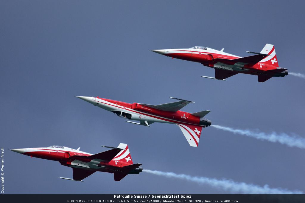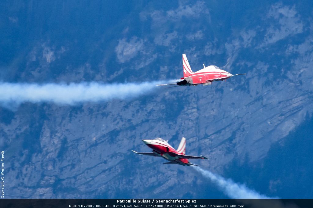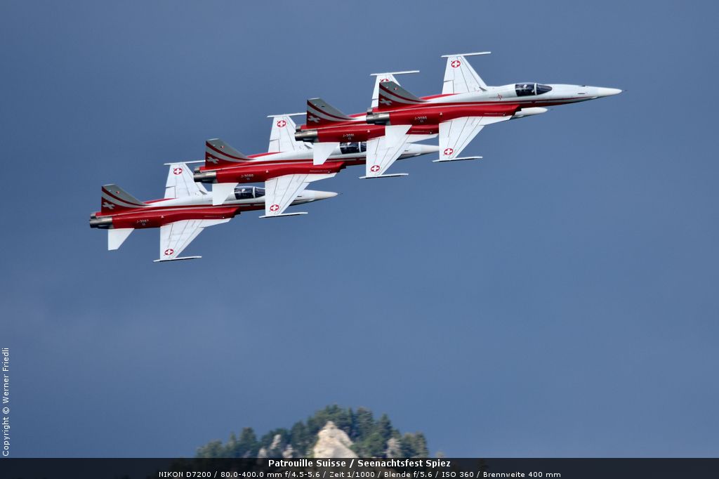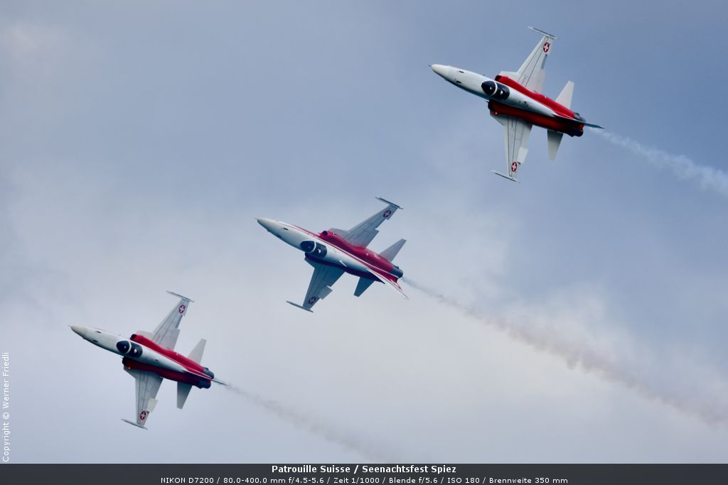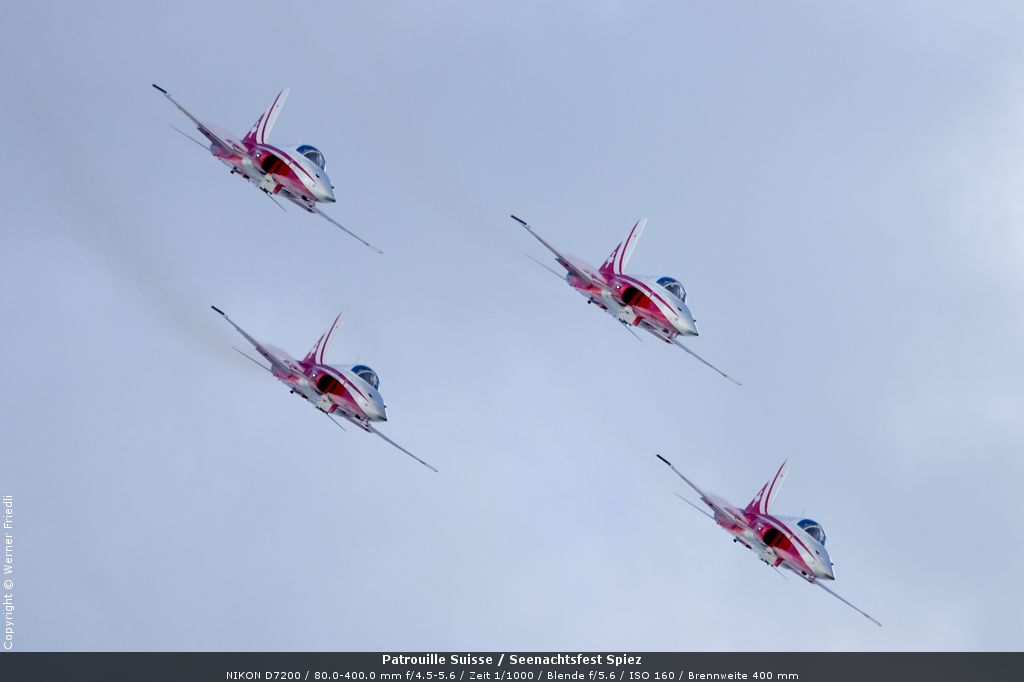 Gleich drei Auftritte an einem Tag mussten die Piloten bewältigen, zuerst auf dem Rütli, dann ich Spiez und in der eindämmernden Nacht noch über der Stadt Basel. Die Vorführung in der Spiezer Bucht ist den Piloten dabei sehr gut gelungen, und sehr viele Zuschauer, die diese Art des Formations-Kunstfluges mit Jets bisher nicht kannten, waren sicherlich beeindruckt.