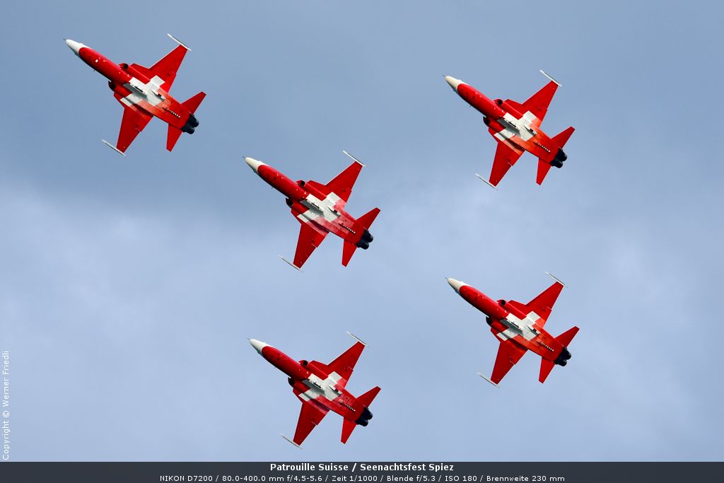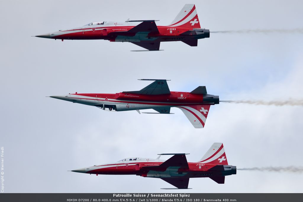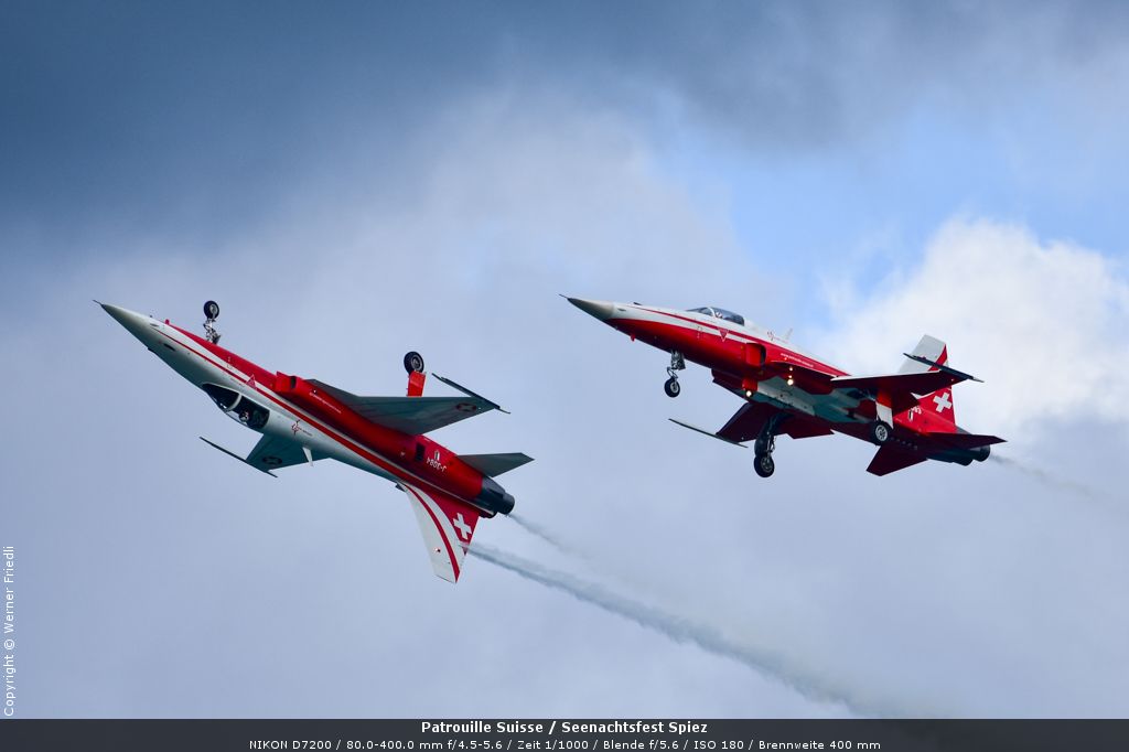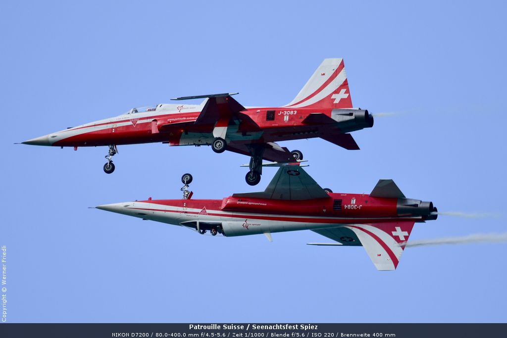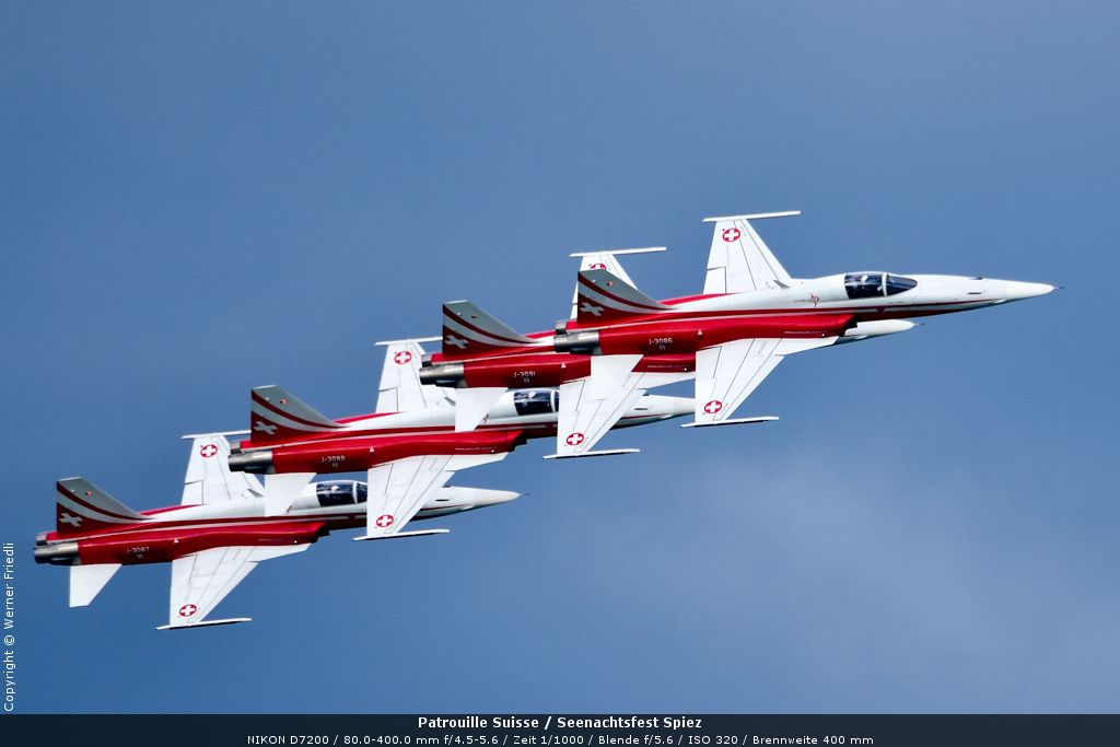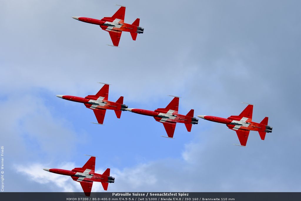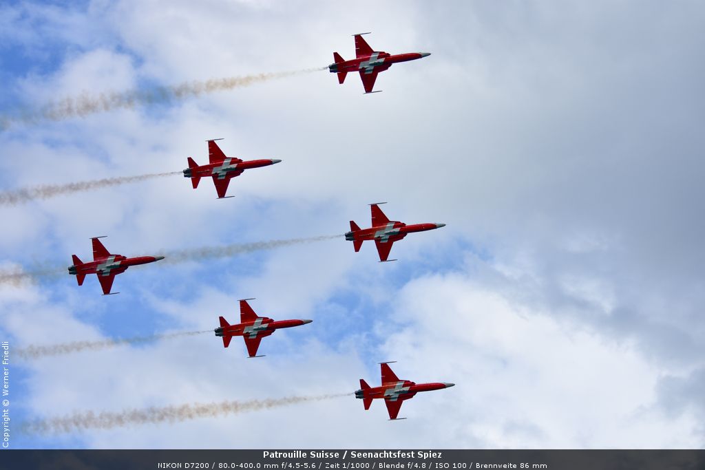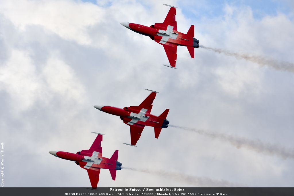 Gleich drei Auftritte an einem Tag mussten die Piloten bewältigen, zuerst auf dem Rütli, dann ich Spiez und in der eindämmernden Nacht noch über der Stadt Basel. Die Vorführung in der Spiezer Bucht ist den Piloten dabei sehr gut gelungen, und sehr viele Zuschauer, die diese Art des Formations-Kunstfluges mit Jets bisher nicht kannten, waren sicherlich beeindruckt.
