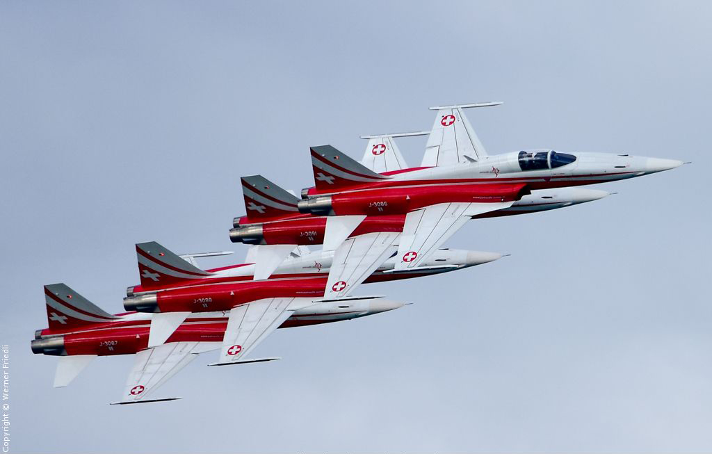 Gleich drei Auftritte an einem Tag mussten die Piloten bewältigen, zuerst auf dem Rütli, dann ich Spiez und in der eindämmernden Nacht noch über der Stadt Basel. Die Vorführung in der Spiezer Bucht ist den Piloten dabei sehr gut gelungen, und sehr viele Zuschauer, die diese Art des Formations-Kunstfluges mit Jets bisher nicht kannten, waren sicherlich beeindruckt.