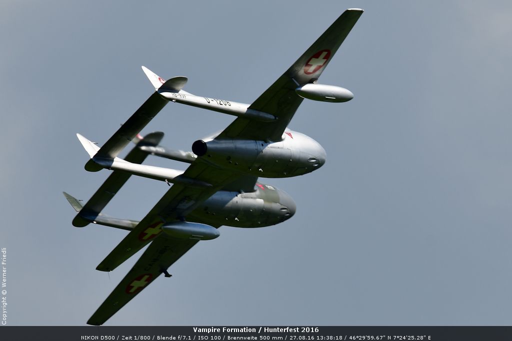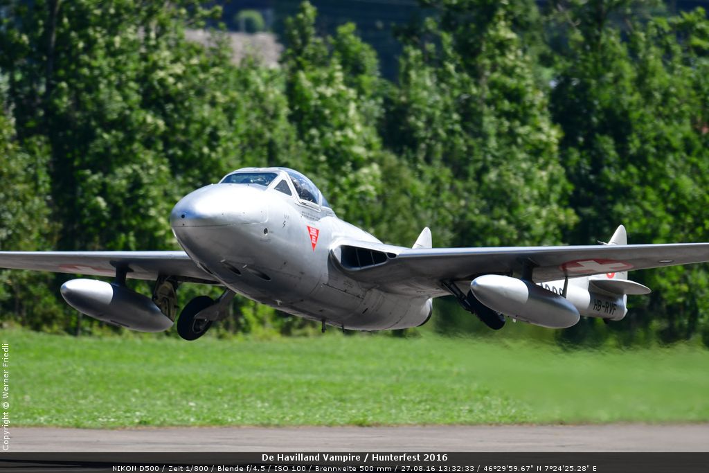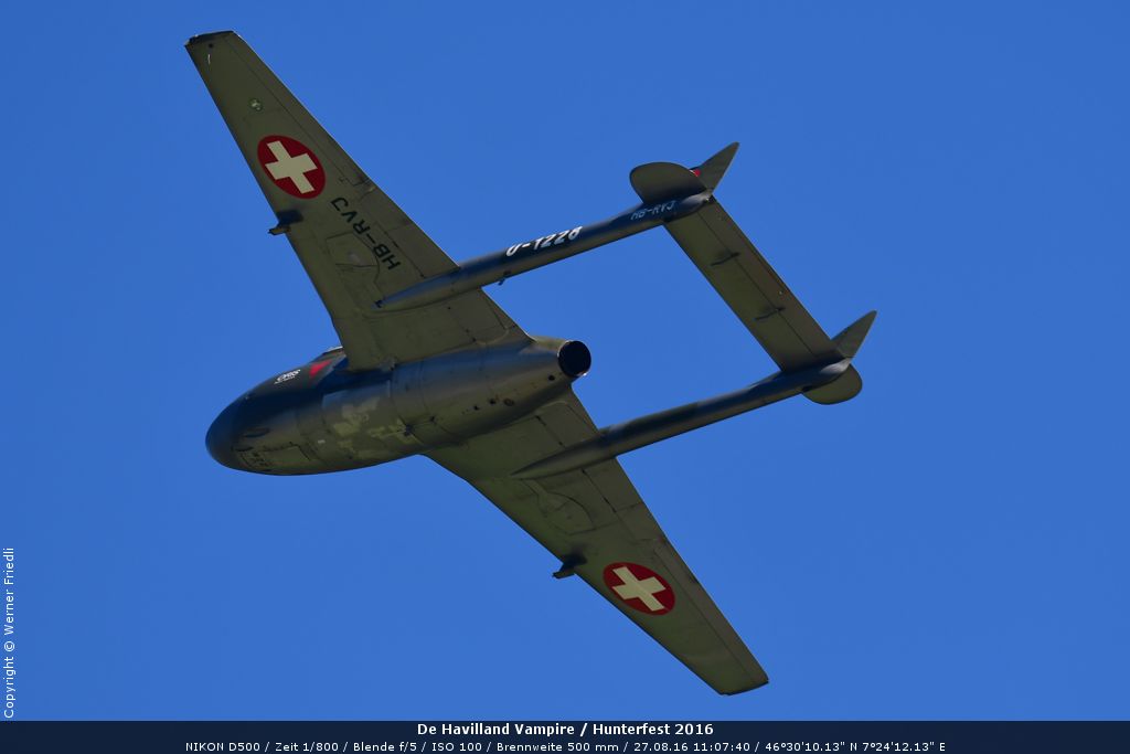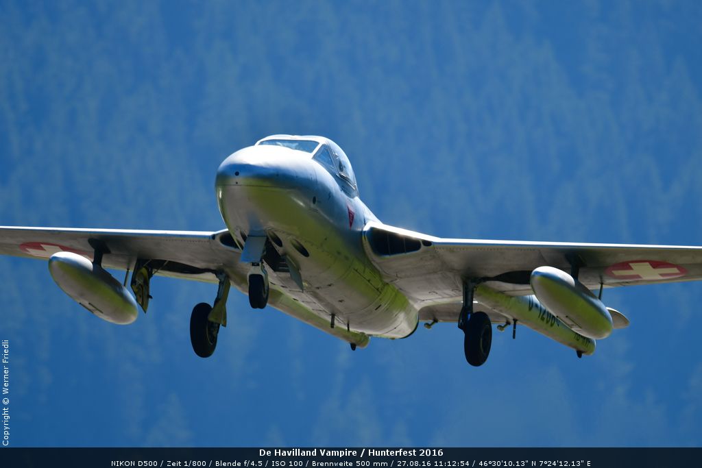 Vier Hawker Hunter waren vor Ort, die beiden Doppelsitzer aus Altenrhein und der Doppelsitzer aus Ambri. Natürlich war auch der Papyrus-Hunter mit von der Partie. Geflogen wurde die Maschine von Hans-Peter Reusser! Auch die Vampire waren gleich zu dritt in St. Stephan, zwei Doppelsitzer und ein Einsitzer.