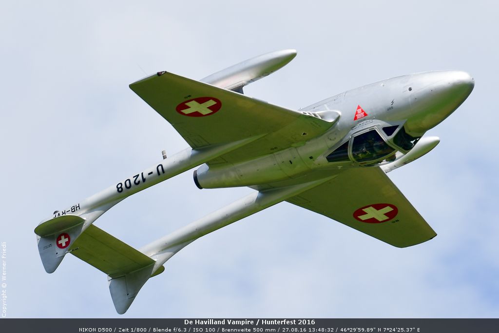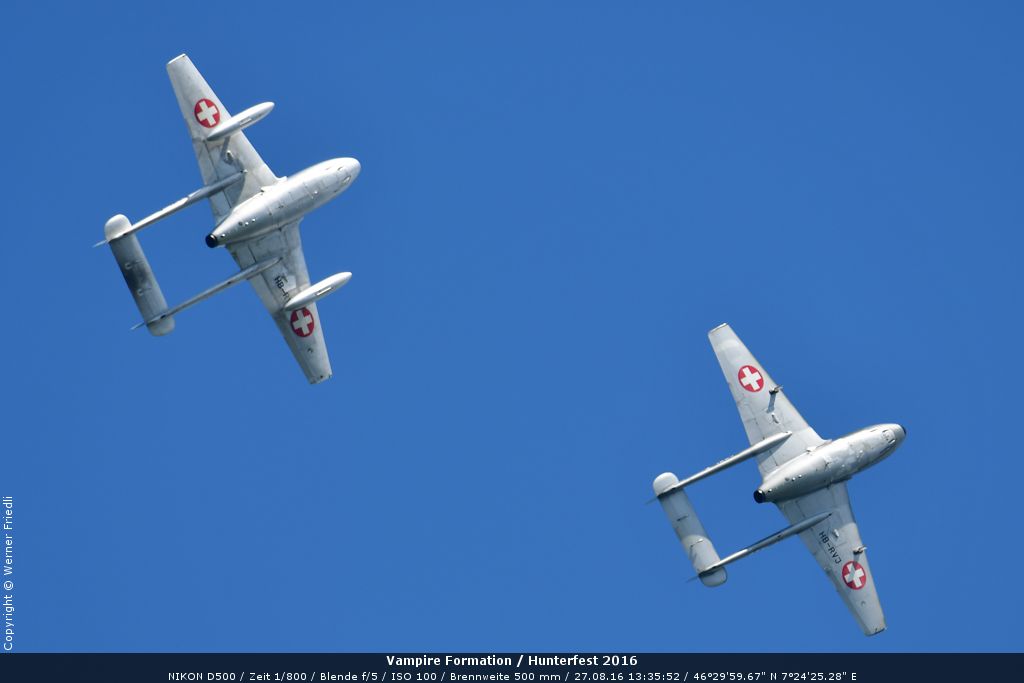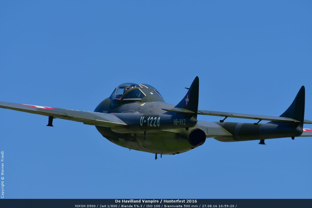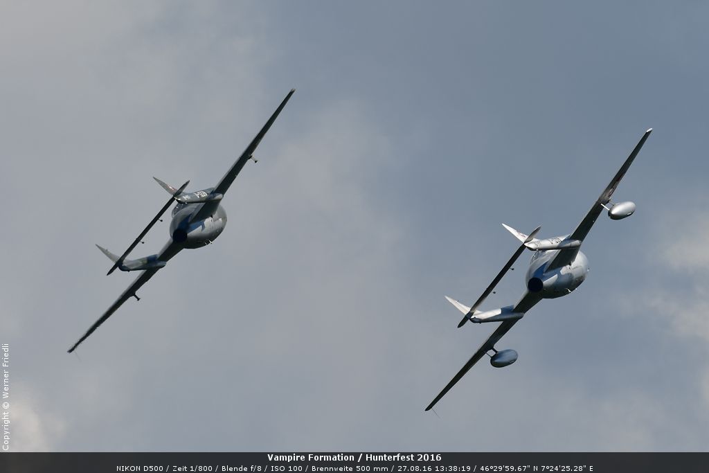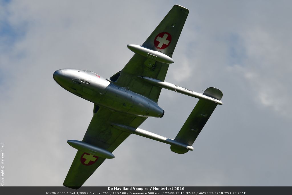 Vier Hawker Hunter waren vor Ort, die beiden Doppelsitzer aus Altenrhein und der Doppelsitzer aus Ambri. Natürlich war auch der Papyrus-Hunter mit von der Partie. Geflogen wurde die Maschine von Hans-Peter Reusser! Auch die Vampire waren gleich zu dritt in St. Stephan, zwei Doppelsitzer und ein Einsitzer.