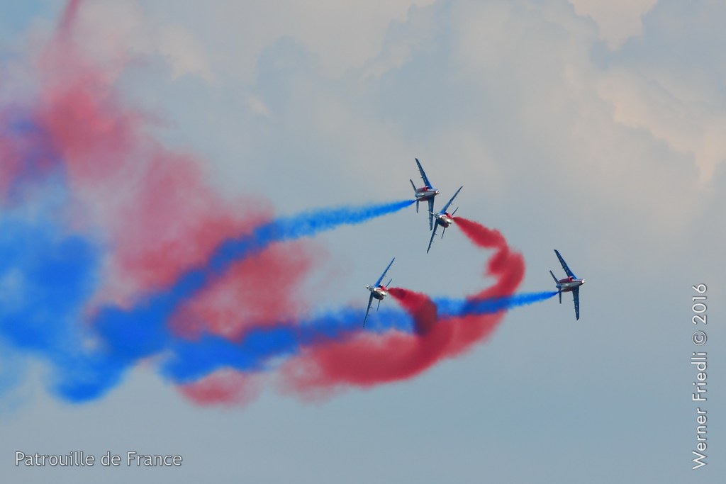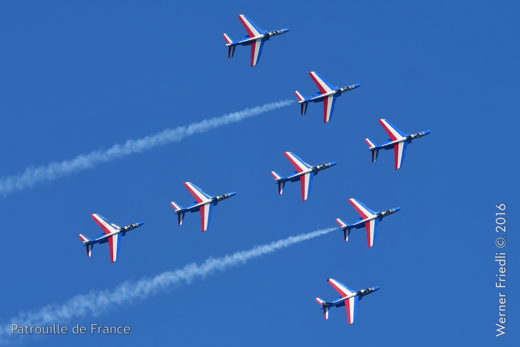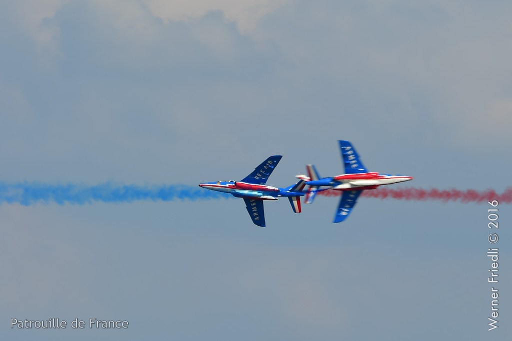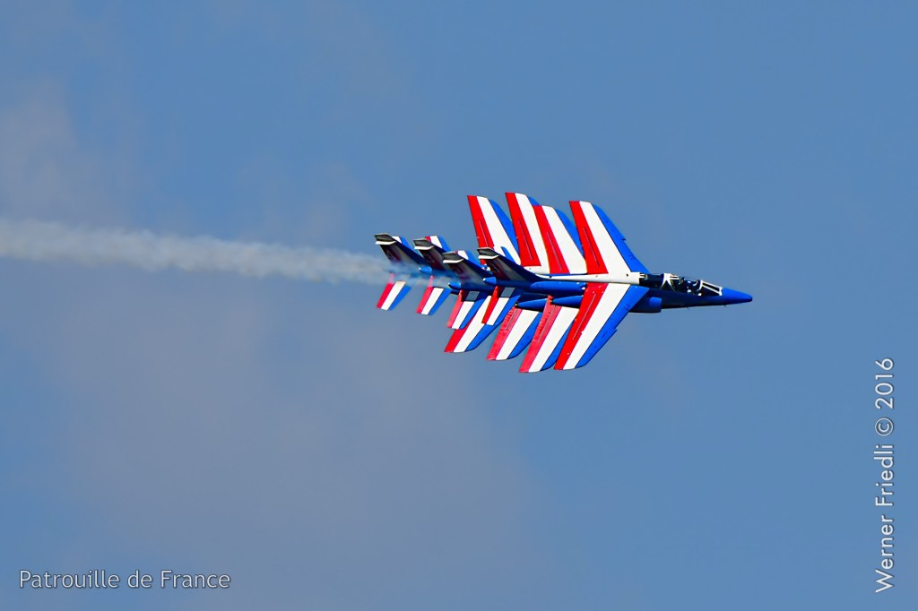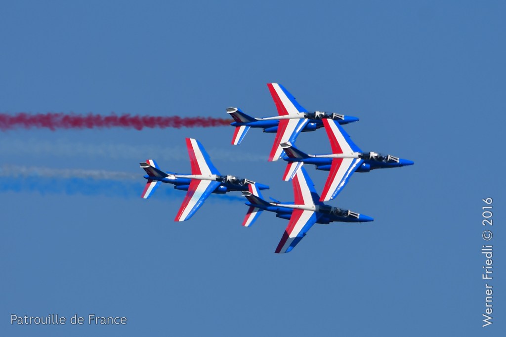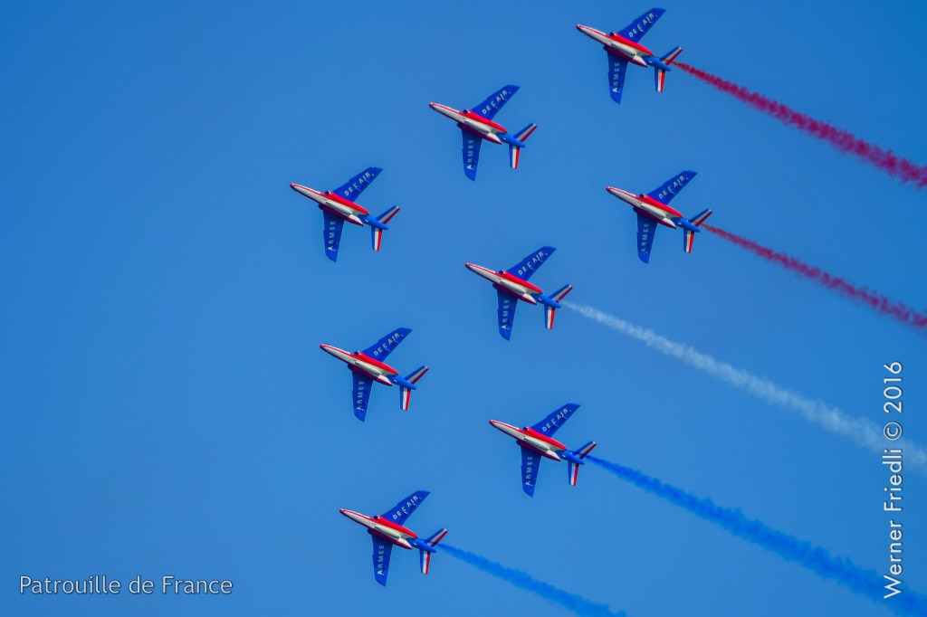 Um 15 Uhr dann kamen schon die acht Alpha-Jets der Patrouille de France angeflogen. Unter den Klängen der Marseillaise begann die Vorführung des Aerobaticteams und die Zuschauer wurden nicht enttäuscht. Die Patrouille de France zeigte eine sehr schöne Vorführung, allerdings staunte ich nicht schlecht, dass ich meist voll zoomen musste, um die Alpha-Jets fotografieren zu können. Sogar Vorbeiflüge im Verband mussten meist mit sehr viel Brennweite fotografiert werden.