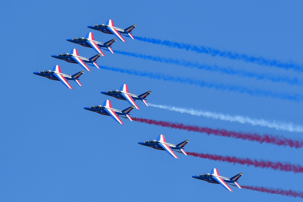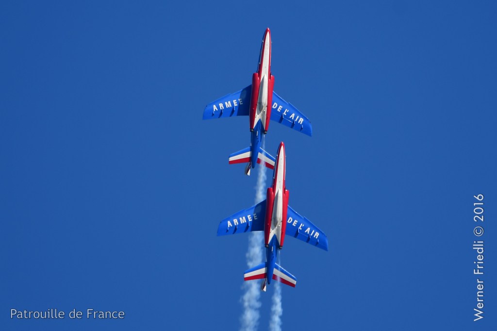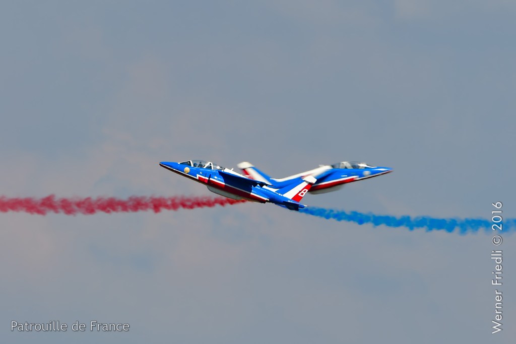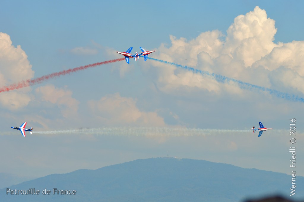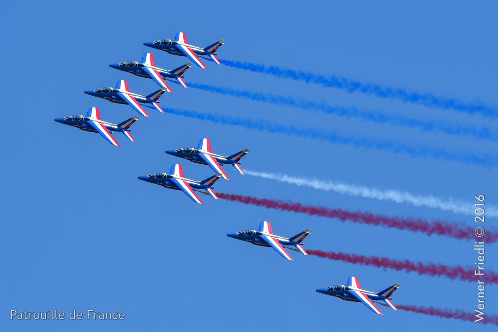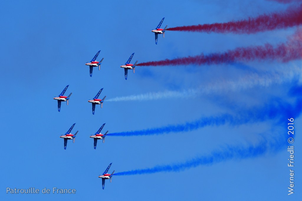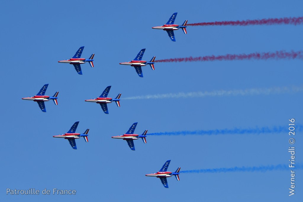 Um 15 Uhr dann kamen schon die acht Alpha-Jets der Patrouille de France angeflogen. Unter den Klängen der Marseillaise begann die Vorführung des Aerobaticteams und die Zuschauer wurden nicht enttäuscht. Die Patrouille de France zeigte eine sehr schöne Vorführung, allerdings staunte ich nicht schlecht, dass ich meist voll zoomen musste, um die Alpha-Jets fotografieren zu können. Sogar Vorbeiflüge im Verband mussten meist mit sehr viel Brennweite fotografiert werden.