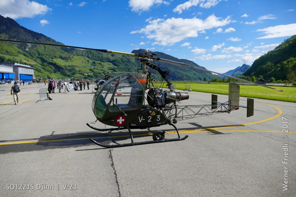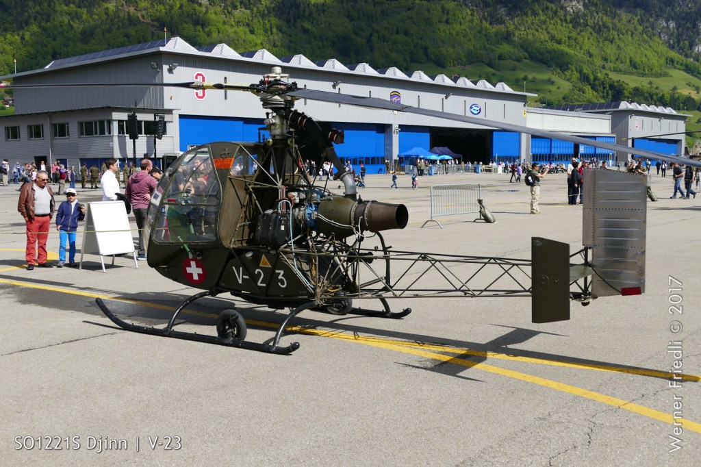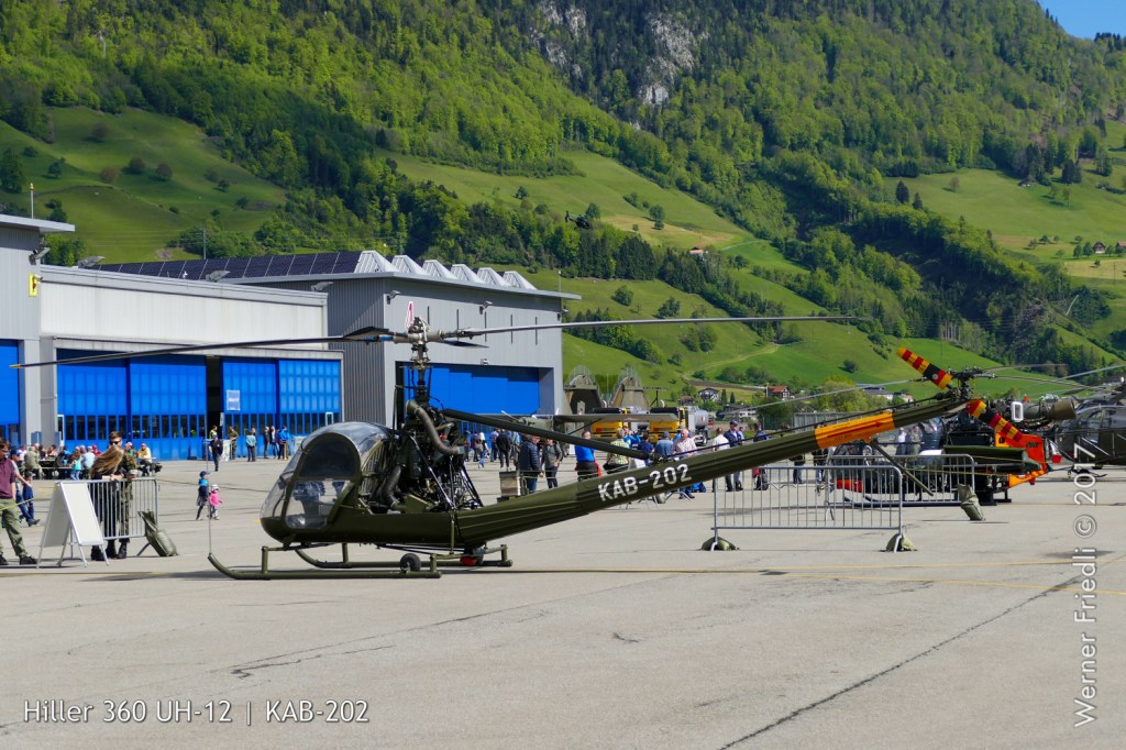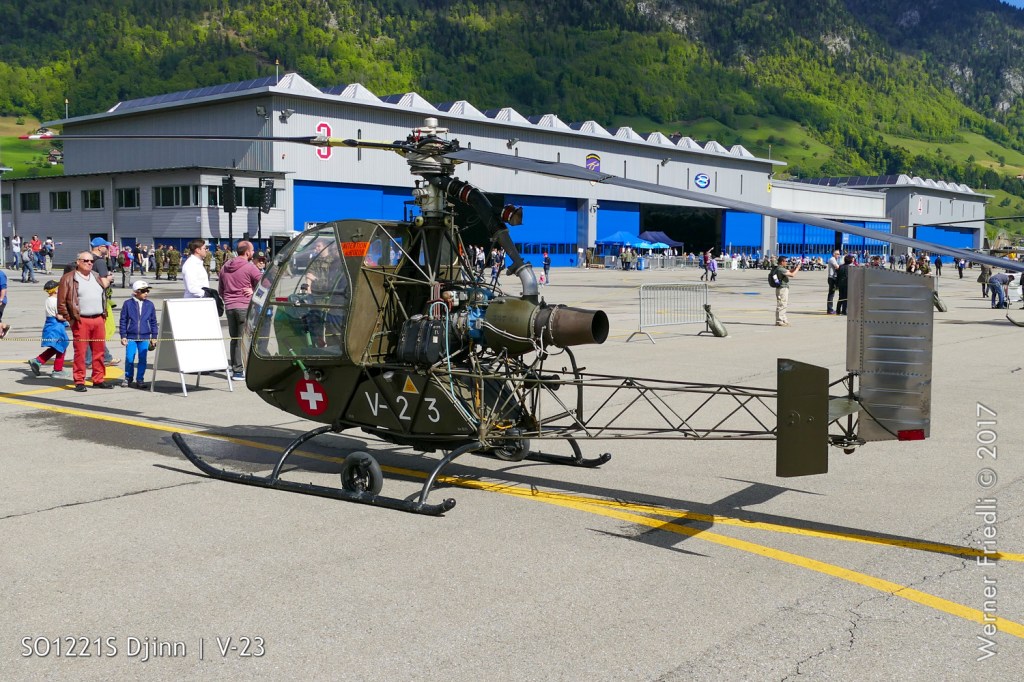 Die Anfänge der Fliegerei mit Hubschraubern der Schweizer Luftwaffe zeigten ein paar Exponate auf, welche vom Flieger- und Flab Museum aus Dübendorf zur Verfügung gestellt wurden. Eine Hiller UH-12B, von welcher drei Stück im Einsatz standen sowie eine Sud-Ouest SO 1221 Djinn, von diesem Typ standen zwischen 1958 und 1966 vier Stück bei den Schweizer Fliegertruppen im Einsatz.