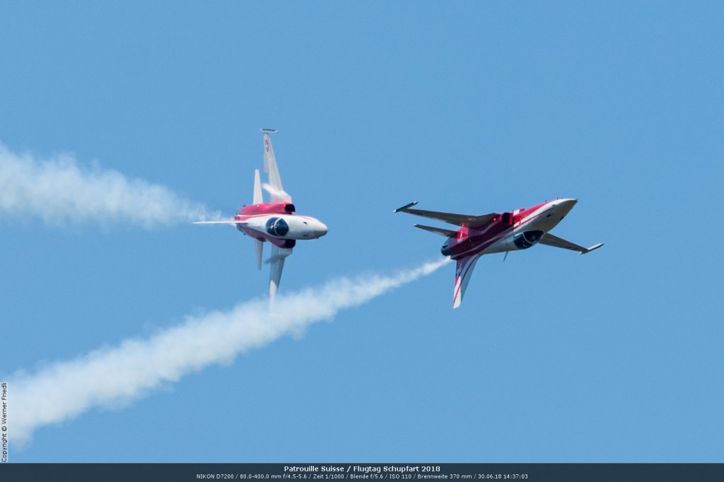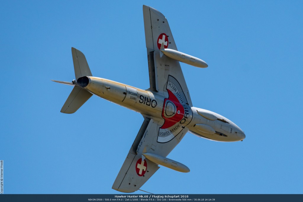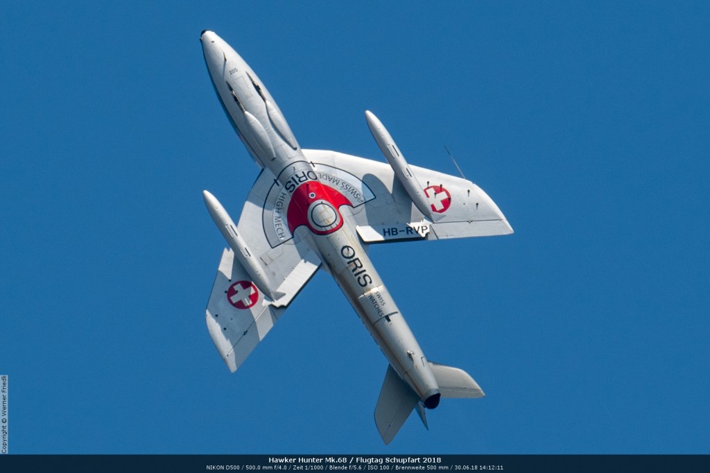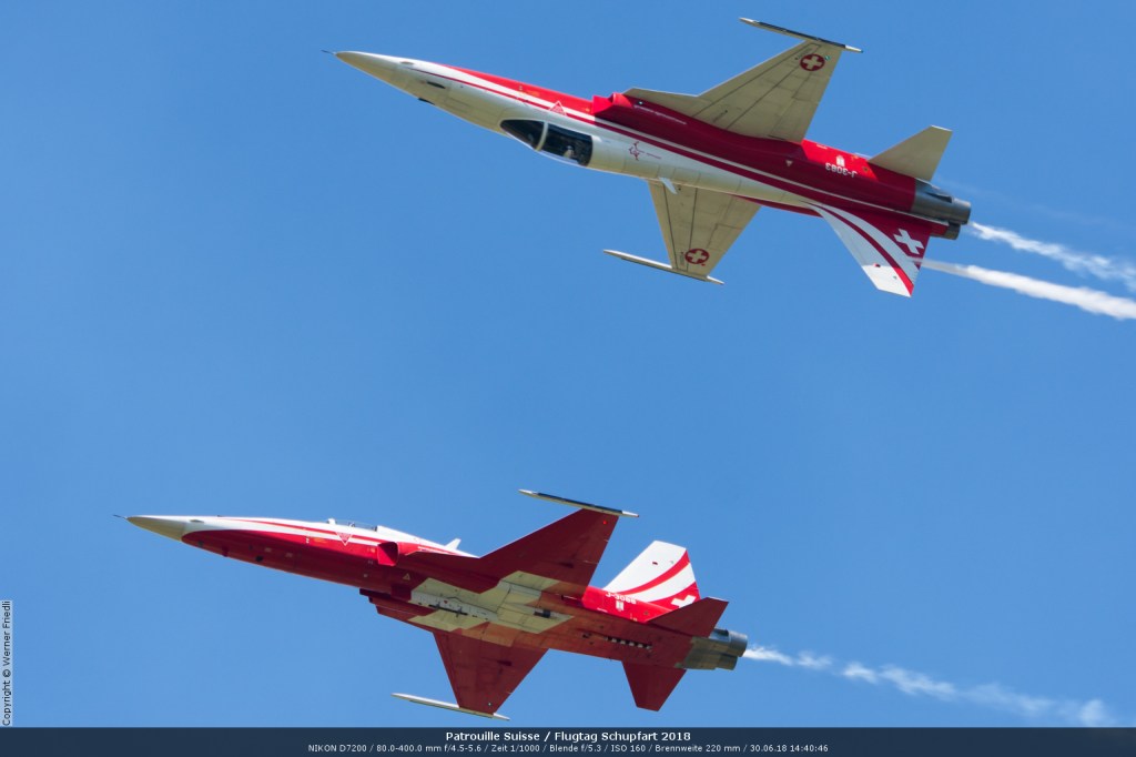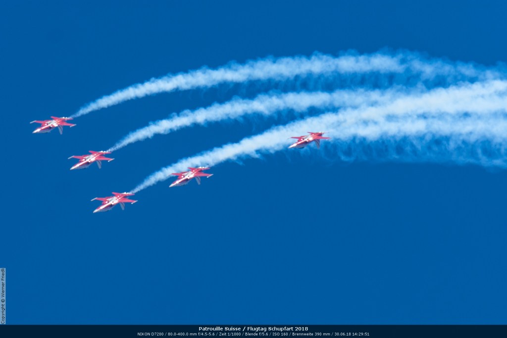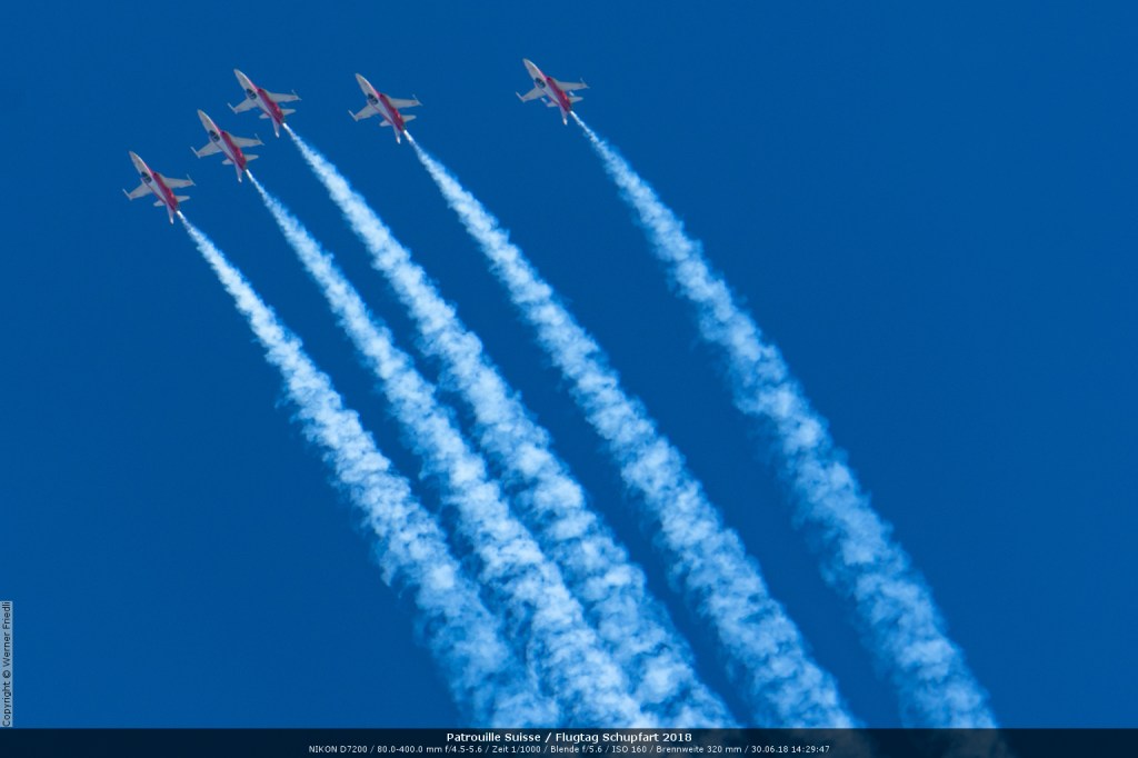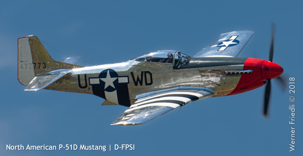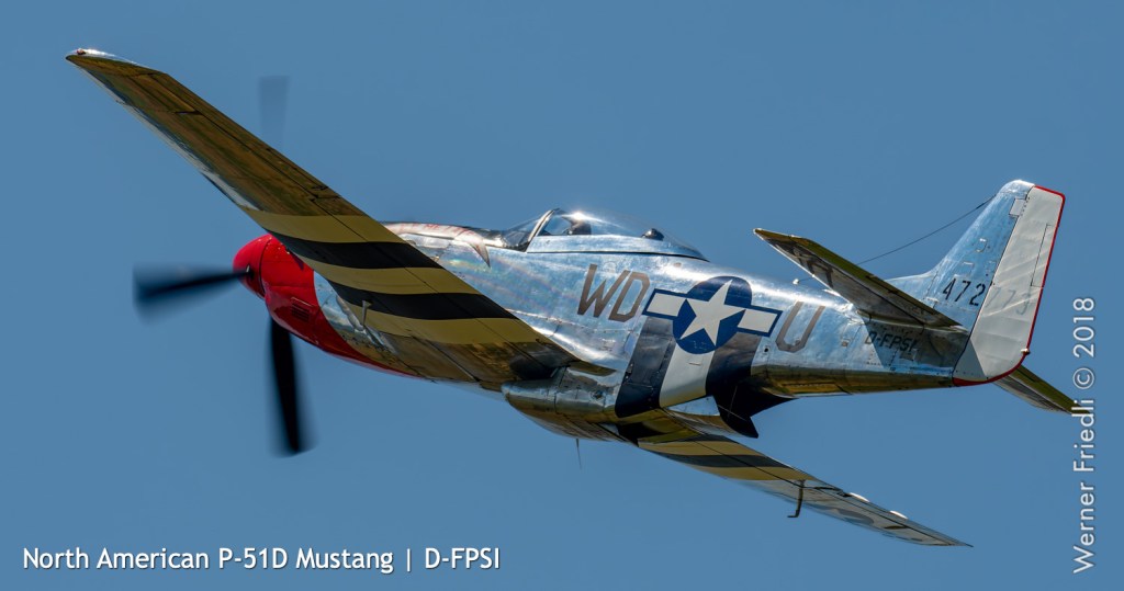 Düsenjets, Kunstflugstaffeln und Warbirds waren angesagt. Dazu Motorkunstflug, sowie Segel- und Modellflug. Für mich war die Vorführung der NA P-51D Mustang See me later – 44-72773 der Höhepunkt der Displays. Die Maschine hat den Besitzer im Jahre 2016 gewechselt und wird seither deutlich dynamischer und fotogener vorgeflogen. Nachdem ich die Maschine in Ecuvillens noch auf der Anreise gesehen hatte, wollte ich mir dieses schöne Sujet nicht entgehen lassen. Die Vorführung war denn auch erstklassig.