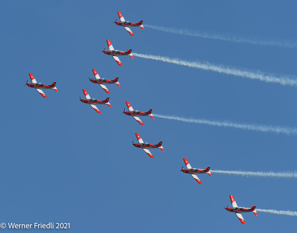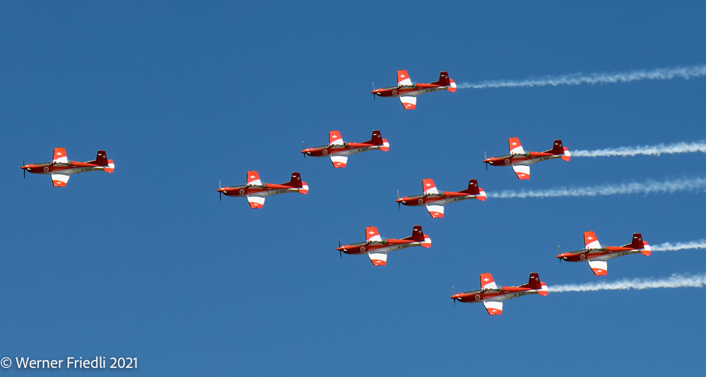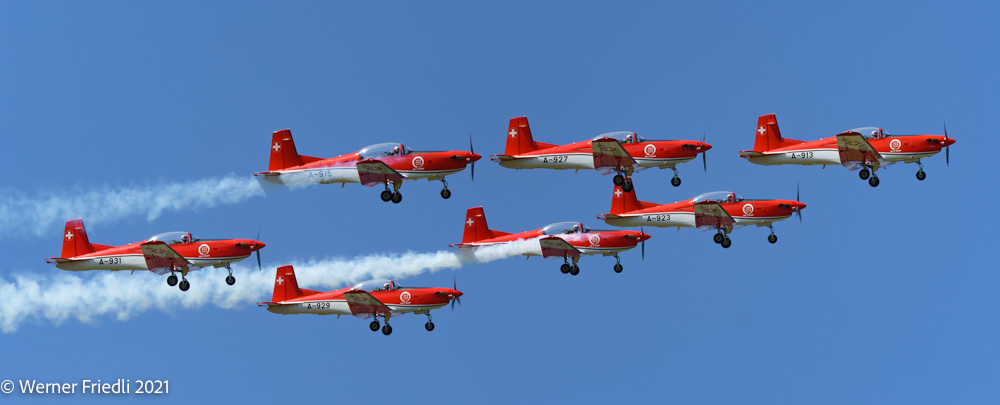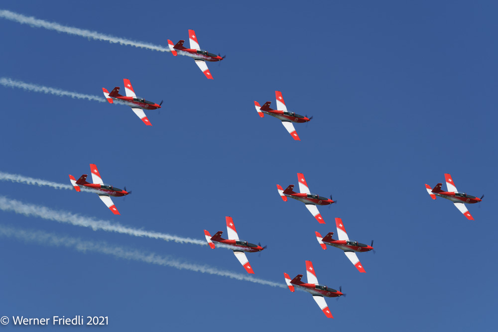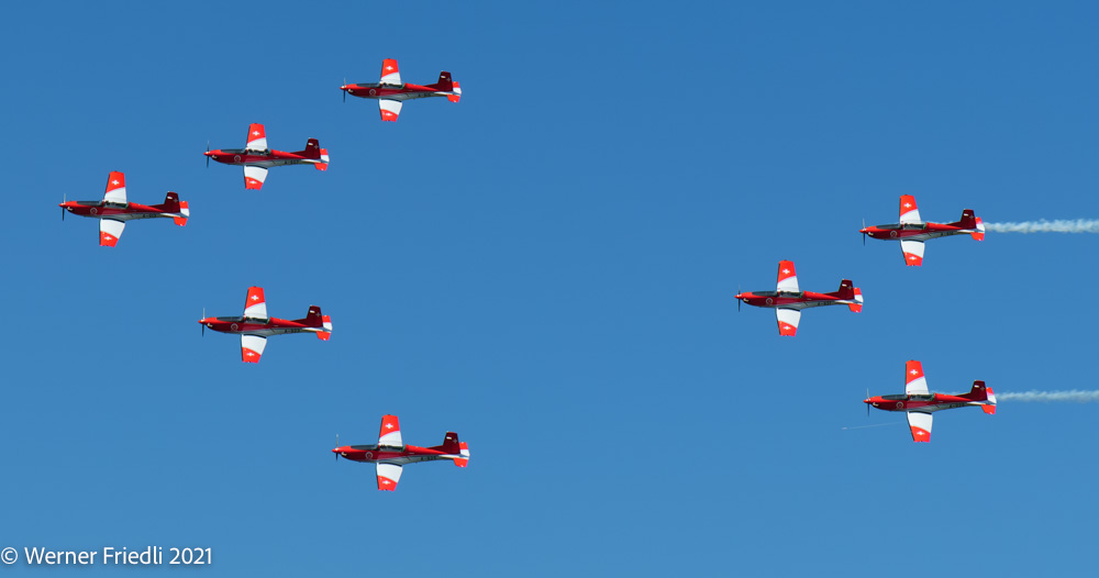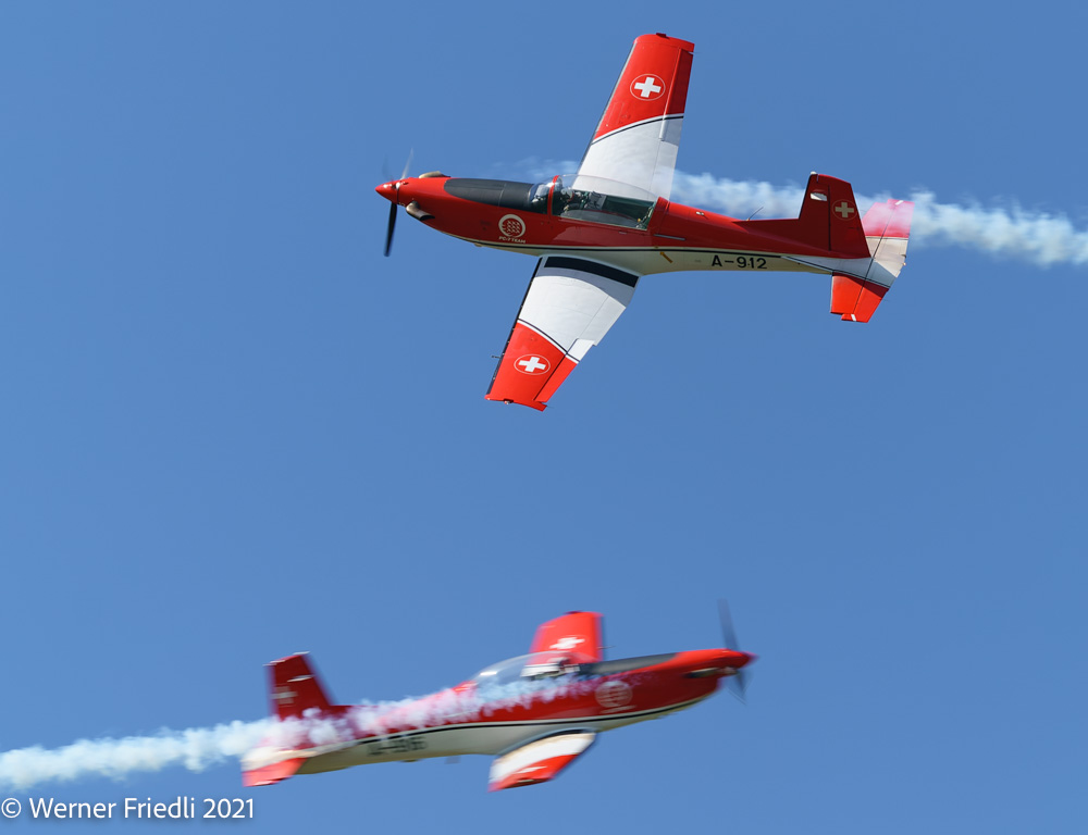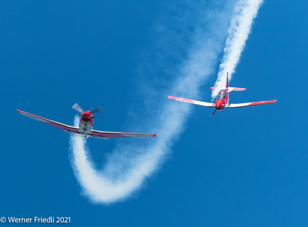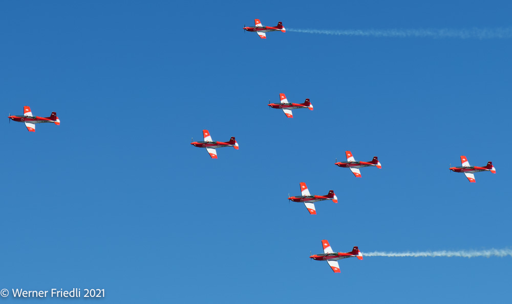 Früher war das PC-7 Team ein seltener Gast in Grenchen. Seit sich das Team entschlossen hat, die jährlichen Trainings an den verschiedensten Standorten in der Schweiz durchzuführen, profitiert auch der Flughafen Grenchen von dieser Neuerung. Bereits am 31. Mai 2021 waren die schnittigen rot-weissen PC-7 am Grenchner Himmel zu bestaunen. Es lohnt sich ab und zu ein Blick in die Facebook-Seite des Teams, denn dort werden die aktuellen Trainings des Teams immer frühzeitig angekündigt.