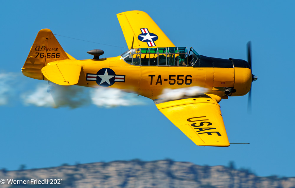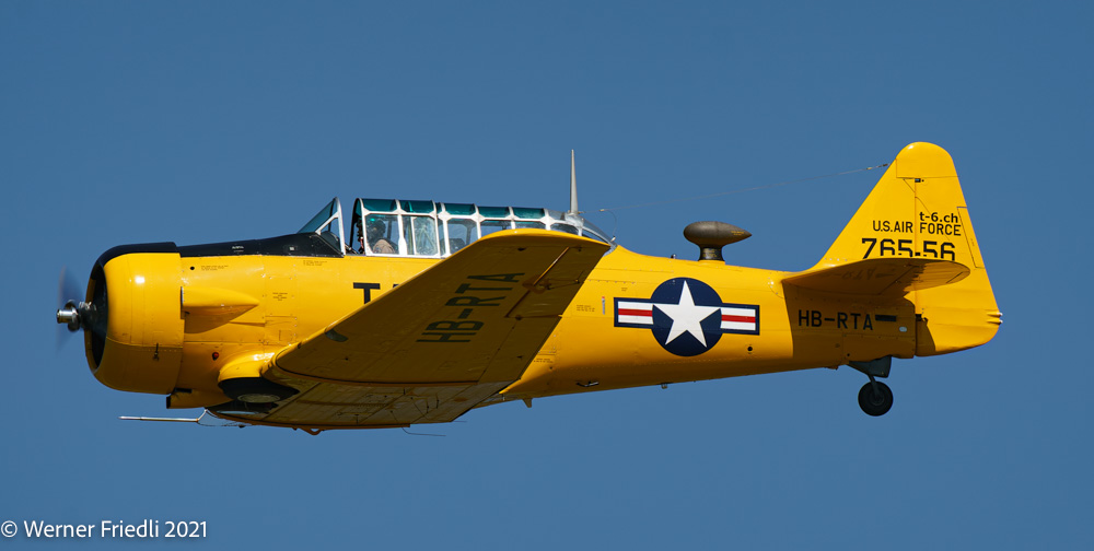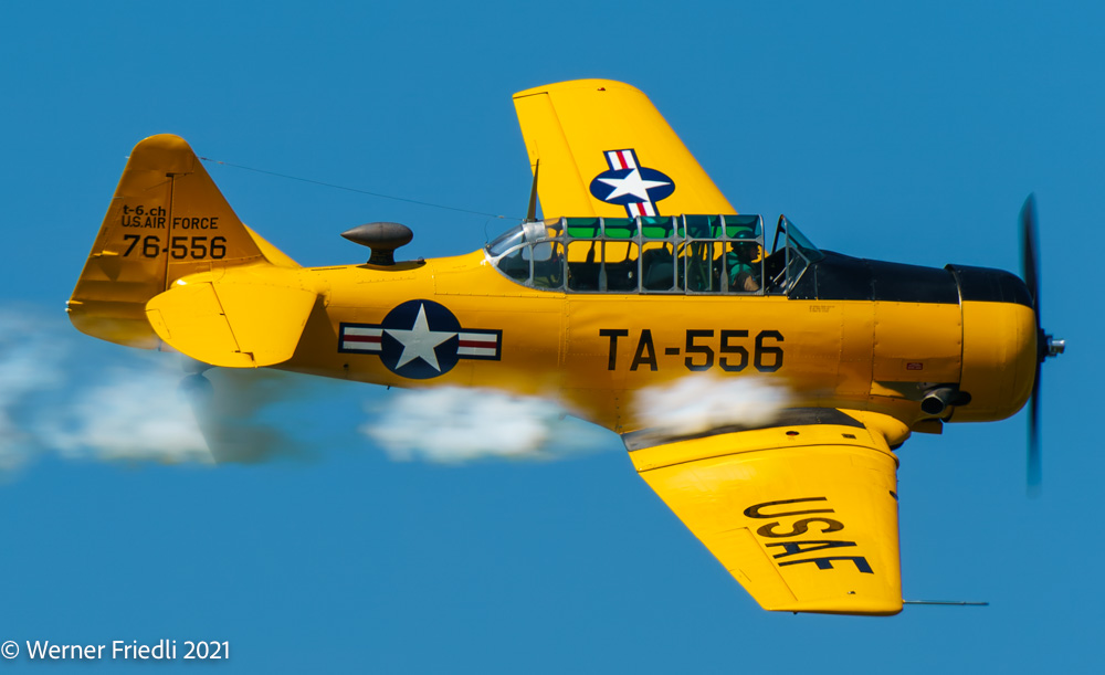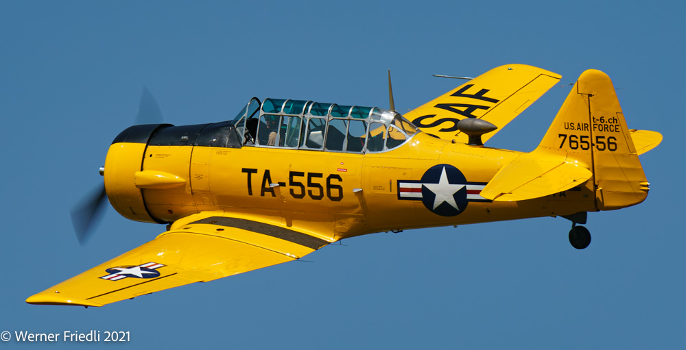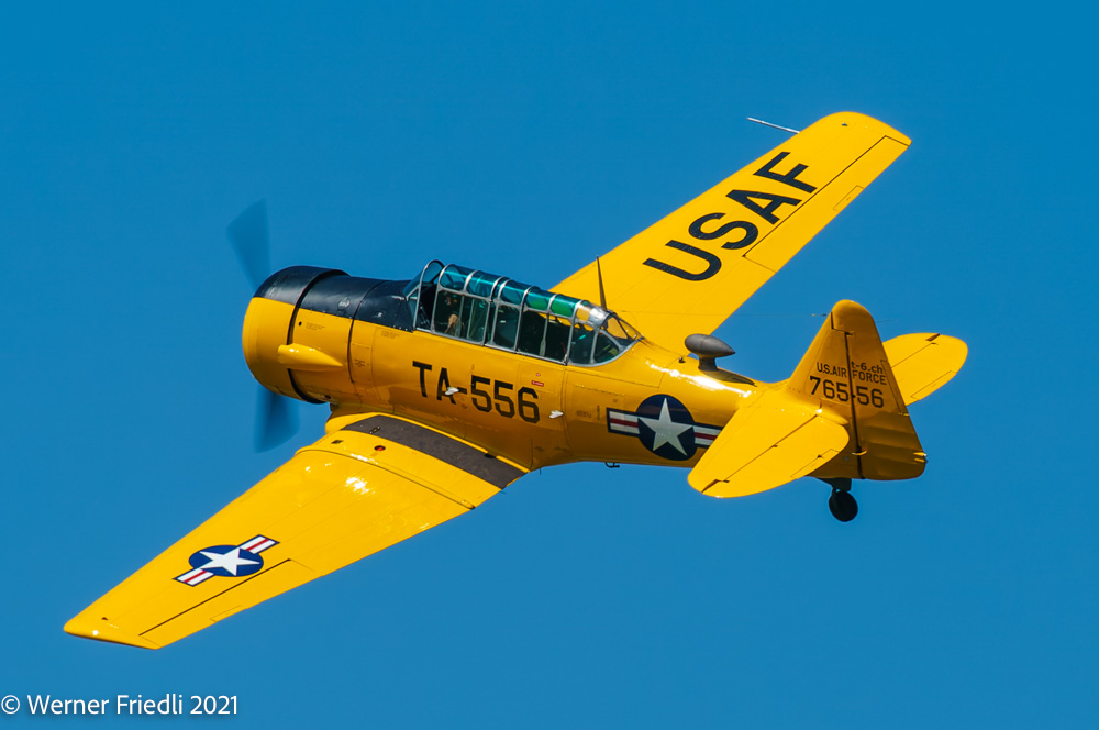 Das Flugzeug mit der Seriennummer 76-3556 wurde am 7. Juli 1941 im kalifornischen Inglewood zunächst als AT-6A fertiggestellt, dann aber von der RAF als Harvard IIA mit der RAF Serien-Nummer AJ 586 übernommen. Nachdem die 76-3556 zunächst auf der RAF-Ausbildungsbasis Kingston in Kanada gedient hat, wurde sie später von der Royal Canadian Air Force in das Squadron 401 in St. Hubert übergeführt, wo sie am 11. Oktober 1960 ausgemustert wurde.