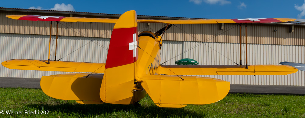 Die Bücker Bü 133 C wurde 1940 bei Doflug AG in Altenrhein gebaut mit der Werknummer 36. Bis 1968 war diese Maschine im Einsatz bei der Schweizer Luftwaffe.