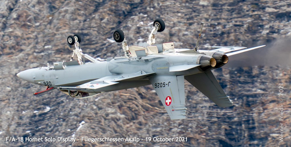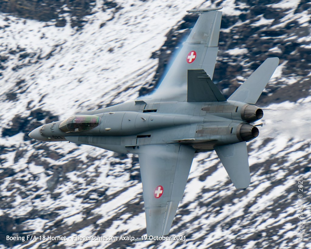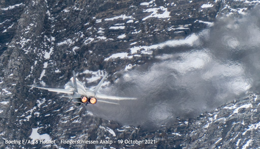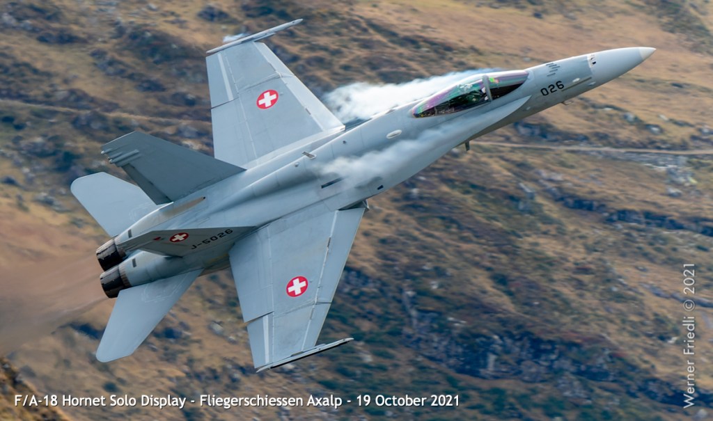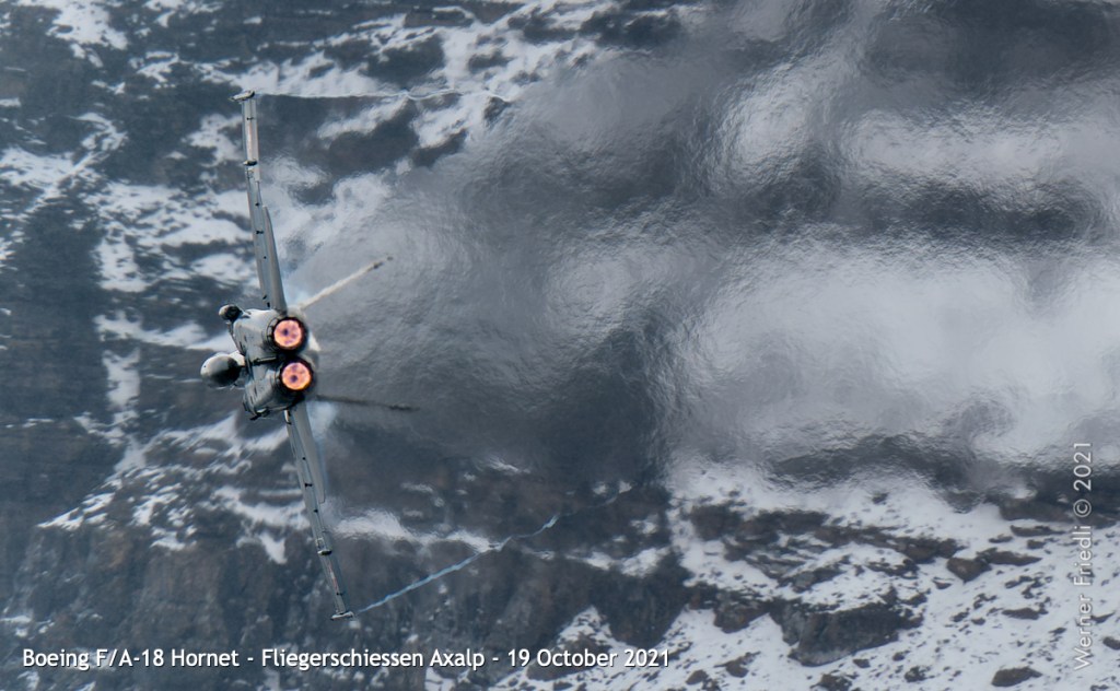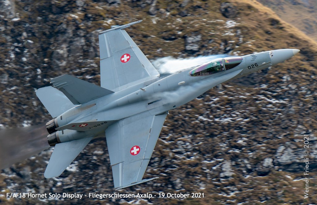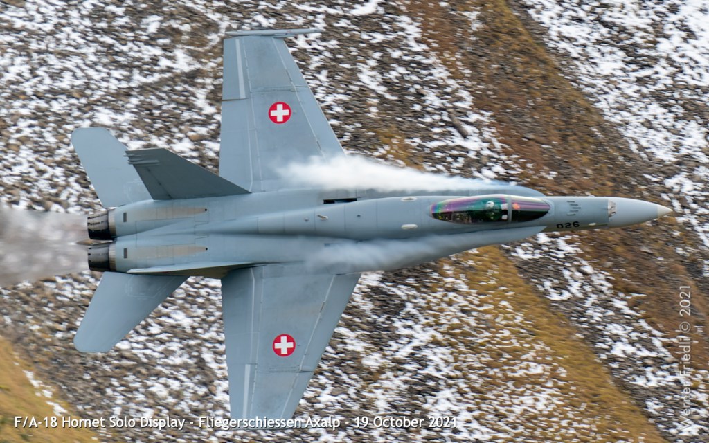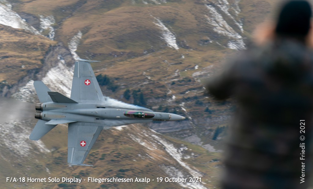 Die Eröffnung der Show mit dem Anflug einer F/A-18 aus dem Tal mit Flares und kurz darauf gefolgt von einer zweiten F/A-18 durch die Lücke zwischen Tschingel und KP ist sicher reizvoll. Als Fotograf ist diese Choreographie eine echte Herausforderung.