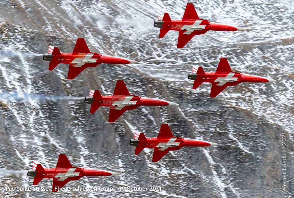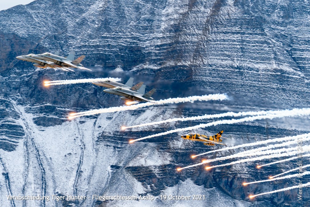 Zusammen mit vier F/A-18 der Fliegerstaffel 11 (Tigers) und viel Flares gab dies dem Anlass den angemessenen Rahmen und den Fotografen ein schönes Sujet.
