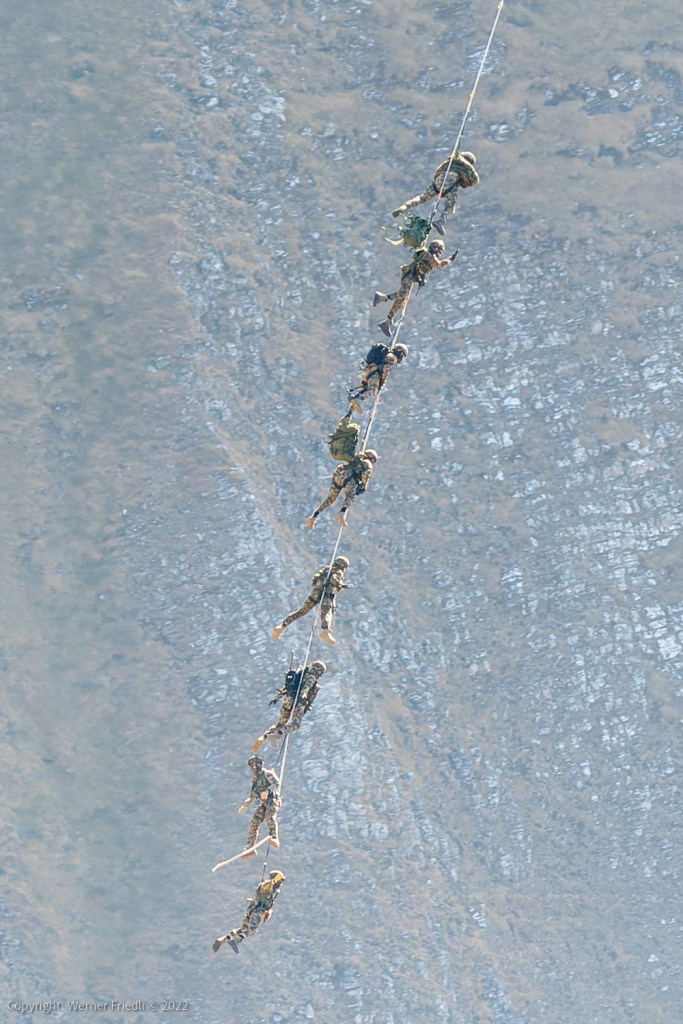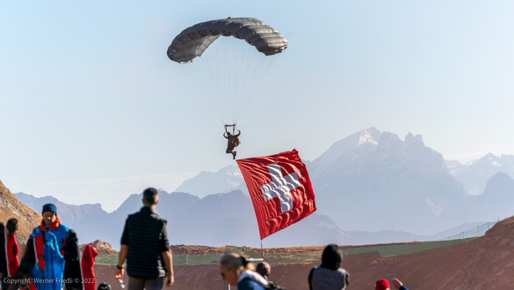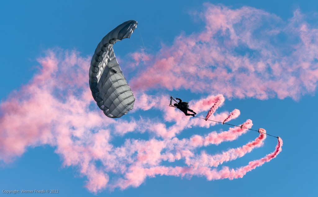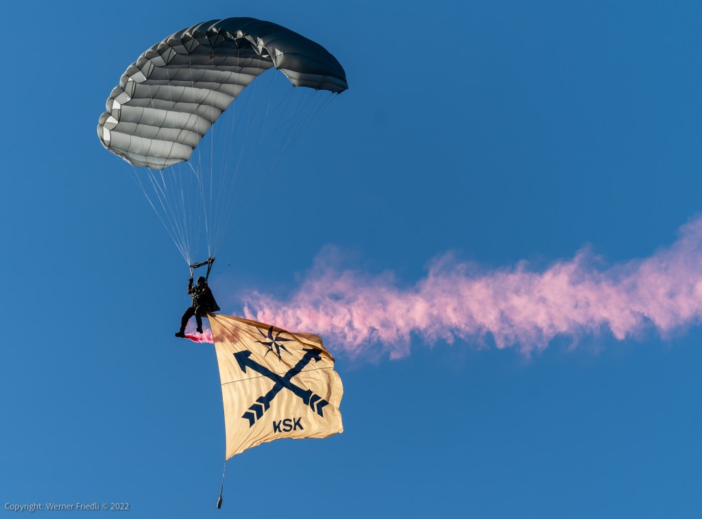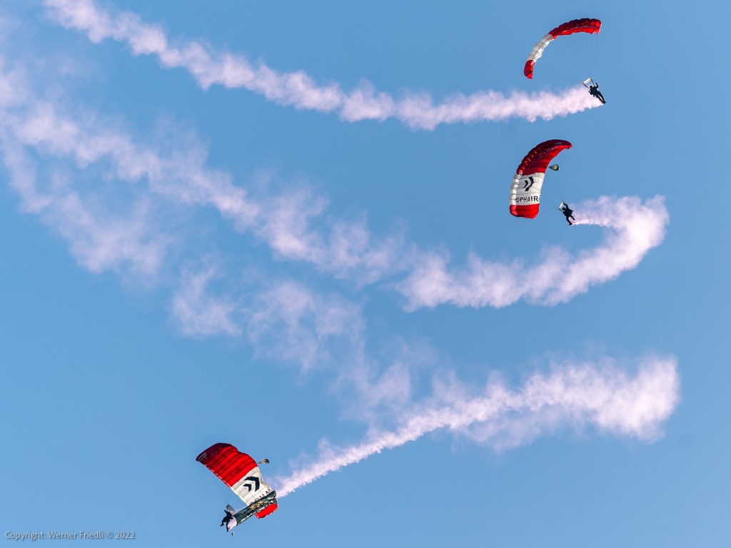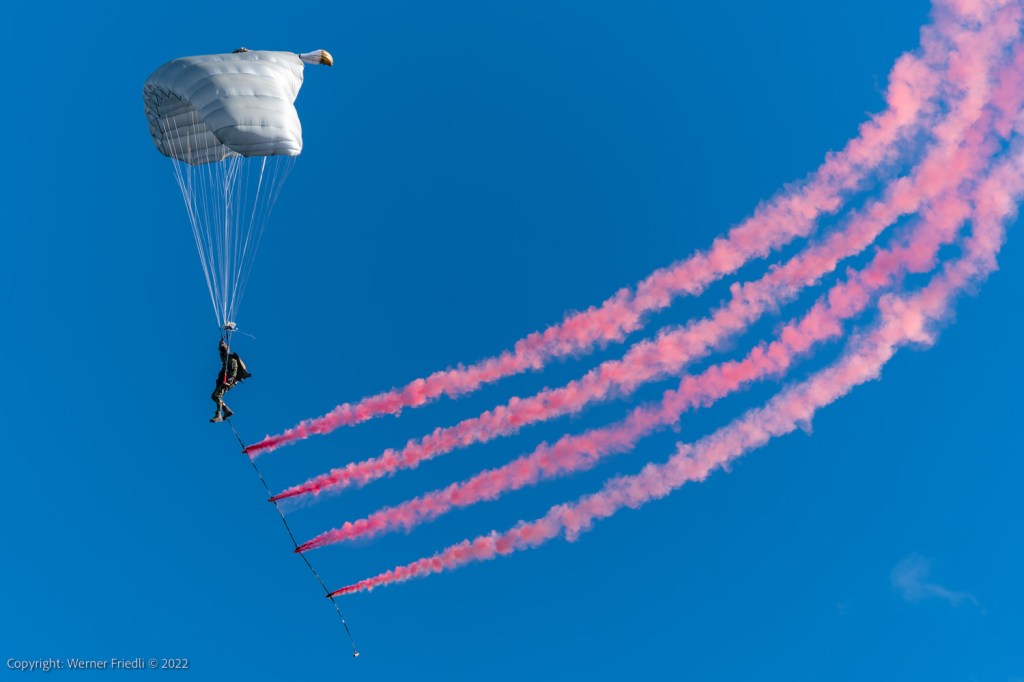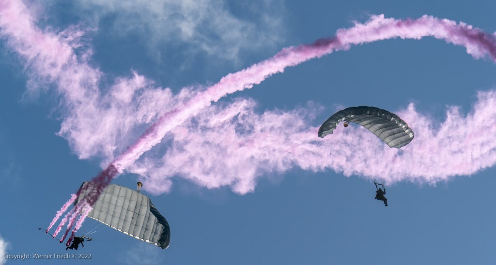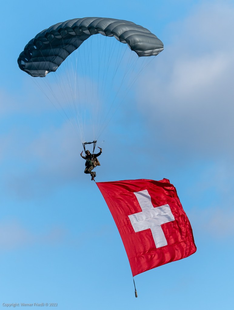 So ging es dann bis 11:15 Uhr Schlag auf Schlag weiter, wobei die vier F/A-18 der Fliegerstaffel 11 aus Meiringen das Schiessen übten und auch die Swiss Parawings eine gute Choreographie mit Fahnen und Rauch zeigten.