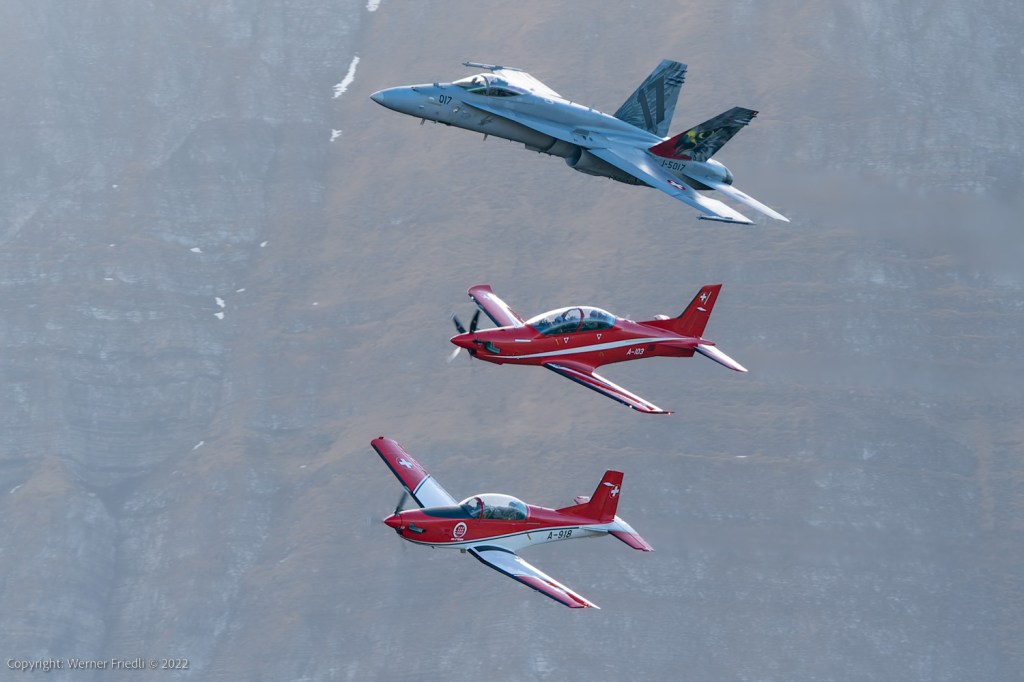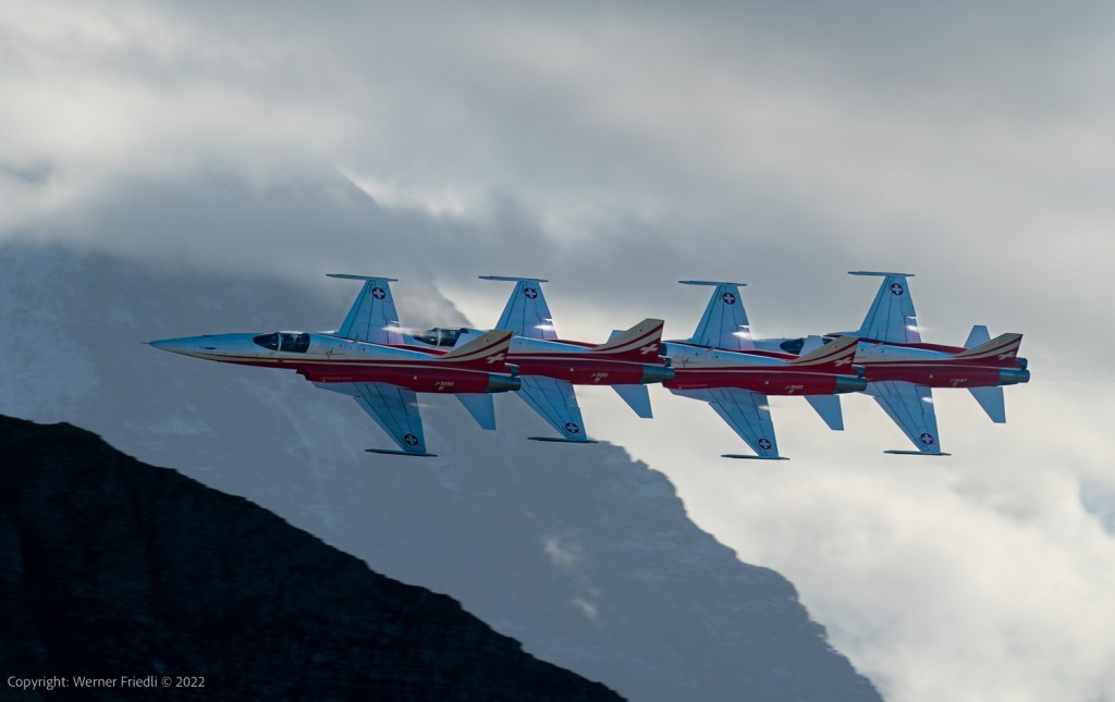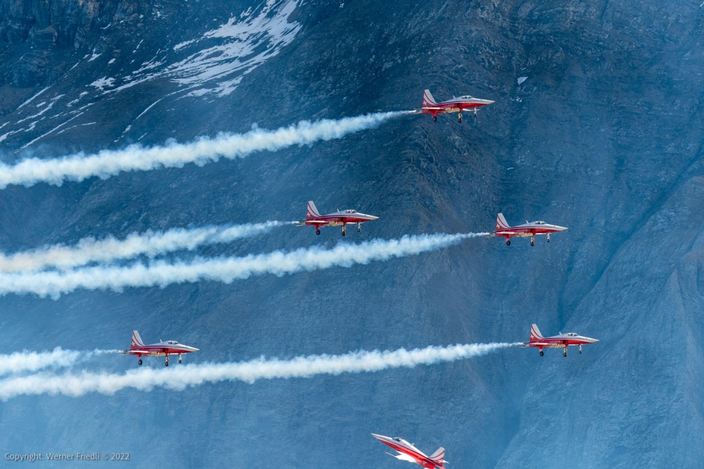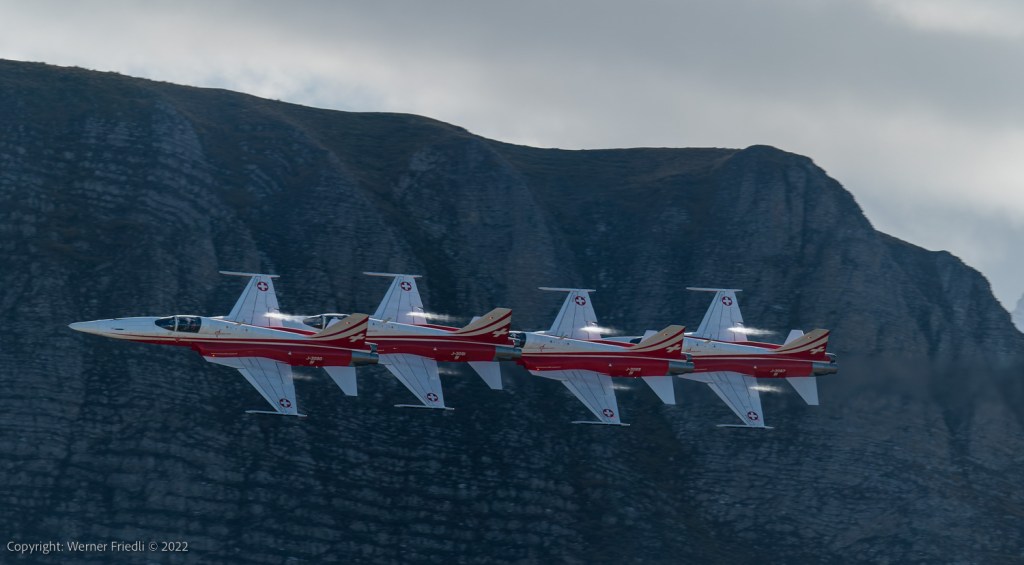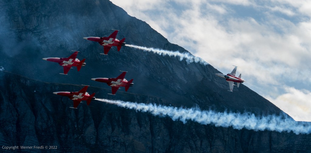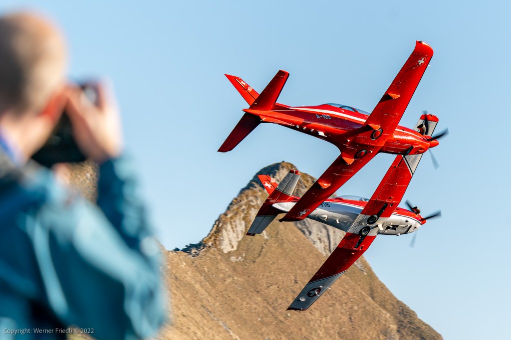 Es war so, als würden diese Maschinen nur für die Fotografen ihre Präsentation fliegen. Als ich erst Mal den Dreh raushatte und mein Tele in Richtung Brienz richtete, sah ich im entscheidenden Moment statt der schnittigen PC-21 nur grau. Ein Fotograf hatte sich vorgedrängt. Was ich dabei dachte behalte ich besser für mich.