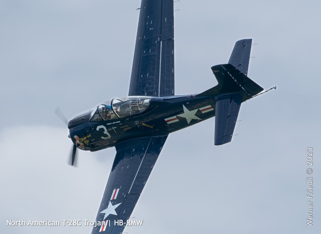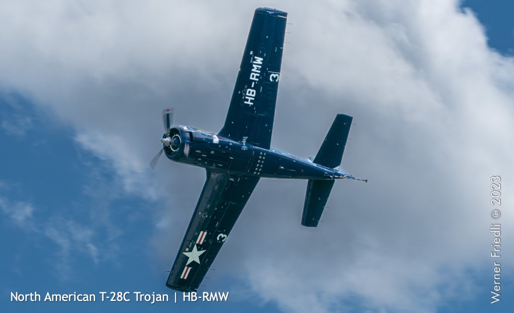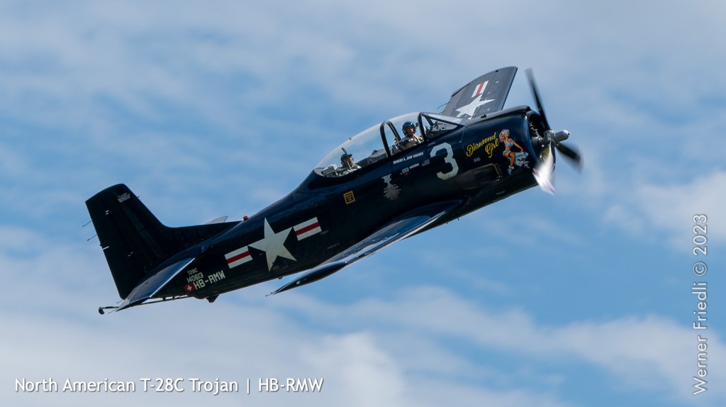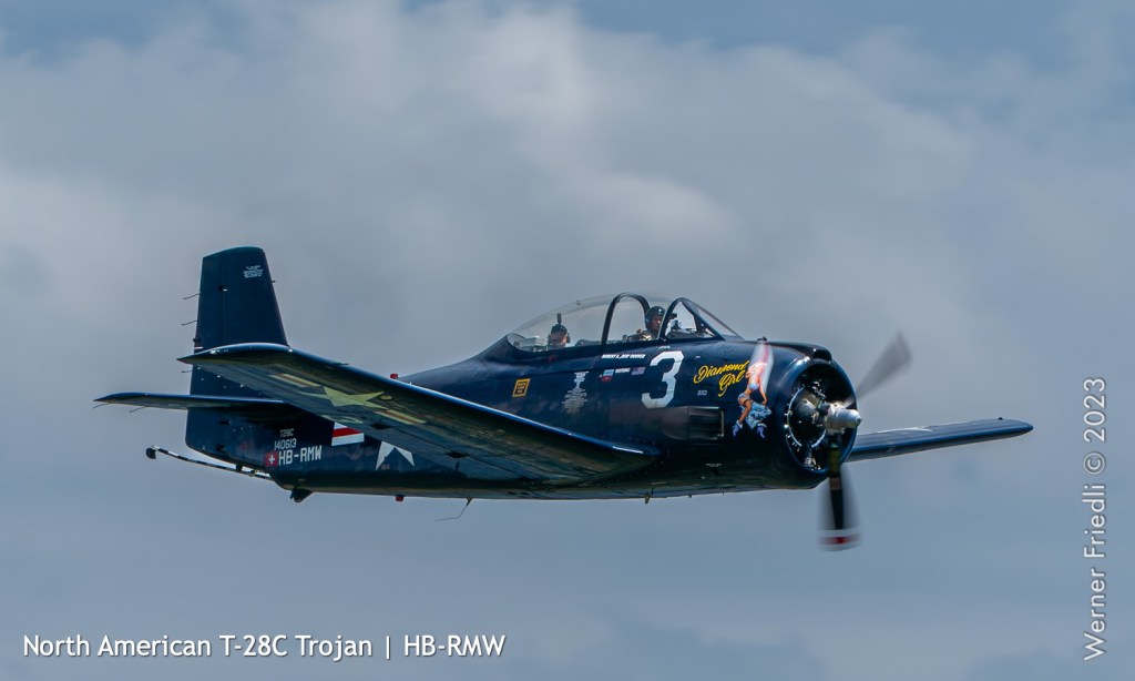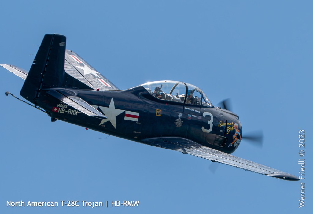 Die North American T-28C Trojan 140613, registriert als HB-RMW, wurde erst kürzlich in Grenchen komplett überholt. Das 1957 gebaute Flugzeug wurde in den letzten Monaten vom Schweizer T-28-Spezialisten Michael Weber in die Luft gebracht. Die ehemalige Maschine der US Navy wurde nach ihrer Militärzeit eingelagert und flog ab den 1980er Jahren in zivilen Händen. Die kanadischen Experten von Victoria Air Maintenance machten die Maschine zunächst wieder flugfähig, und im vergangenen Jahr wurde sie von Aerotech in Grenchen in der Schweiz weiterbearbeitet. Das Flugzeug mit dem Spitznamen Diamond Girl ist mit seinem schönen Anstrich ein wahrer Hingucker!