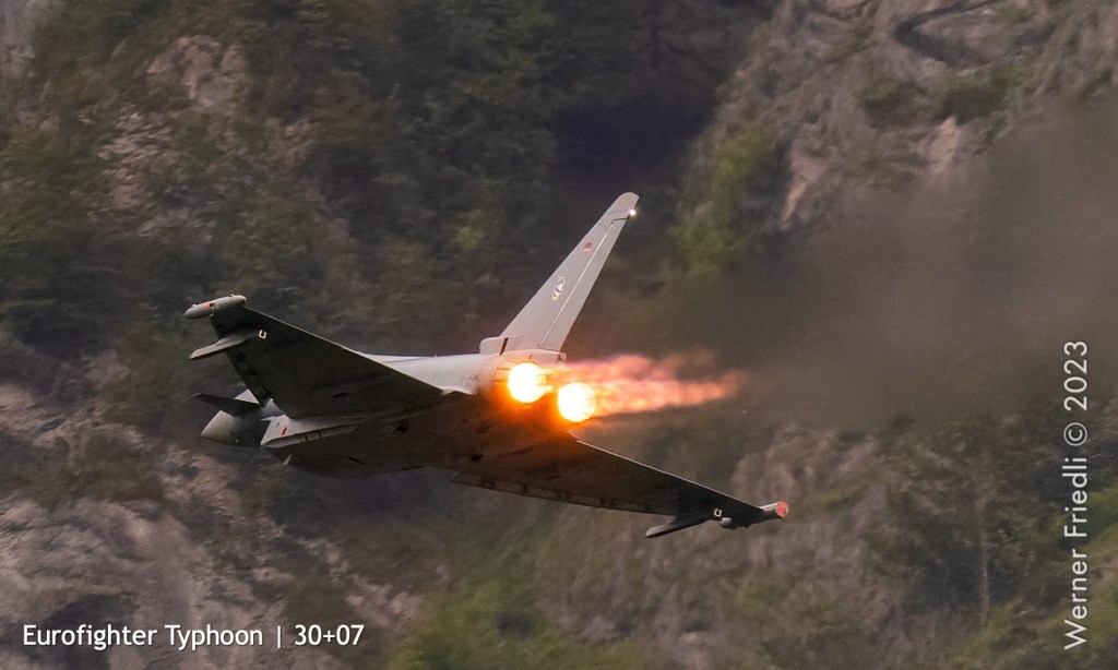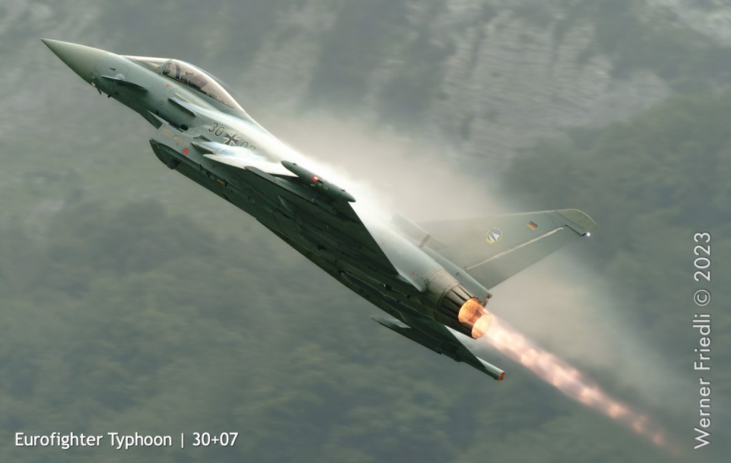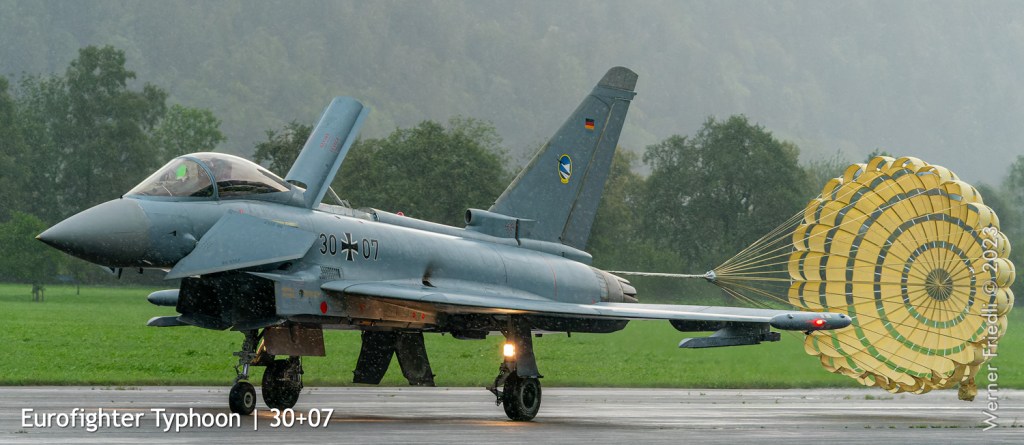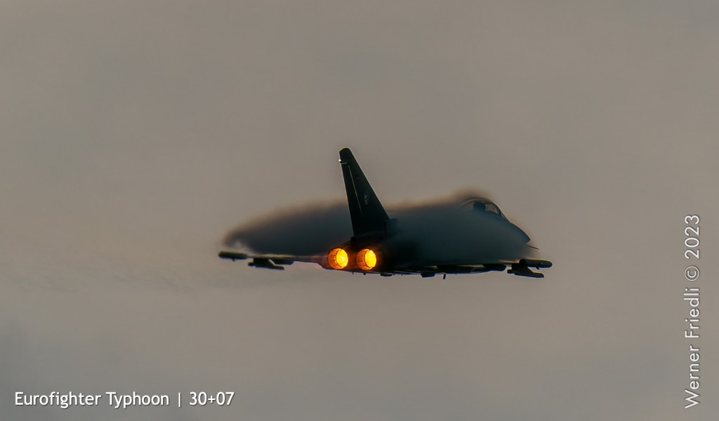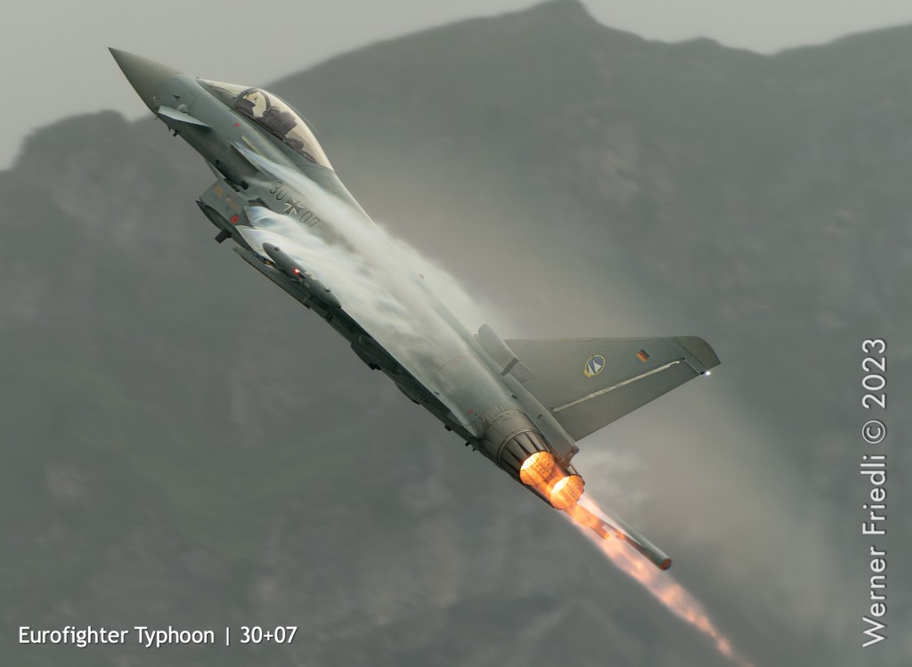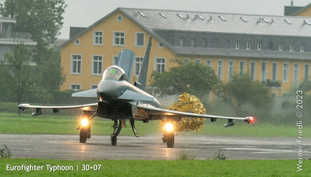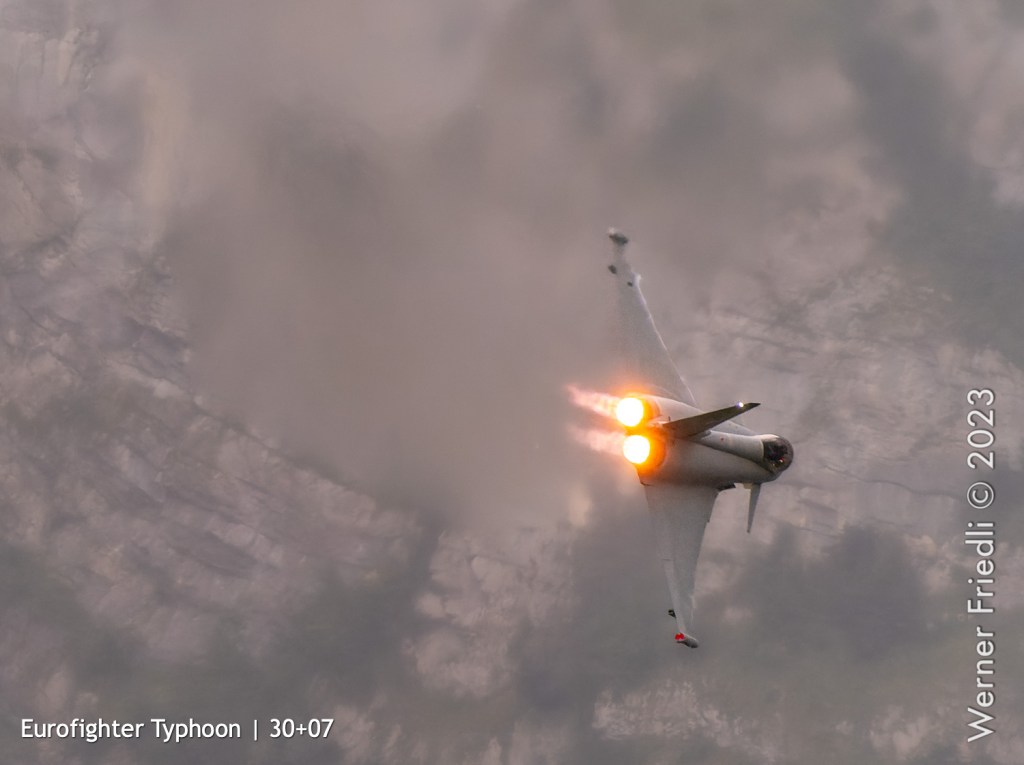 Wie es so ist im Leben eines Fotograf’s, verpasste ich den besten Moment dieses Zigermeets, weil ich nicht bereit war, mich in den Regen zu stürzen. Erst als der Eurofighter um 14:04 Uhr mit vollem Nachbrenner sehr tief der Piste entlang beschleunigte und beim Pistenende in die Höhe zog, war ich wieder bei der Sache.