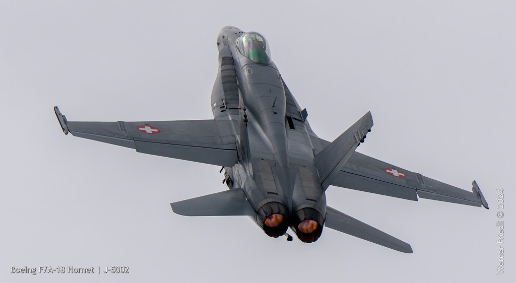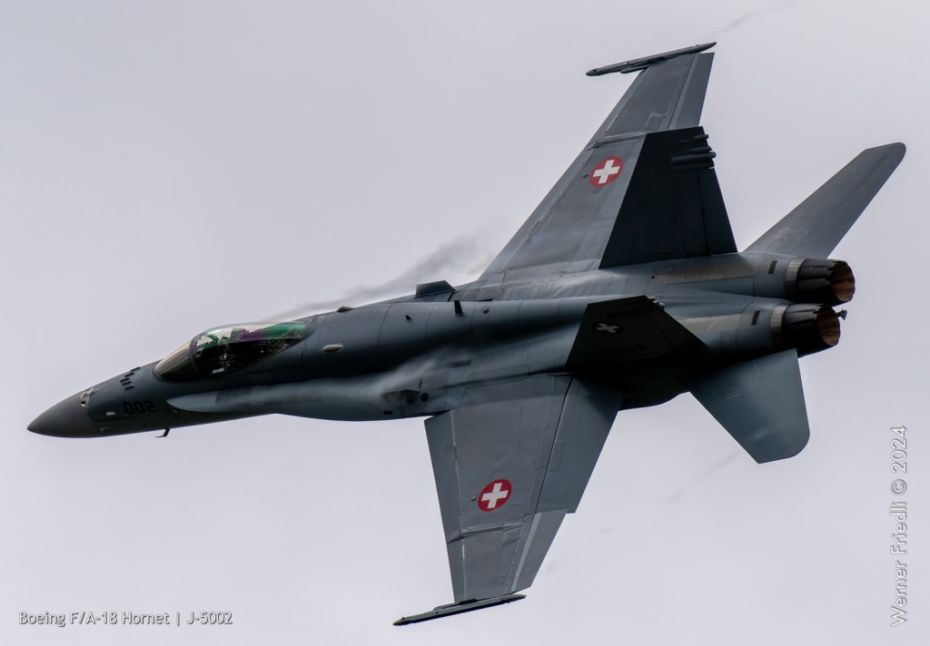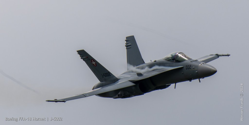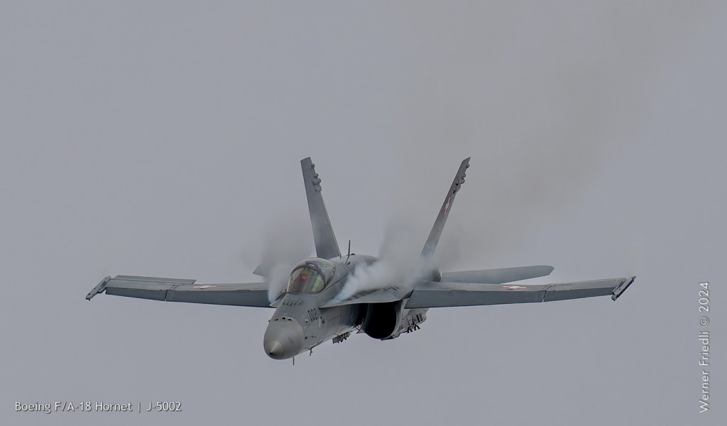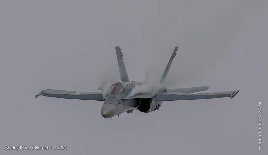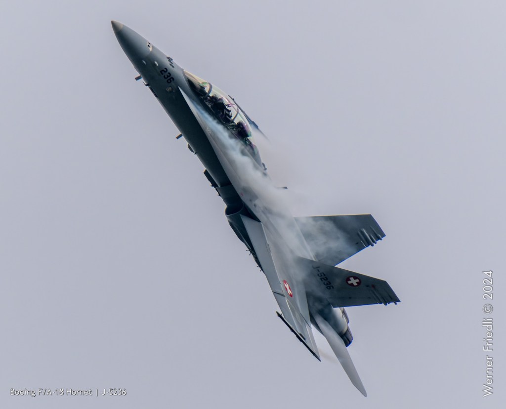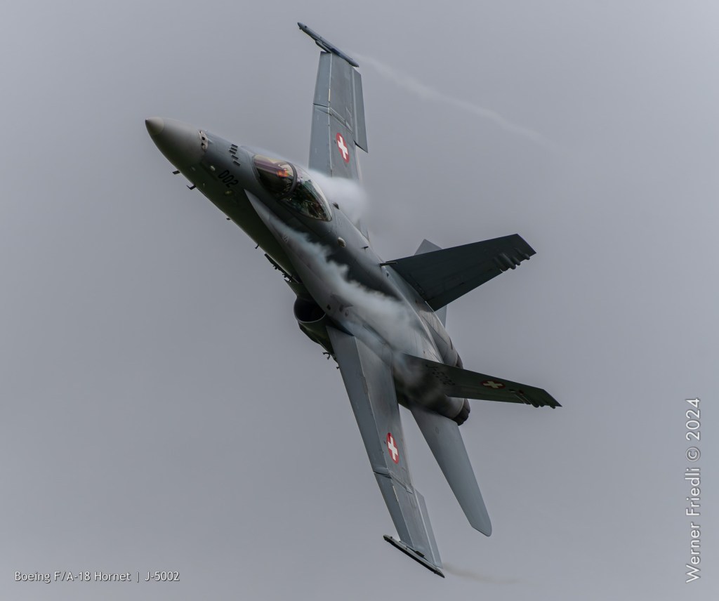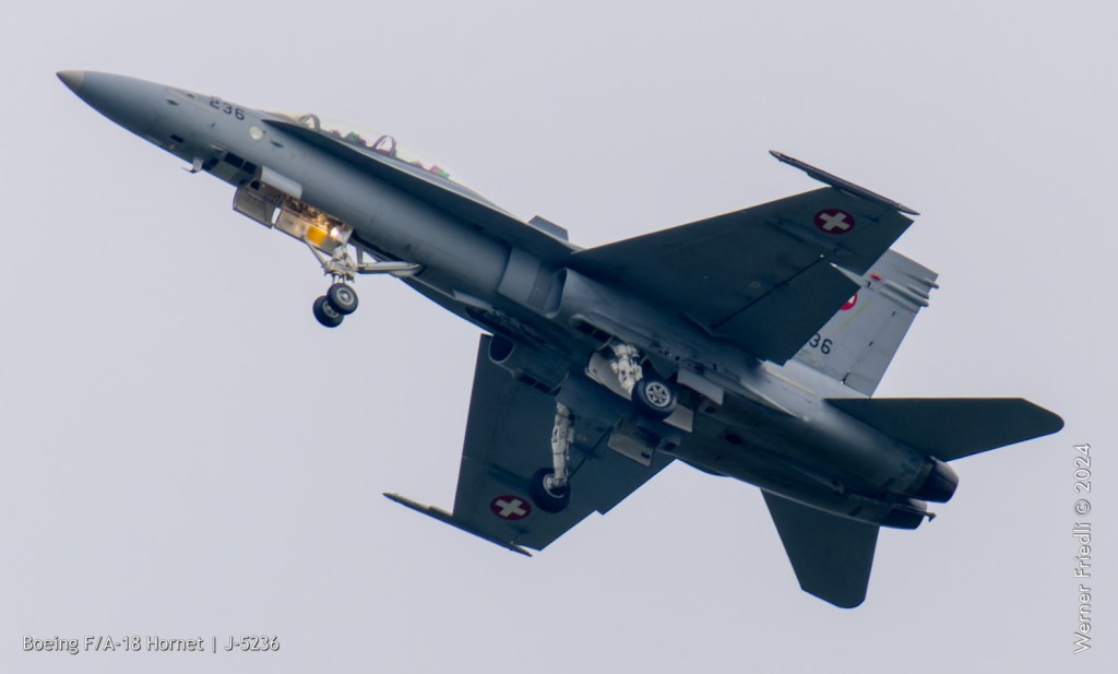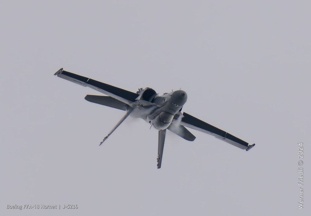 Am 19. April 2024 trainierte der neue Display Pilot Marcel „Frodo“ Rust des F/A-18 Hornet Display Teams in Payerne auf einer Mindesthöhe von 150 Metern. Das Wetter war zum Fotografieren schwierig, eine graue Wolkendecke und dadurch diffuses Licht zusammen mit dem grauen Sichtschutzanstrich der Hornet versprachen keine guten Bilder.