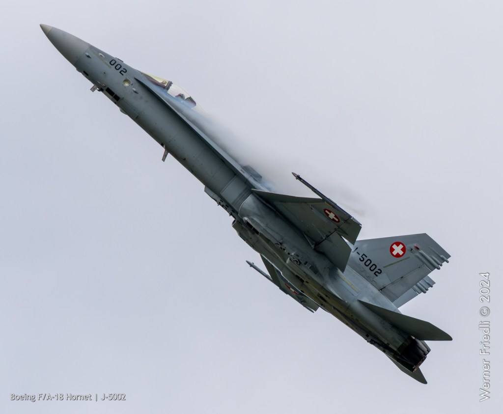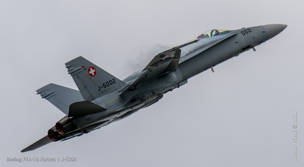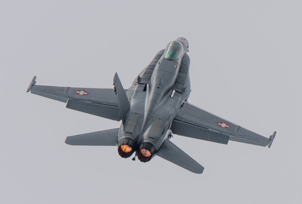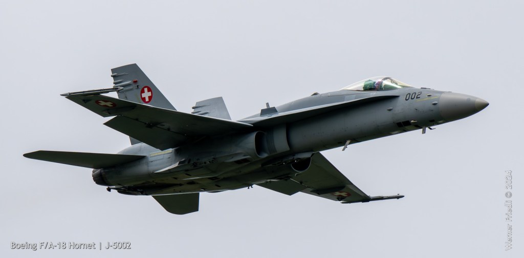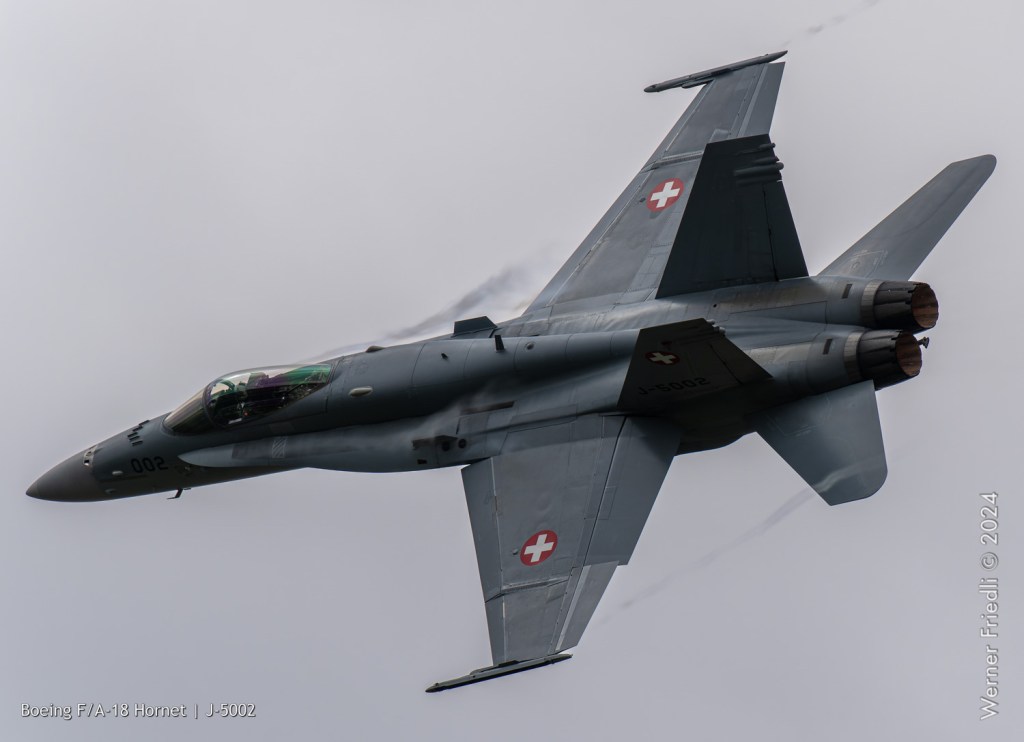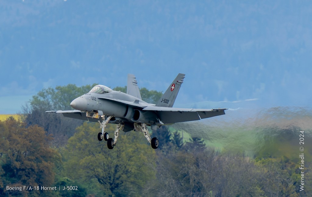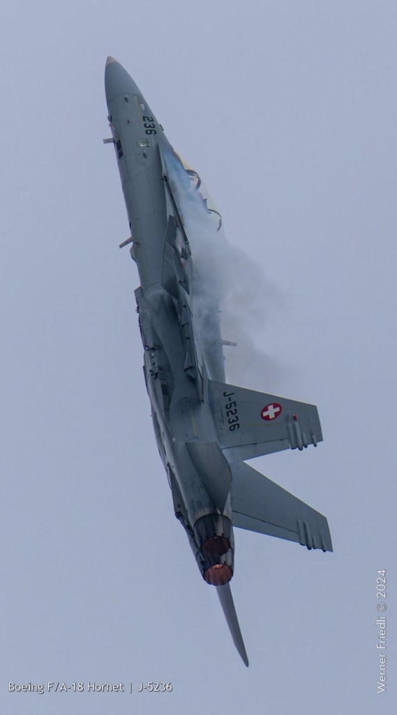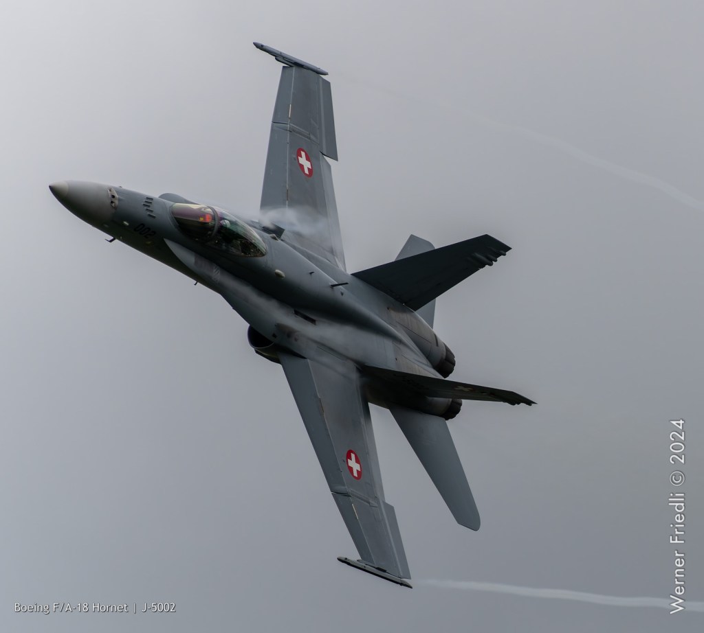 Am 19. April 2024 trainierte der neue Display Pilot Marcel „Frodo“ Rust des F/A-18 Hornet Display Teams in Payerne auf einer Mindesthöhe von 150 Metern. Das Wetter war zum Fotografieren schwierig, eine graue Wolkendecke und dadurch diffuses Licht zusammen mit dem grauen Sichtschutzanstrich der Hornet versprachen keine guten Bilder.