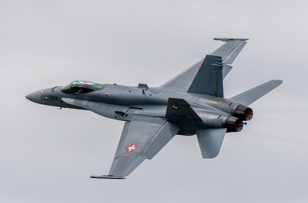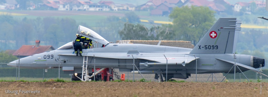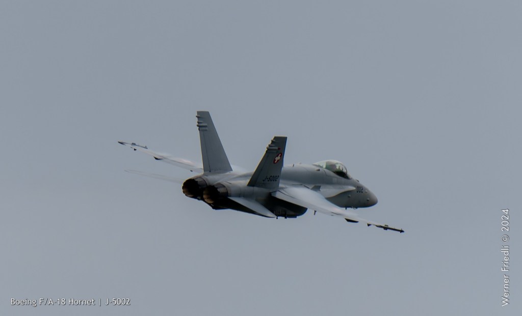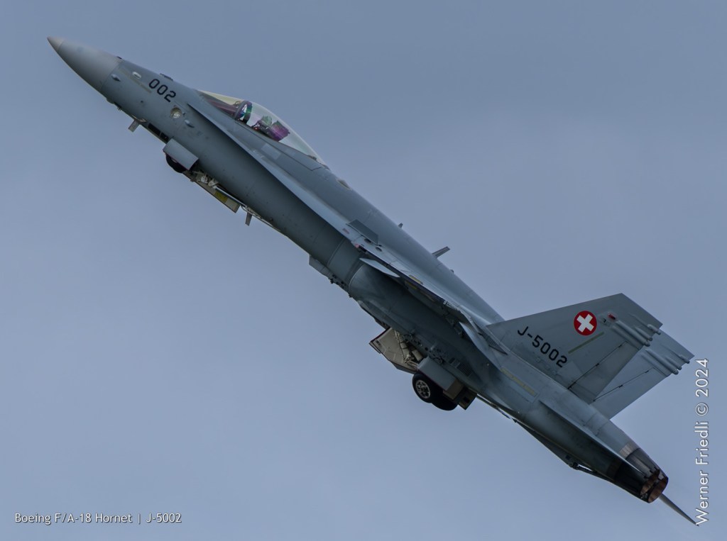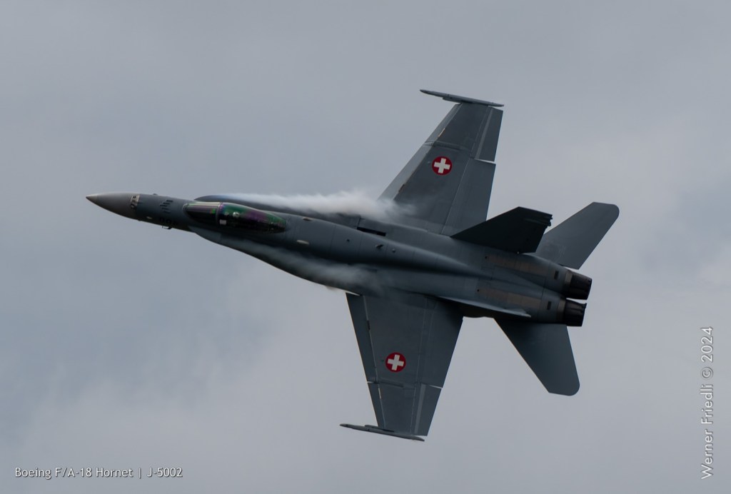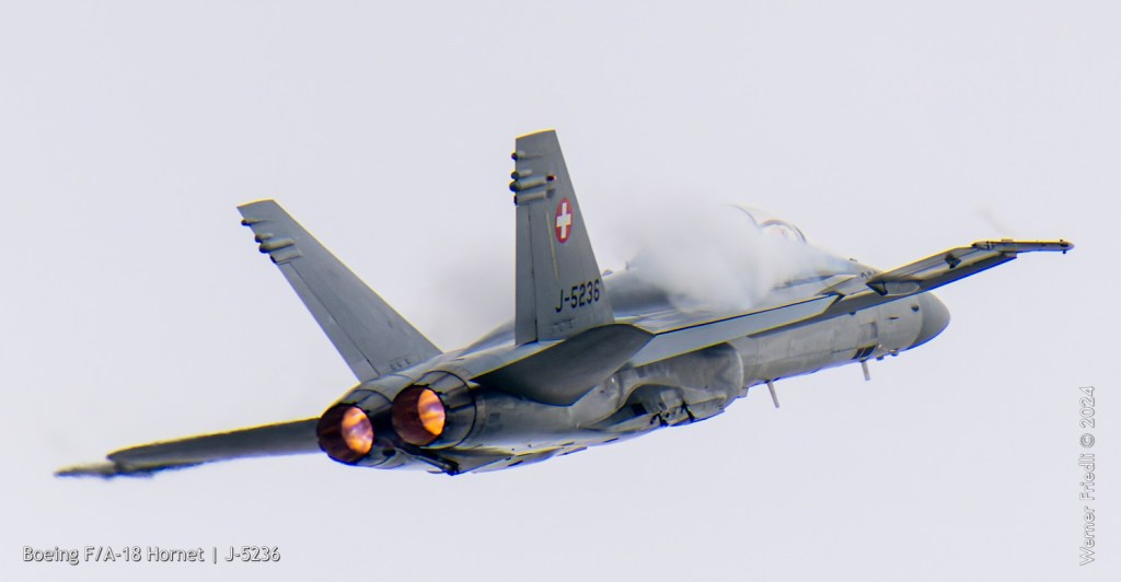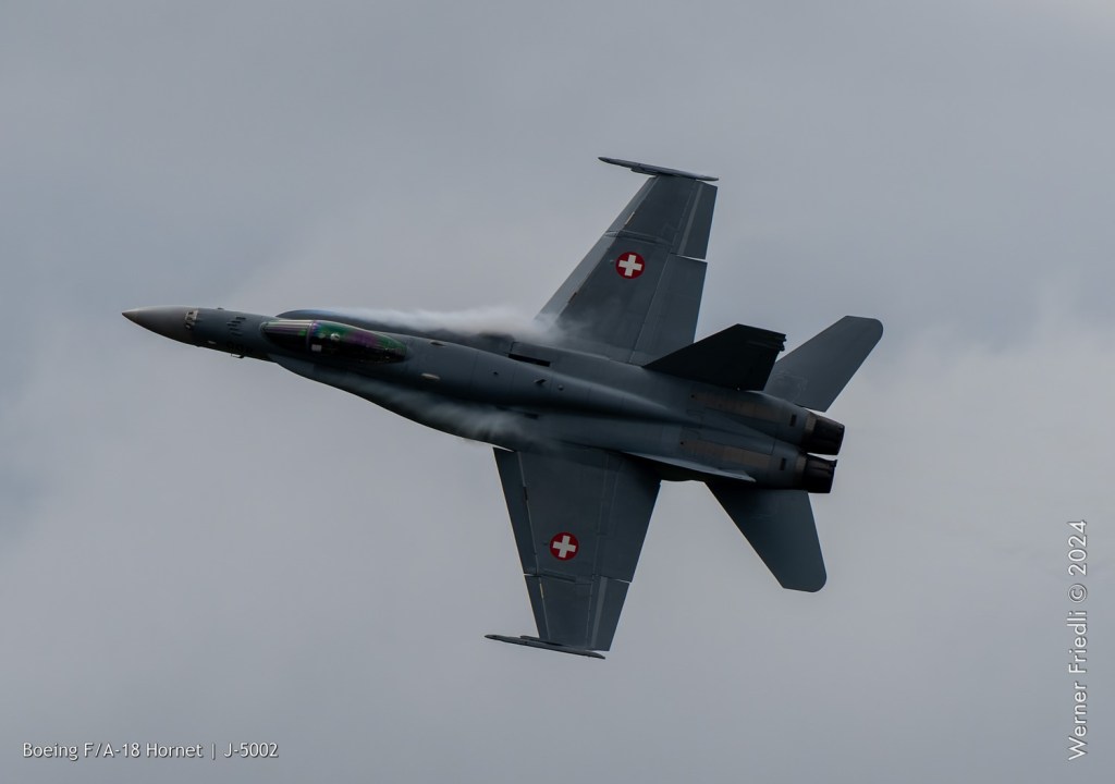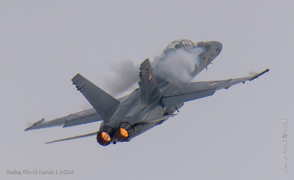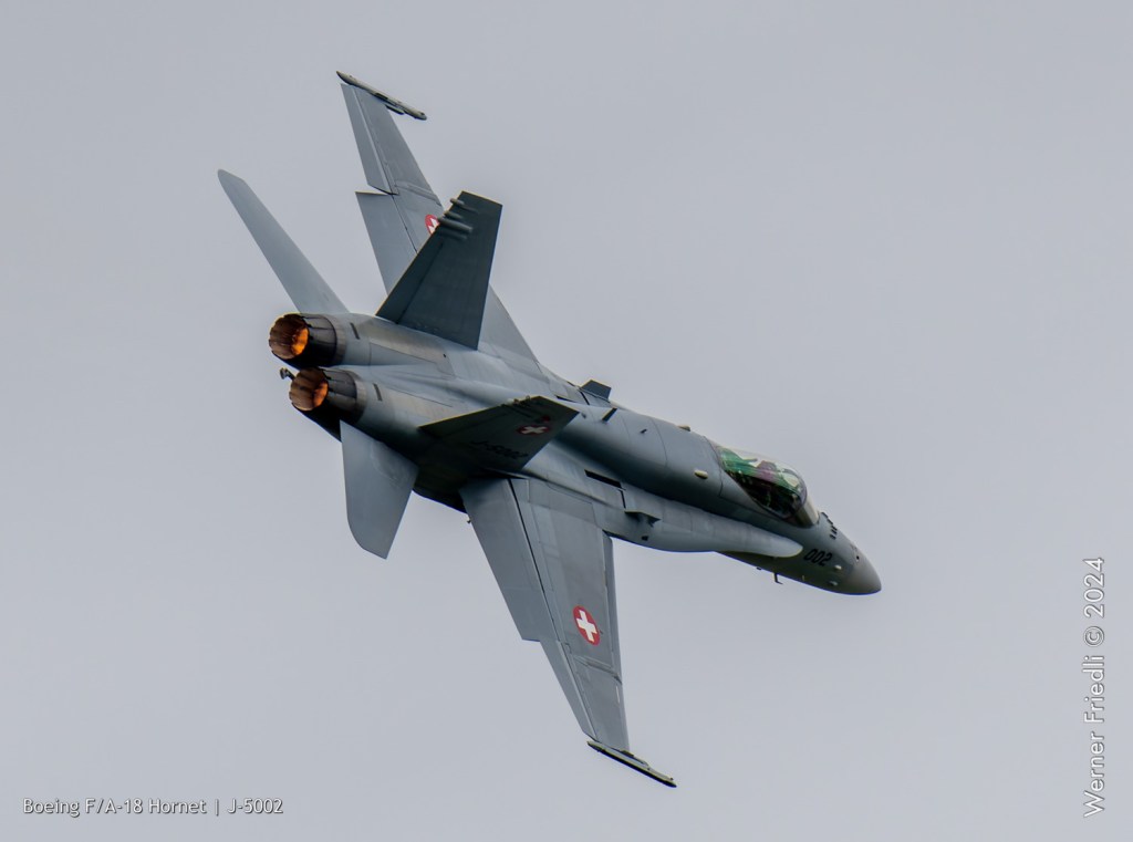 Am 19. April 2024 trainierte der neue Display Pilot Marcel „Frodo“ Rust des F/A-18 Hornet Display Teams in Payerne auf einer Mindesthöhe von 150 Metern. Das Wetter war zum Fotografieren schwierig, eine graue Wolkendecke und dadurch diffuses Licht zusammen mit dem grauen Sichtschutzanstrich der Hornet versprachen keine guten Bilder.