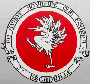 Der weisse Greyerzer Vogel auf rotem Grund umgeben mit der schwarzen Aufschrift auf weissem Grund: En Avant, Advienne Que Pourra. 2ème Escadrille. Das Staffelemblem der Fliegerstaffel 2, welche von 1925 bis 1994 existierte. Der Leitspruch der Staffel war: Vorwärts, komme was wolle.
