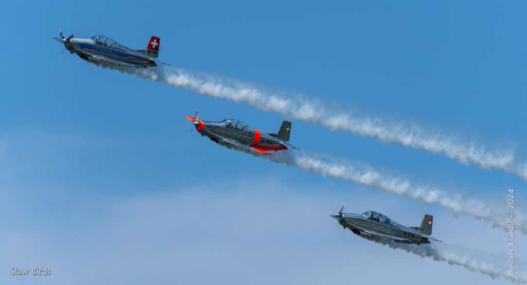 Sehr speziell sind die drei Pilatus P3, die sich neu zur Formation „Slow Birds“ formiert haben. Es wurden Erinnerungen an die P3 Flyers aus Ambri wach.