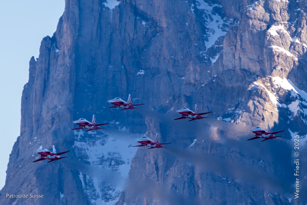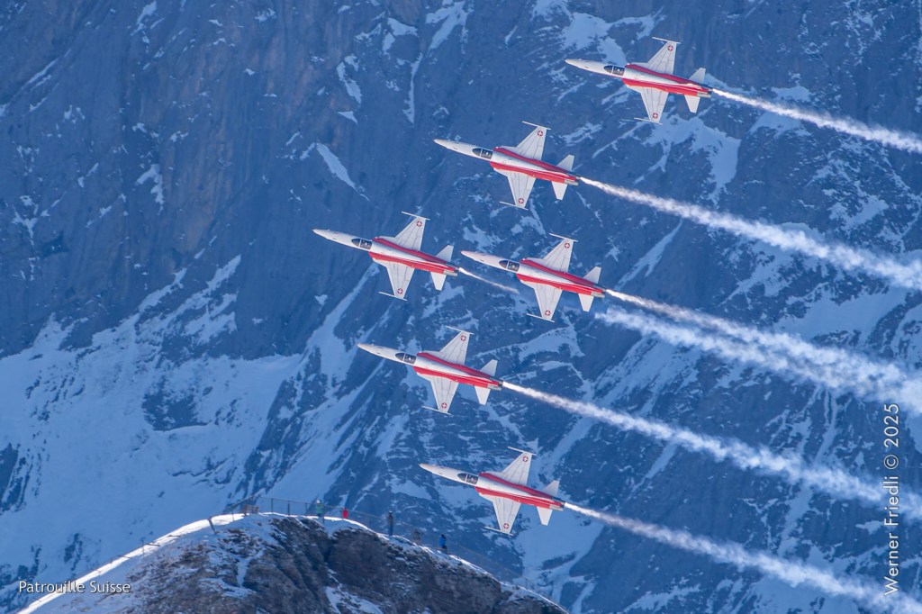 In der schönen Gondel, die mich auf den Gipfel des Männlichen brachte, konnte ich die englischen Kommentare geniessen, so ähnlich wie früher beim Cabaret Rotstift. «What a beautiful morning in the mountains». Oben angekommen traf ich bei der Panorama-Terrasse auch ein paar Gleichgesinnte und verbrachte unbeschwerte Stunden. Die Patrouille Suisse sieht man sehr gut vom Männlichen aus, allerdings sind die Distanzen zu den Flugzeugen meist beträchtlich. Es gelingen vor allem gute Fotos unter Einbezug der schönen Bergwelt als Hintergrund.