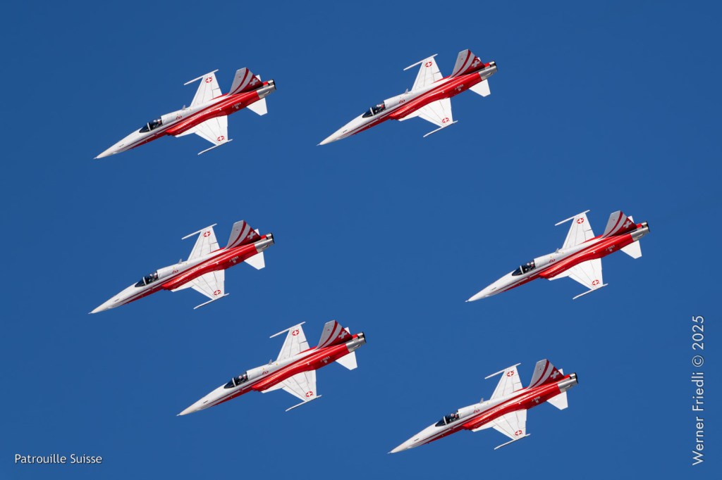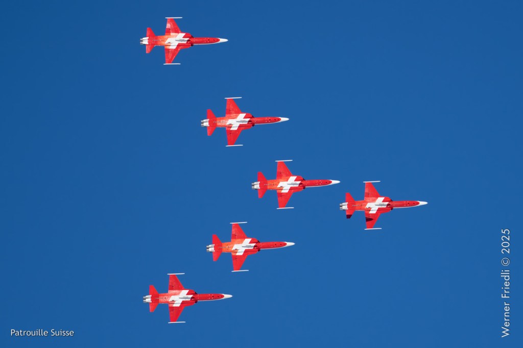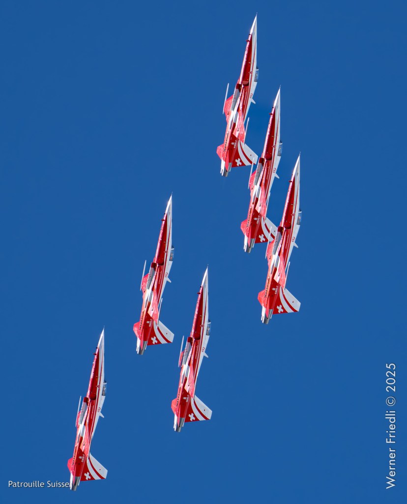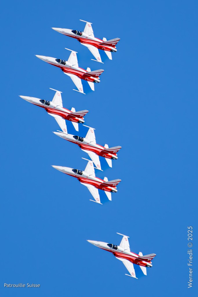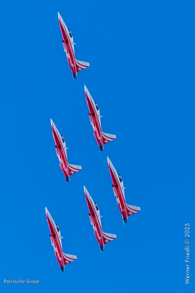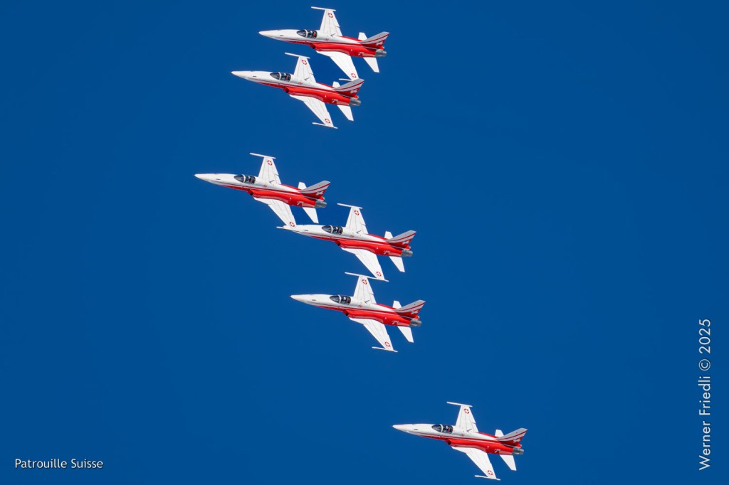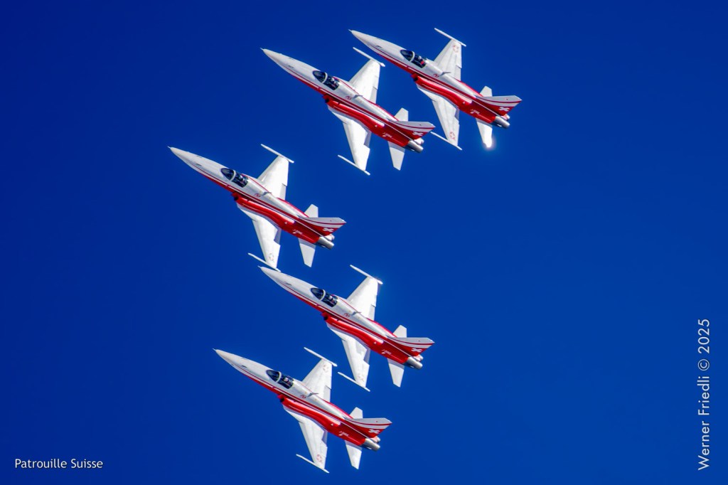 Die Bilder, die ich von diesem Ort aus machen konnte, waren von einer besseren Qualität. Weil sich die Vorführachse der Patrouille Suisse fast die ganze Zeit im Norden befand und der Abstand moderat war, entstanden schöne Bilder, wobei die Farben schon sehr plakativ gerieten. Die Höhe, das Wetter und die klare Luft ohne grosse Wärmeschlieren waren optimale Voraussetzungen.