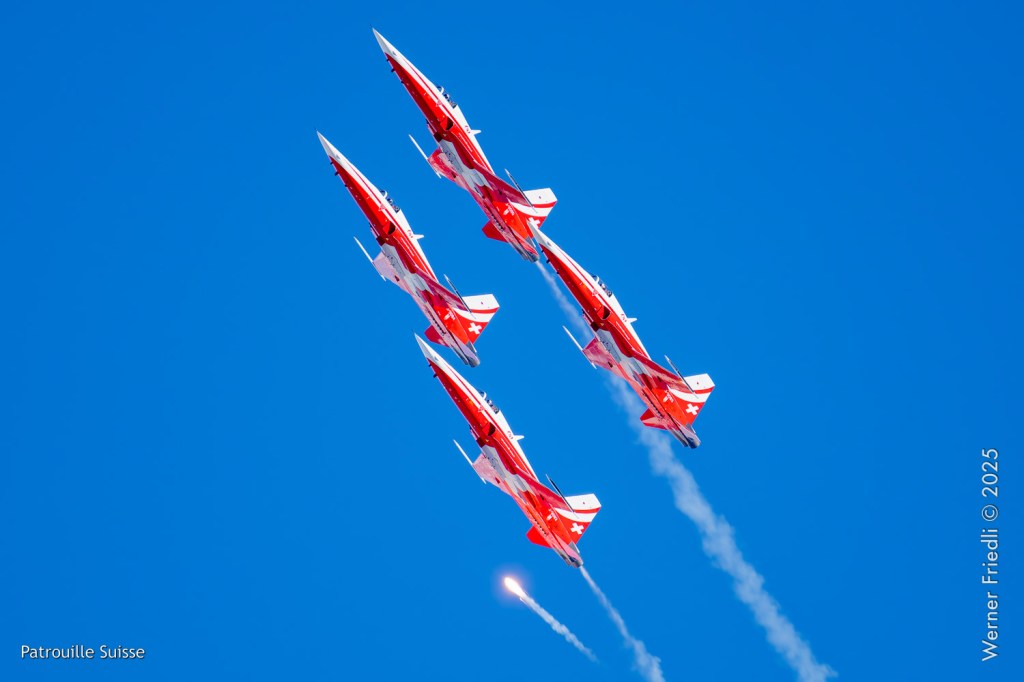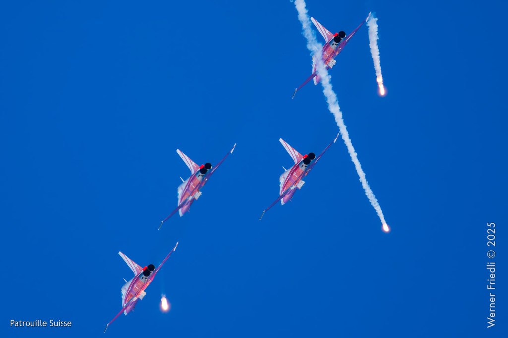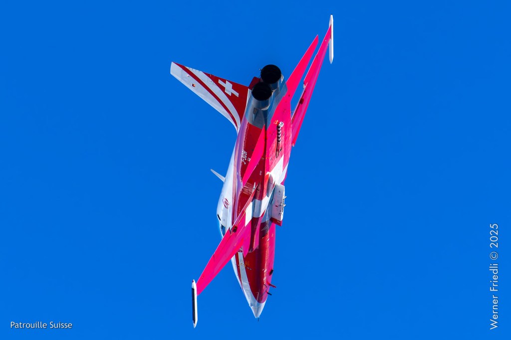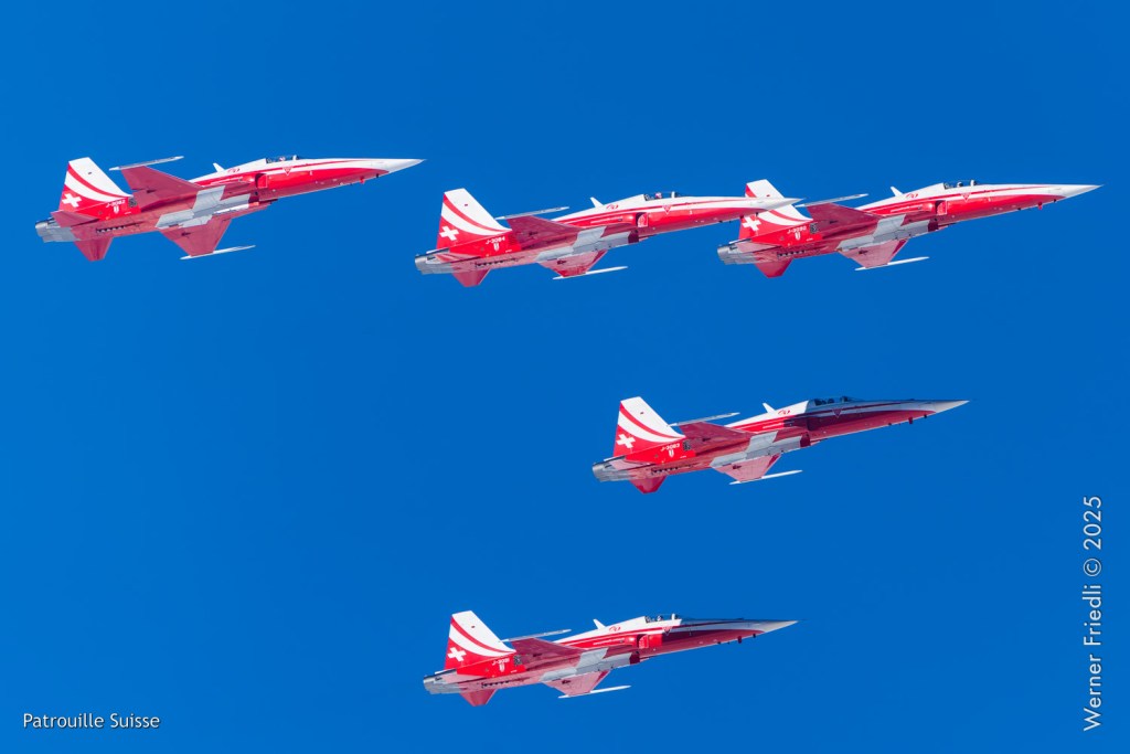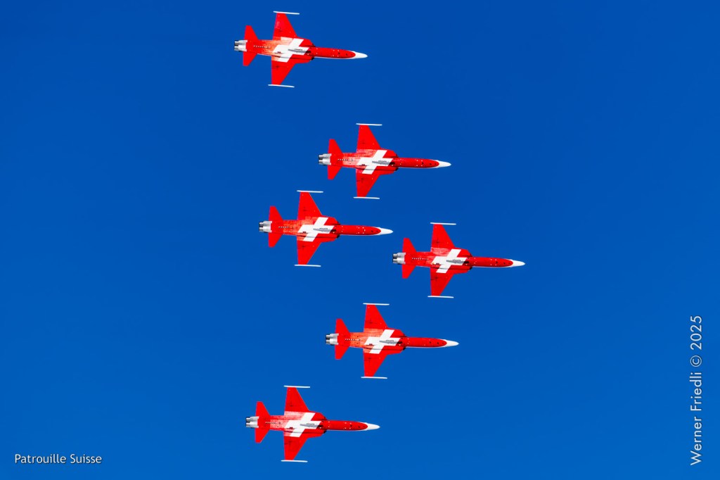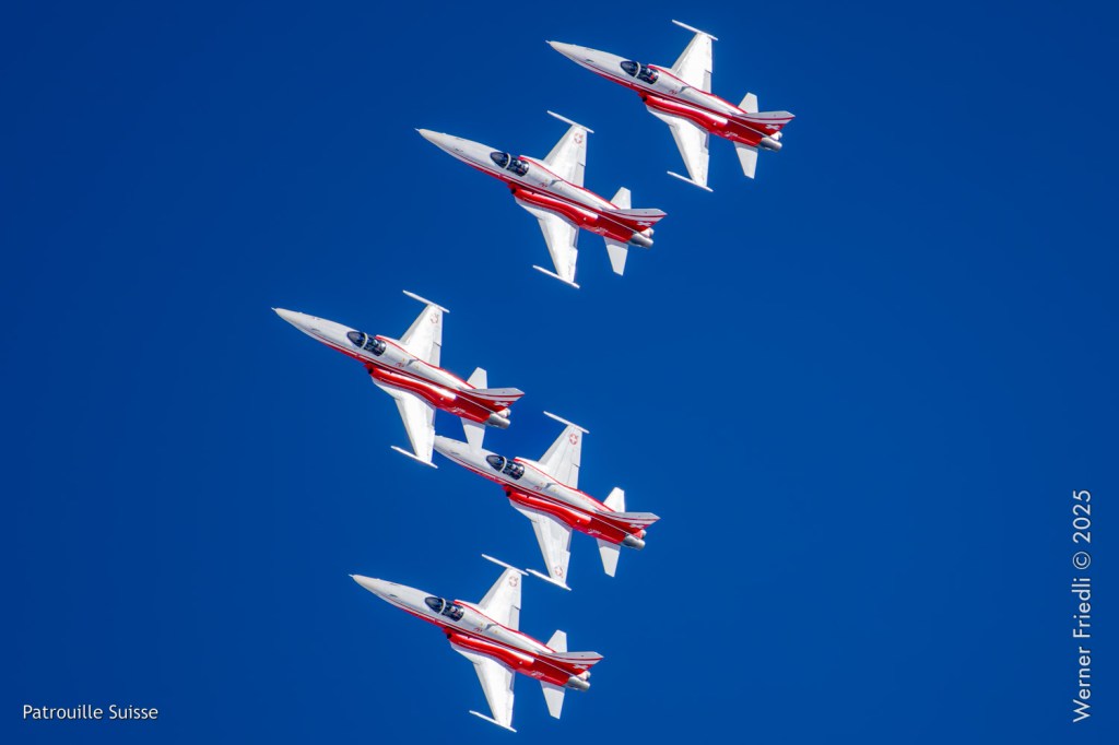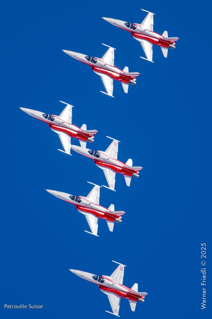 Die Bilder, die ich von diesem Ort aus machen konnte, waren von einer besseren Qualität. Weil sich die Vorführachse der Patrouille Suisse fast die ganze Zeit im Norden befand und der Abstand moderat war, entstanden schöne Bilder, wobei die Farben schon sehr plakativ gerieten. Die Höhe, das Wetter und die klare Luft ohne grosse Wärmeschlieren waren optimale Voraussetzungen.