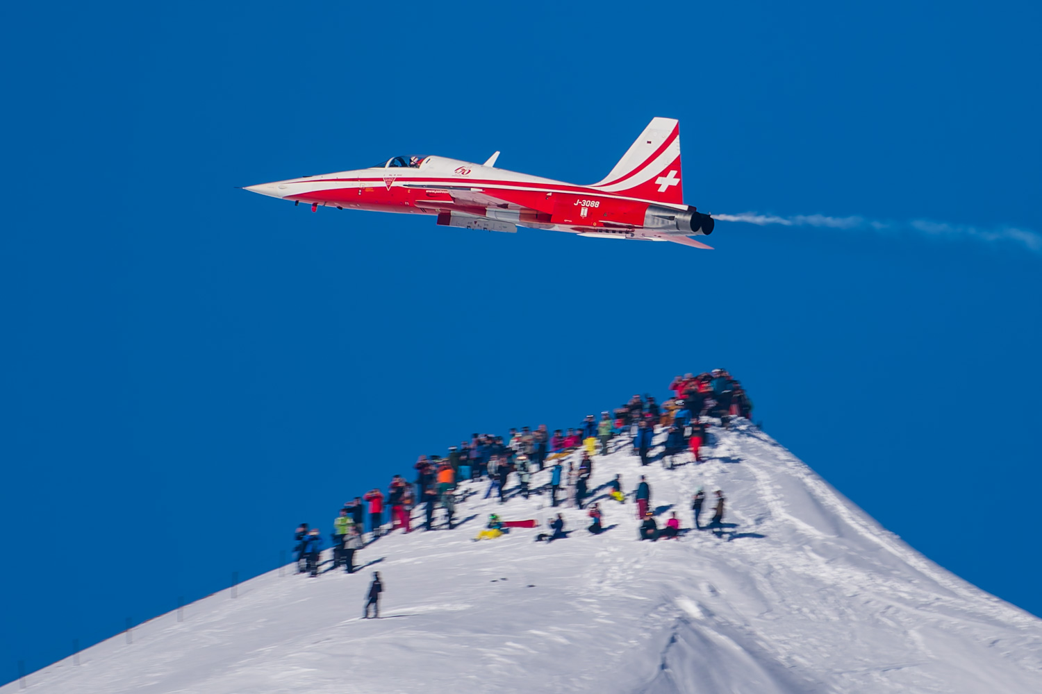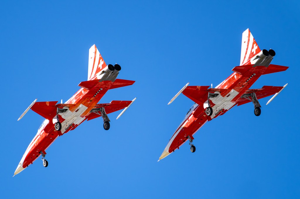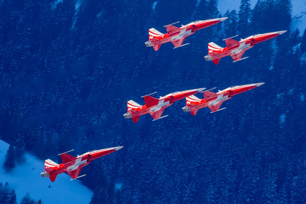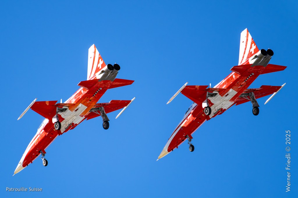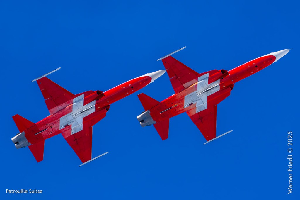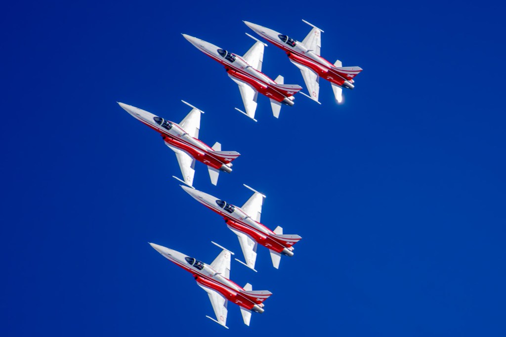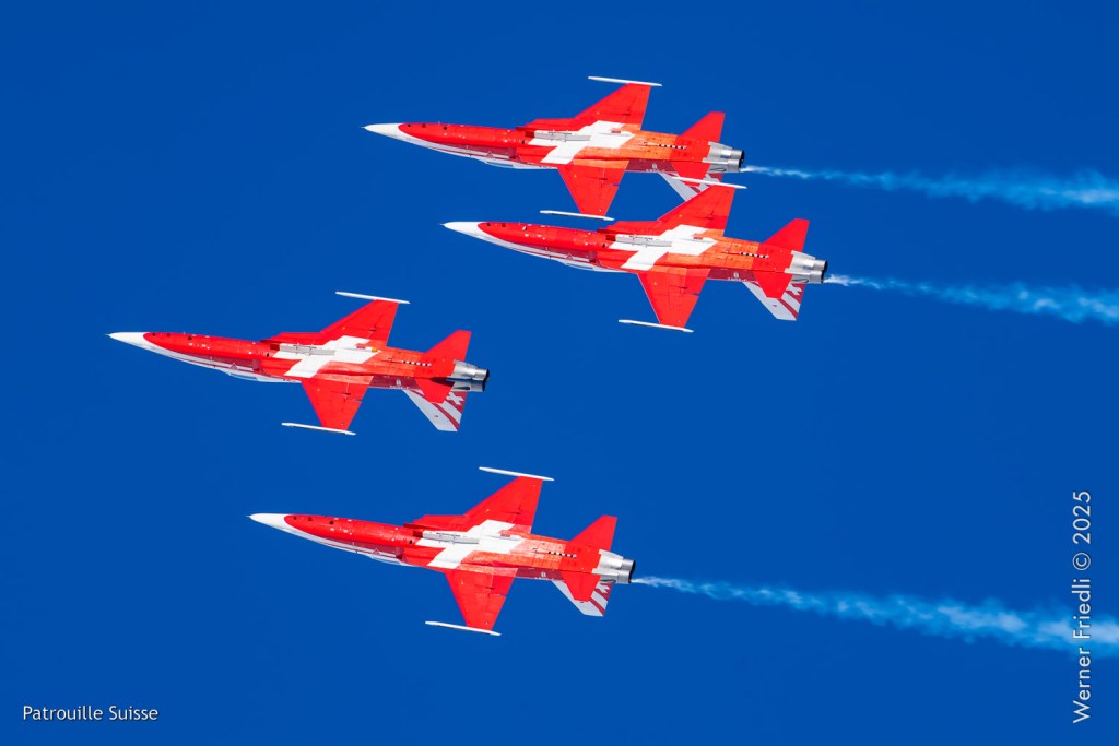 Die Bilder, die ich von diesem Ort aus machen konnte, waren von einer besseren Qualität. Weil sich die Vorführachse der Patrouille Suisse fast die ganze Zeit im Norden befand und der Abstand moderat war, entstanden schöne Bilder, wobei die Farben schon sehr plakativ gerieten. Die Höhe, das Wetter und die klare Luft ohne grosse Wärmeschlieren waren optimale Voraussetzungen.