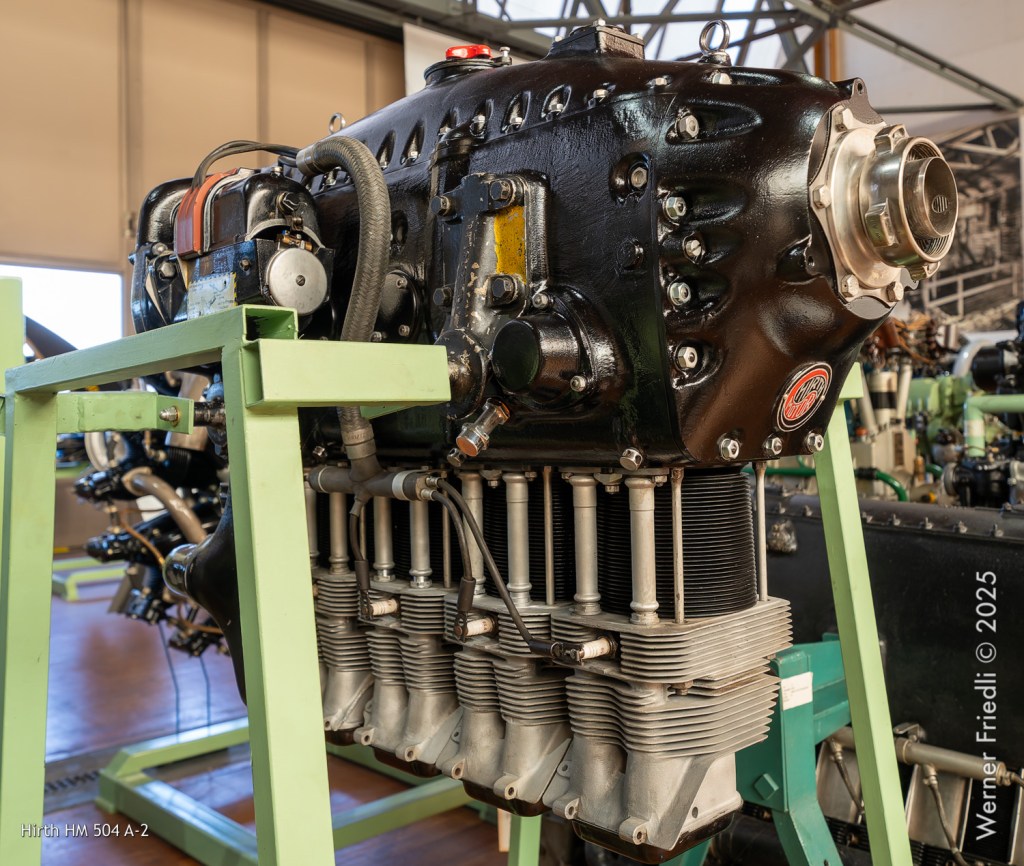 Der HM 504 ist ein luftgekühlter Vierzylinder-Viertakt-Einreihenmotor mit hängend angeordneten Zylindern, ausgestattet mit Frischöl-Trockensumpfschmierung und einer Ölrückförderpumpe. Die Zylinder sind aus Grauguss mit Leichtmetallköpfen gefertigt und über Zuganker am Kurbelgehäuse verbunden, das auch als Ölbehälter dient. Jeder Zylinder hat je ein Ein- und Auslassventil, die über Kipphebel und eine rollengelagerte Nockenwelle gesteuert werden. Die Kolben sind aus Y-Leichtmetall, die Pleuel aus Chromnickelstahl mit H-förmigem Querschnitt. Die Kurbelwelle ist geteilt und läuft auf mehreren Lagern, während die Zündung von einem Bosch-Magnetzünder mit elektrischer Zündpunktverstellung erfolgt, wobei pro Zylinder zwei Zündkerzen eingesetzt werden.