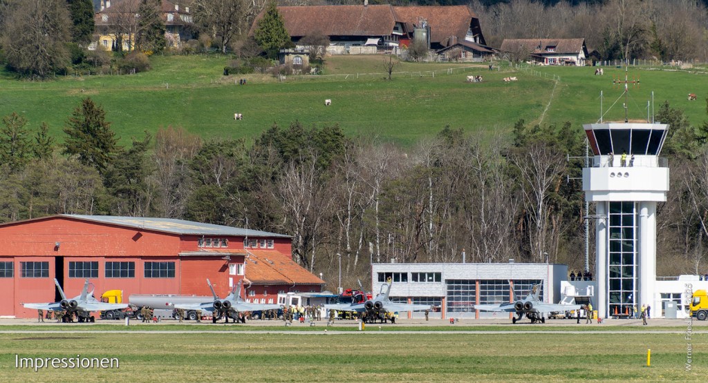 Insgesamt besuchten am Montagnachmittag 4 F/A-18 Hornet (Doppelpatrouille) das Belpmoos. Aufgrund des Designs der Helme der Piloten und des Abflugortes Meiringen gehe ich davon aus, dass es Maschinen der Staffel 11 „Tigers“ waren. Die Maschinen wurden für die Abfertigung beim Tower abgestellt. Bis zum Start wartete ich nicht mehr.