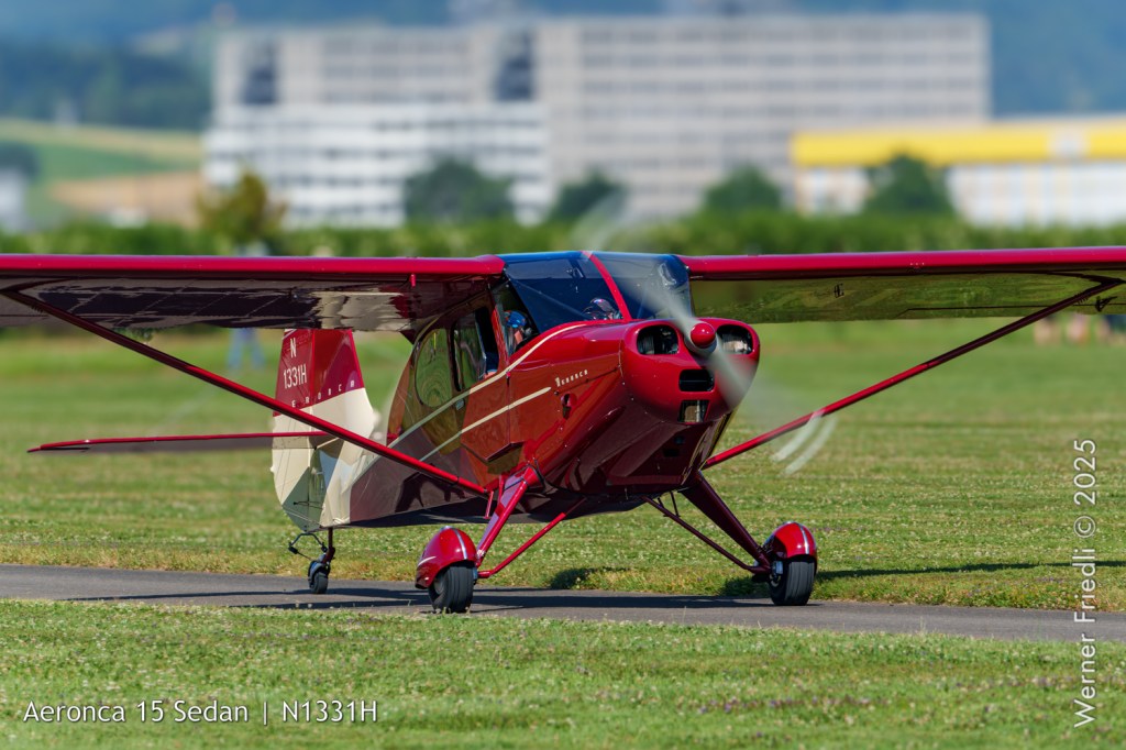 Die Aeronca 15AC Sedan mit der Seriennummer 15AC-371 (N1331H) wurde am 8. April 1949 erbaut. Im September 1981 wurde die Sedan bei einem Startunfall schwer beschädigt. Erst im Jahre 2005 und nach diversen Besitzerwechseln wurde der Restaurierungsprozess in der Schweiz begonnen. Es handelt sich um ein viersitziges Leichtflugzeug mit festem konventionellem Fahrwerk, das zwischen 1948 und 1951 von Aeronca Aircraft hergestellt wurde. Wie bei anderen Aeronca-Konstruktionen sind auch bei der Sedan der Rumpf und das Leitwerk aus geschweißten Metallrohren gefertigt. Das Fahrwerk der Sedan ist konventionell angeordnet, mit einem Hauptfahrwerk aus Stahlrohr und einem lenkbaren Spornrad. Angetrieben wird die Sedan von einem Continental O-300-A Motor mit 145 PS (108 kW).