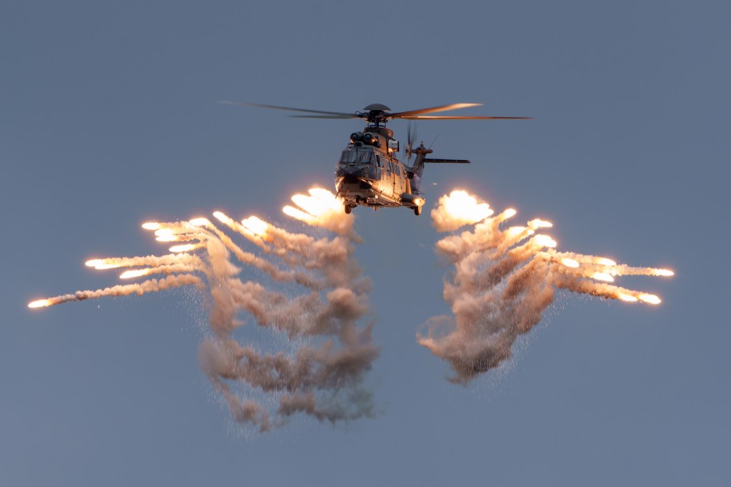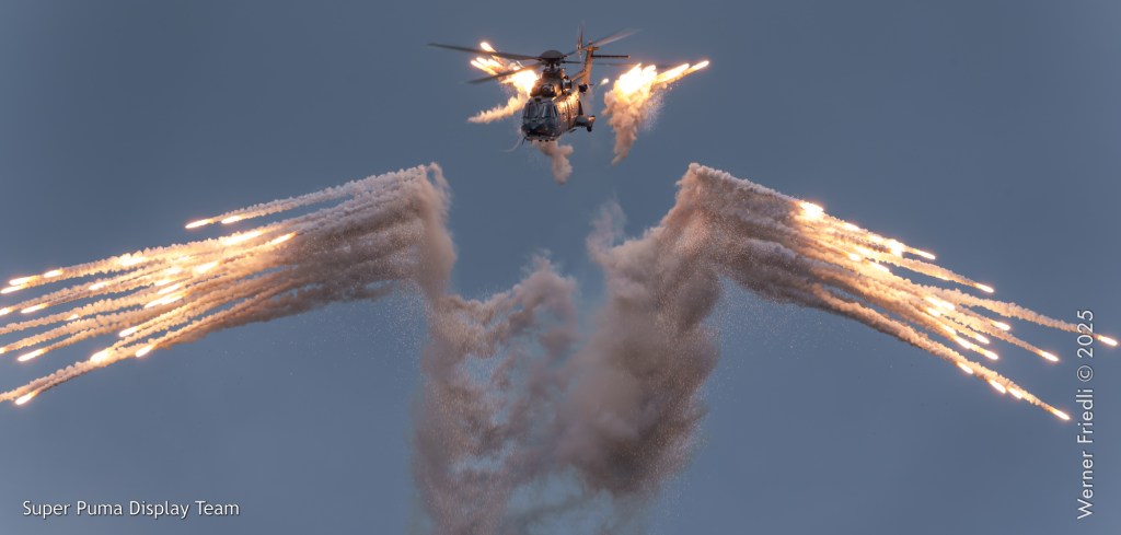 Zu speziellen Anlässen werden auch Wärmetäuschkörper, sogenannte «Flares» ausgestossen. Für das Publikum ist dieser Effekt eine willkommene Abwechslung. Für Fotografen sind diese Hitzefackeln eine grossartige Aufwertung der Bilder.